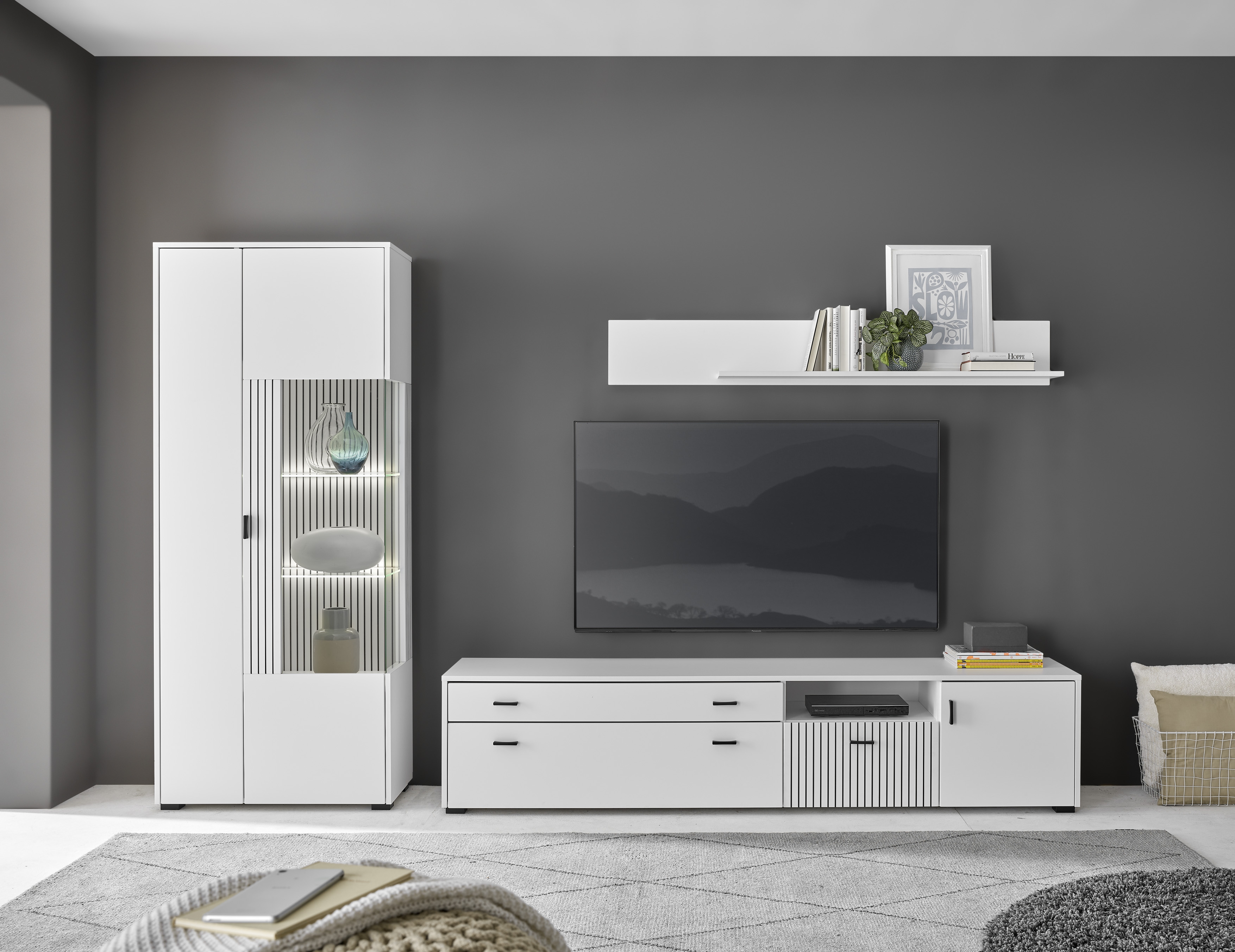 1 banc TV avec 2 portes, 1 abattant, 1 tiroir et un casier pour l’équipement