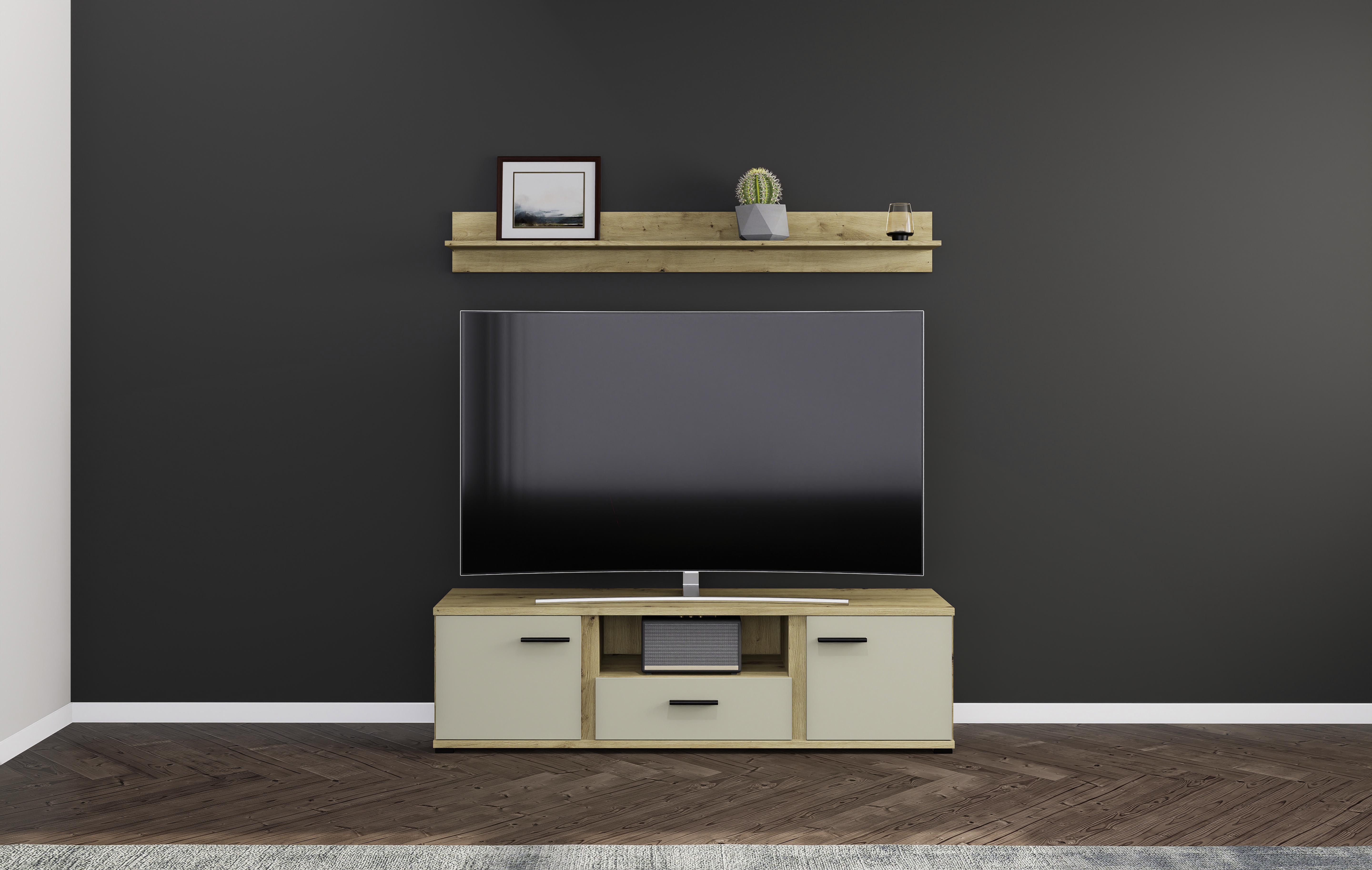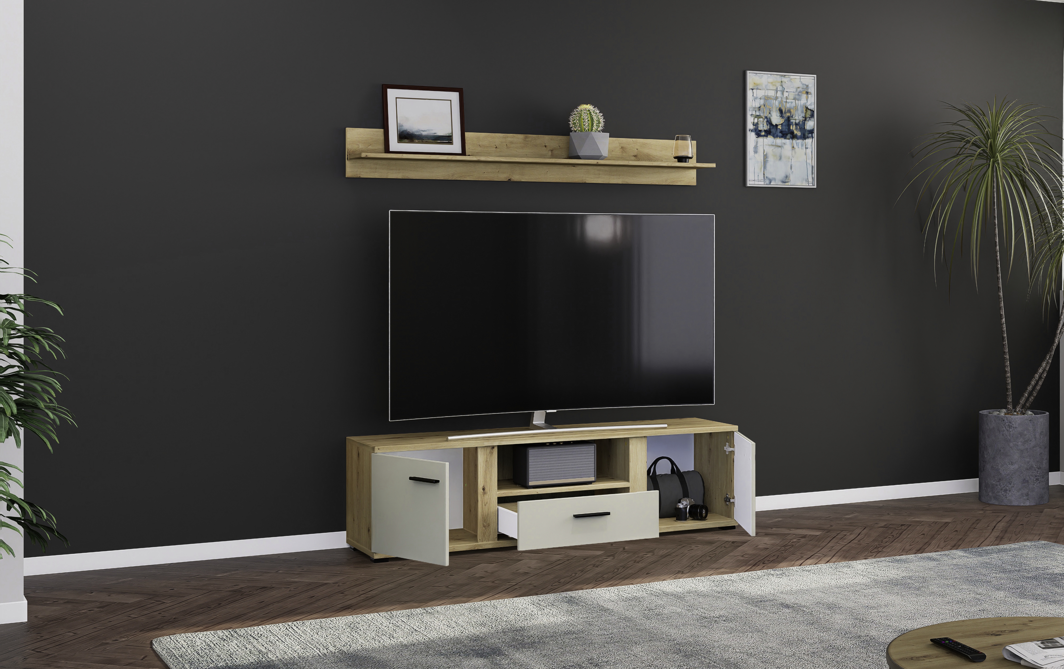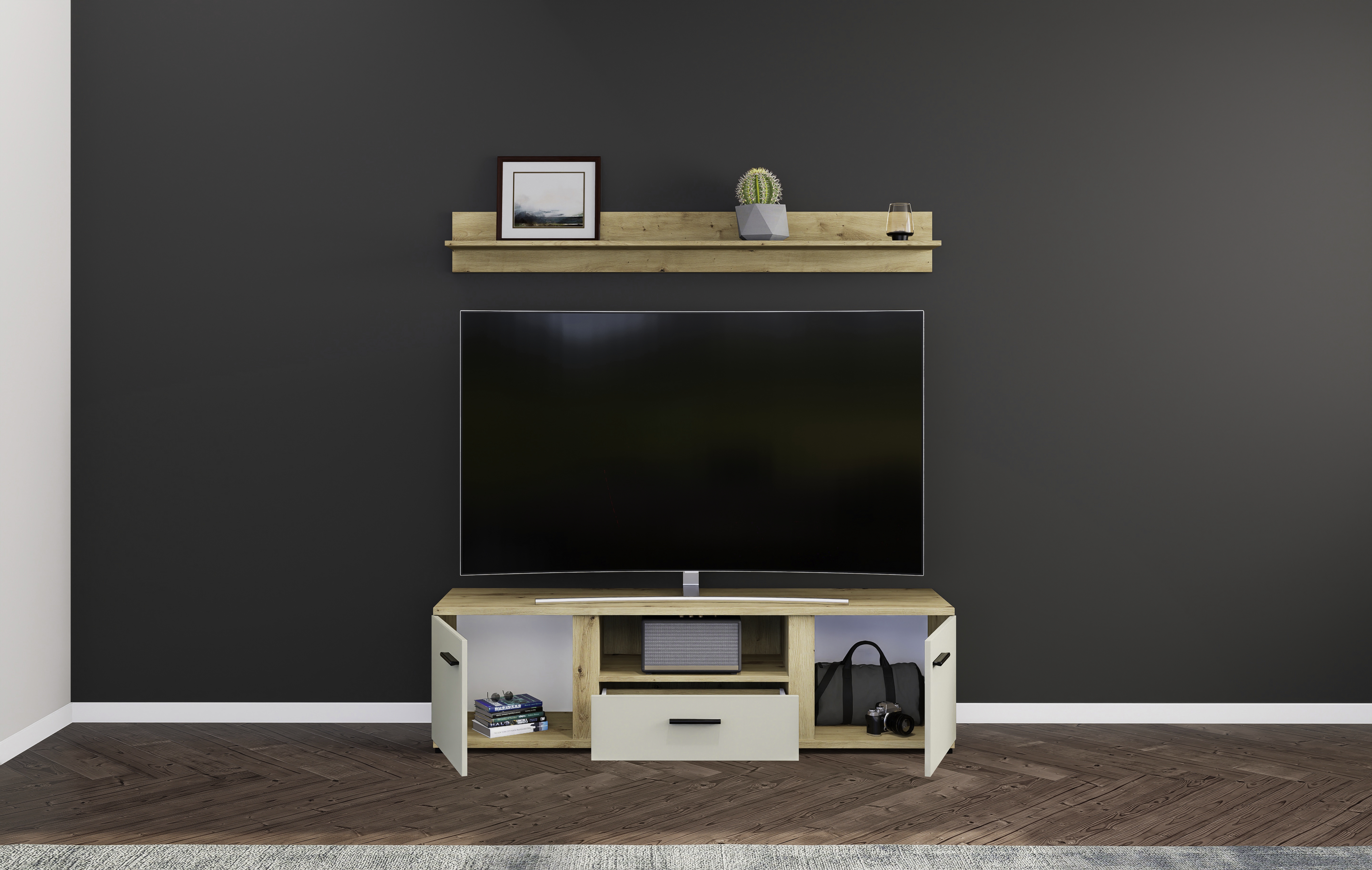 1 banc TV avec 2 portes, 1 tiroir avec coulisses inférieures, 1 casier ouvert et 1 passe-câble