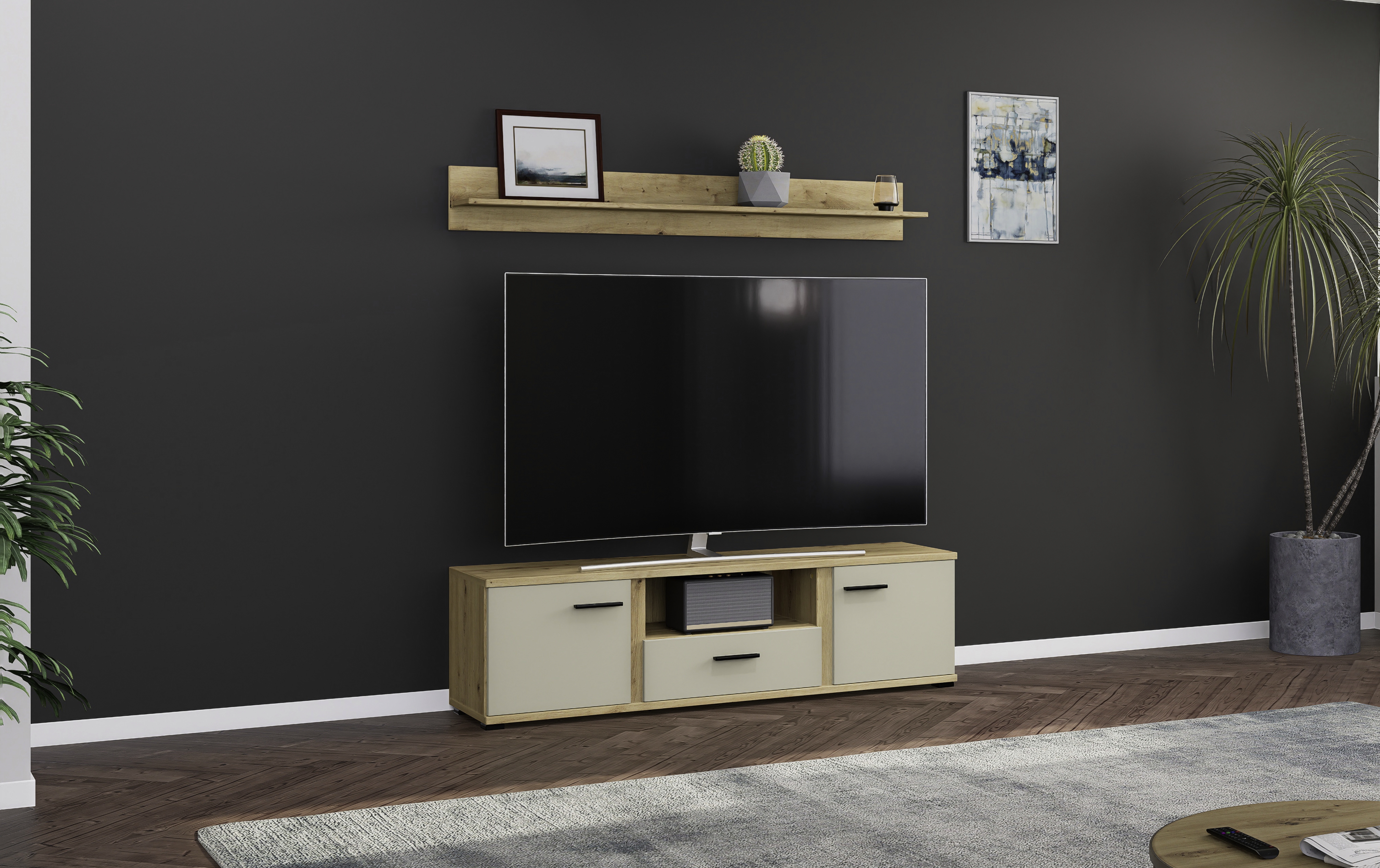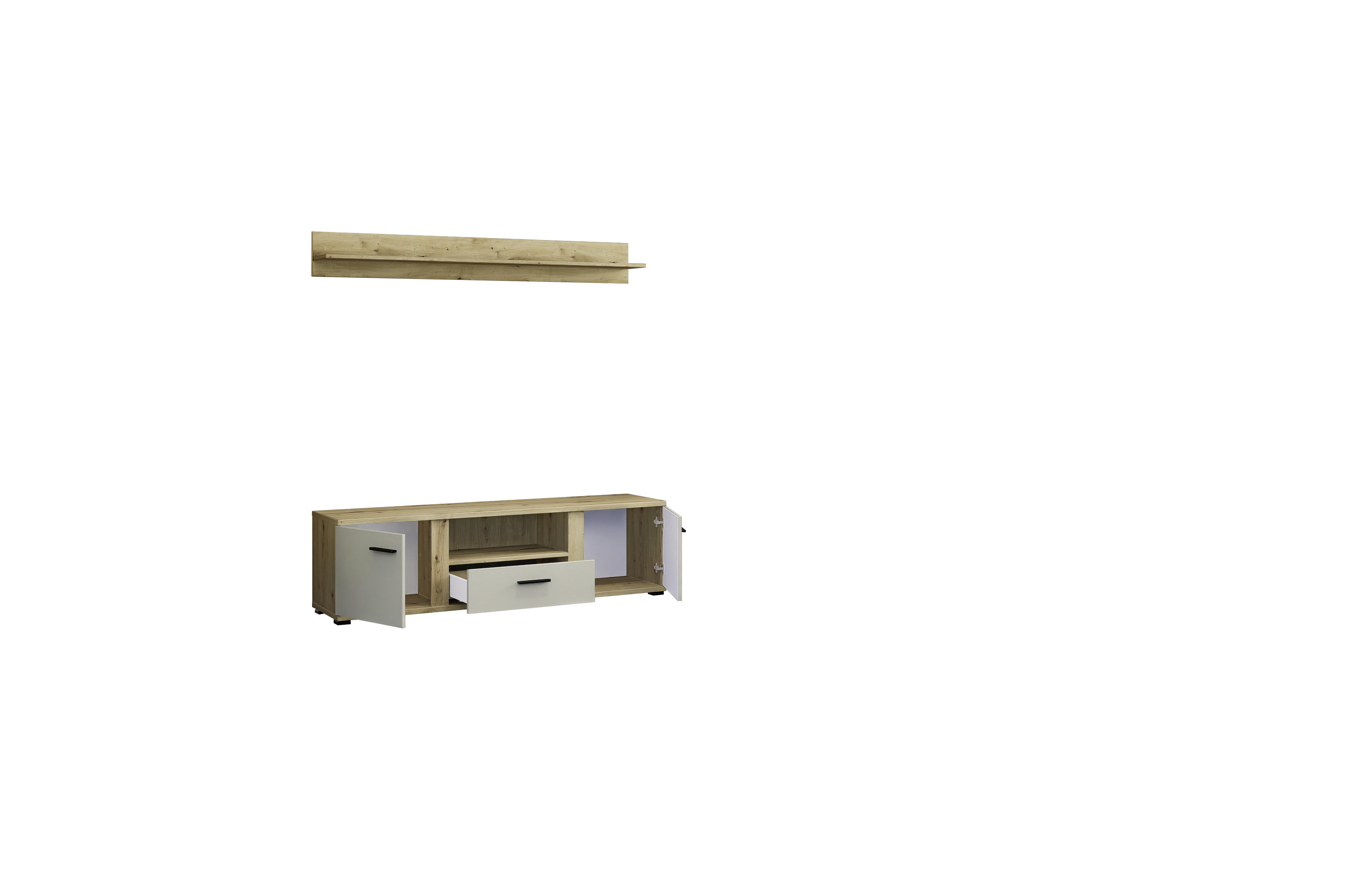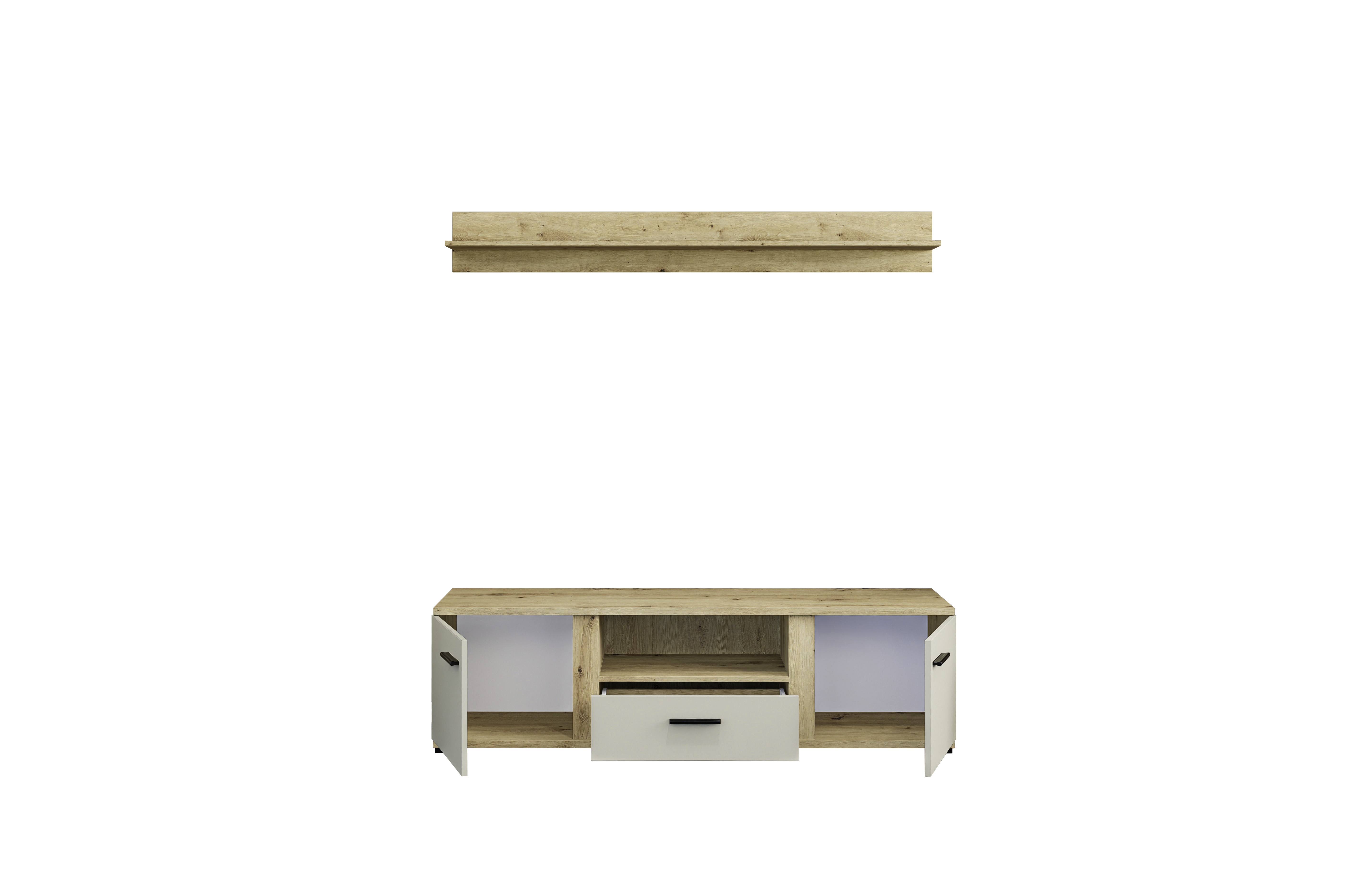1 banc TV avec 2 portes, 1 tiroir avec coulisses inférieures, 1 casier ouvert et 1 passe-câble