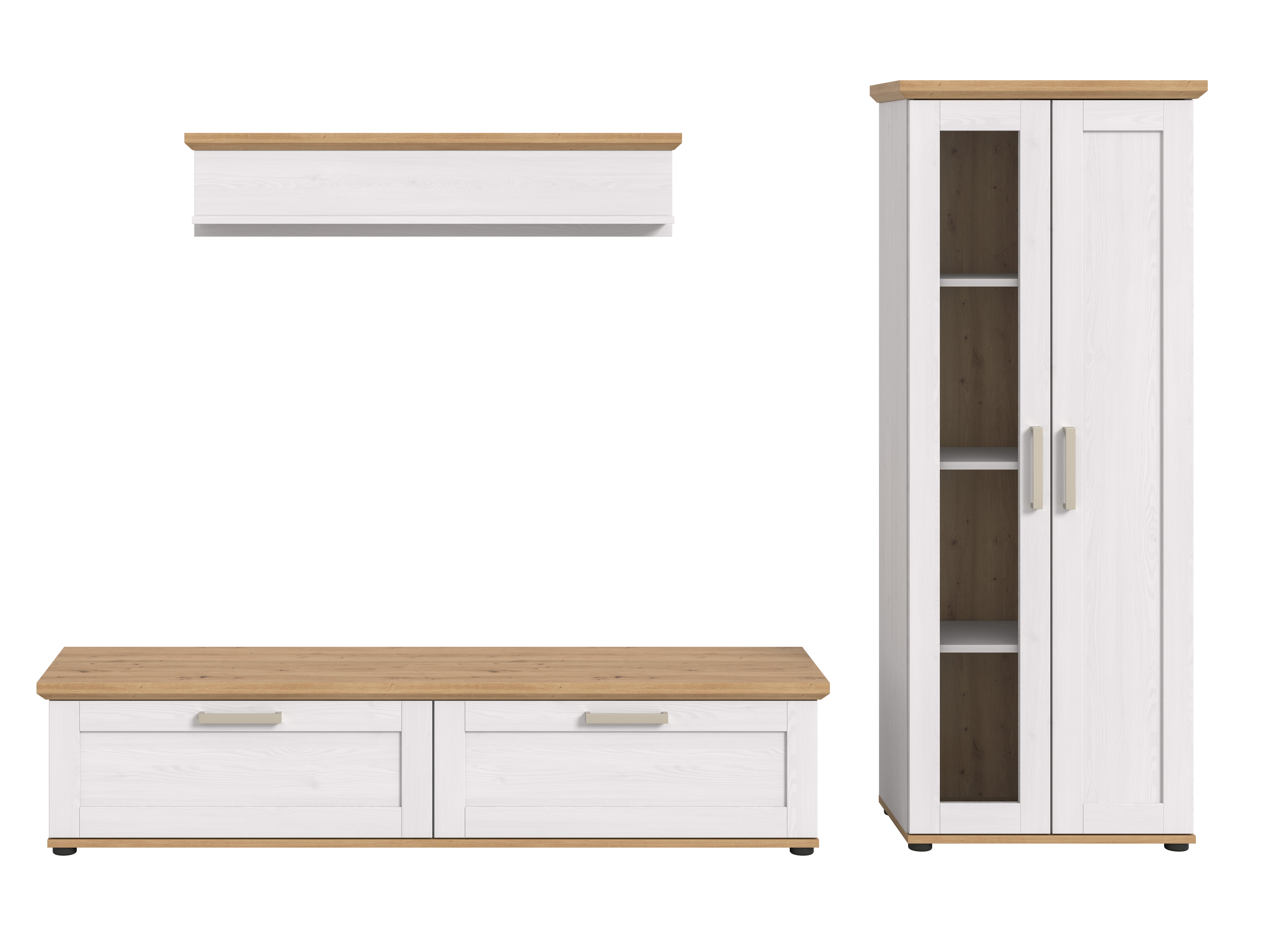 Apportez charme et fonctionnalité à votre salon avec notre mur TV 3 éléments ! Composé d’un banc TV, d’une étagère murale et d’une grande vitrine, cet ensemble permet de mettre en valeur vos objets préférés avec élégance. Son look inspiré du style maison de campagne, avec panneaux inférieur et supérieur dans une teinte de contraste, crée une atmosphère chaleureuse et accueillante.