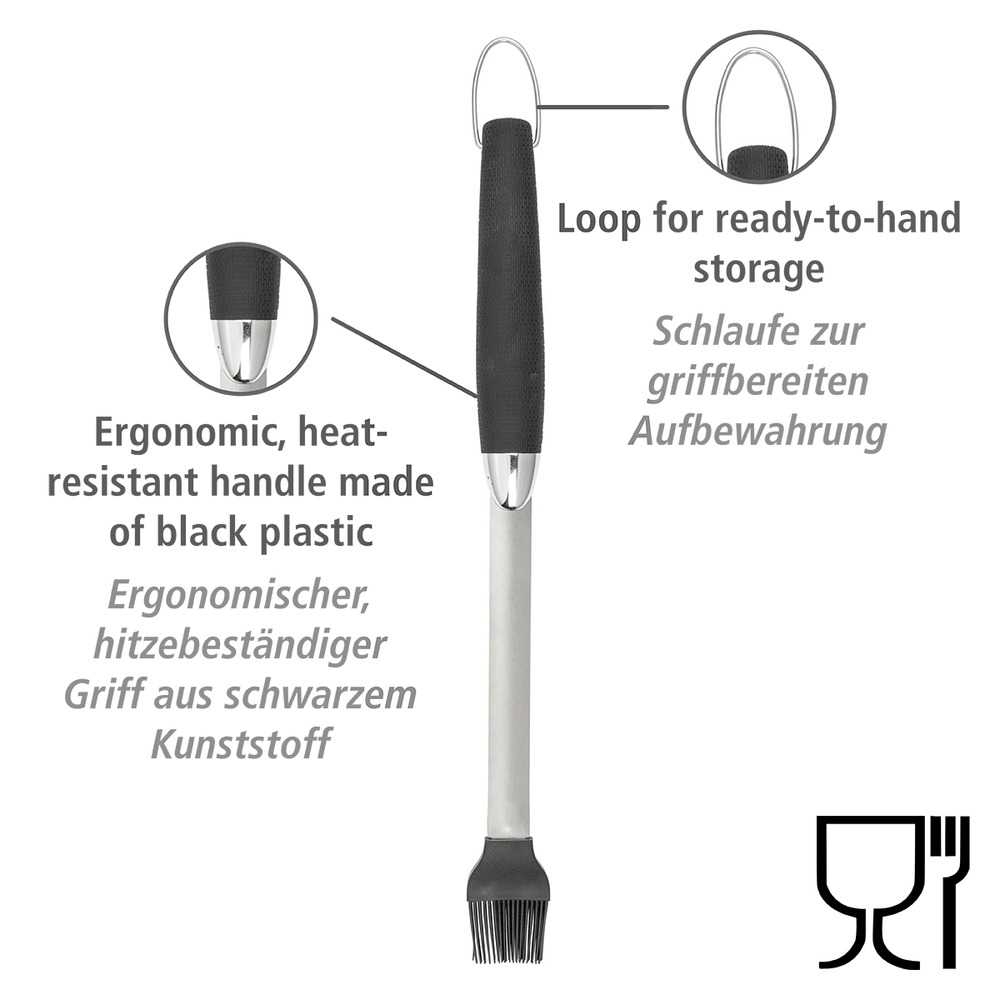 Manche ergonomique : le manche en plastique TPR noir élégant du pinceau à barbecue tient très bien dans la main. Cela vous permet d'utiliser cet accessoire de cuisine en permanence. Le crochet pratique sur le manche permet en outre de suspendre l'ustensile au chariot du barbecue ou à un crochet à proximité.