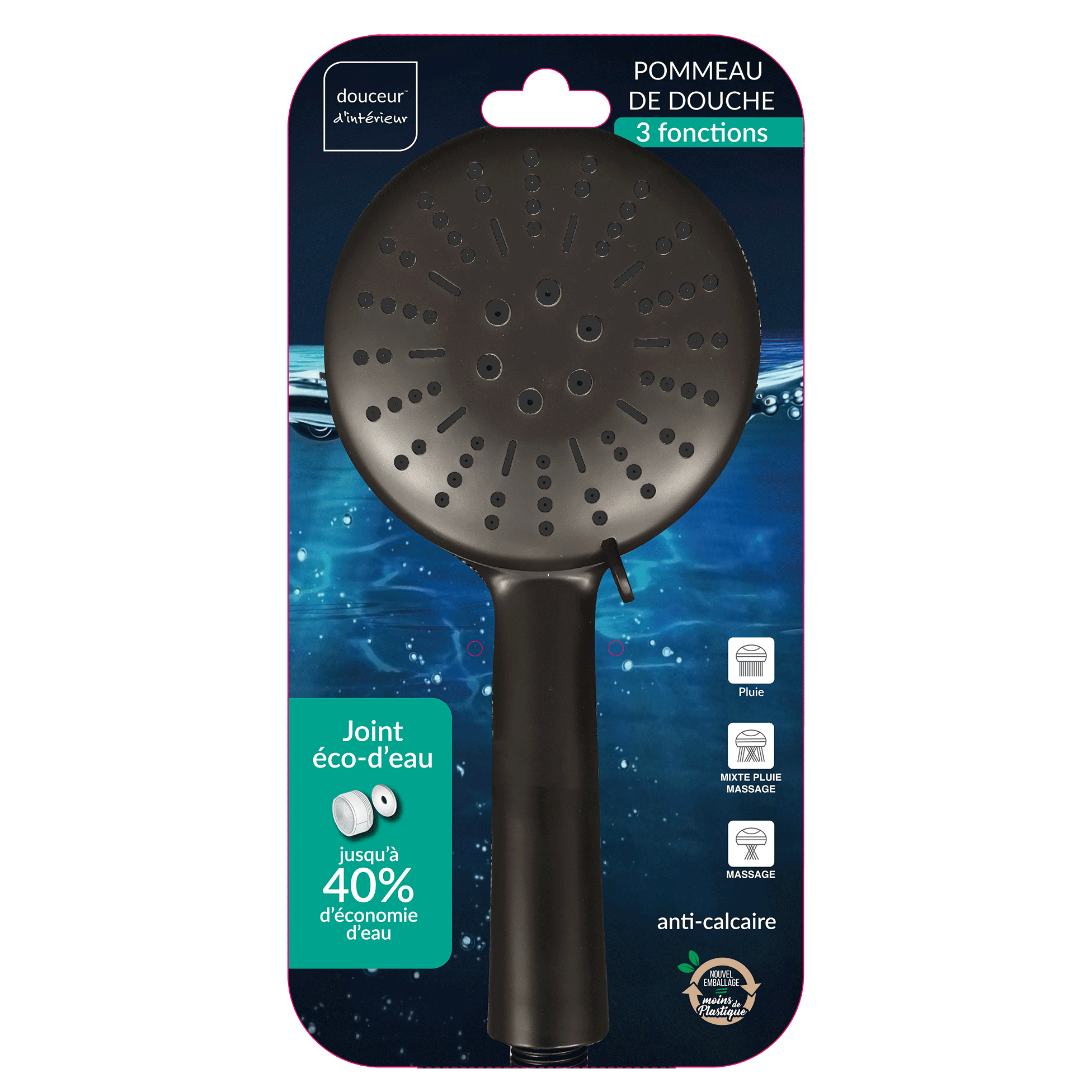 Fonctions : avec trois réglages possibles + réglage économie d’eau