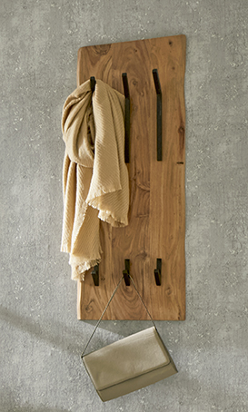 en bois d’acacia massif laissé à l’état naturel avec crochets en métal finition époxy ton noir