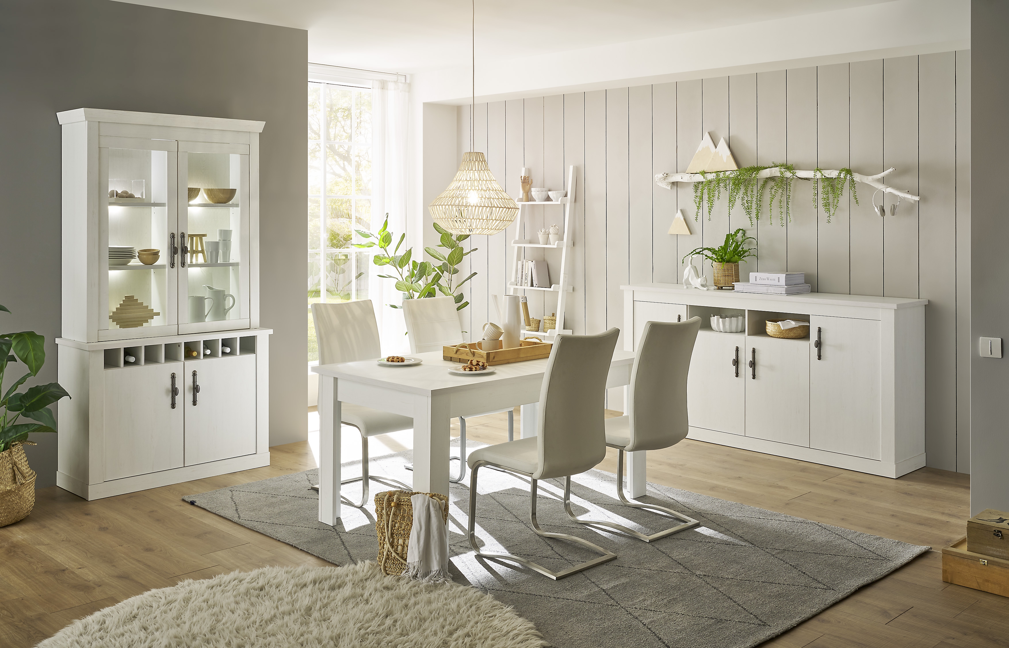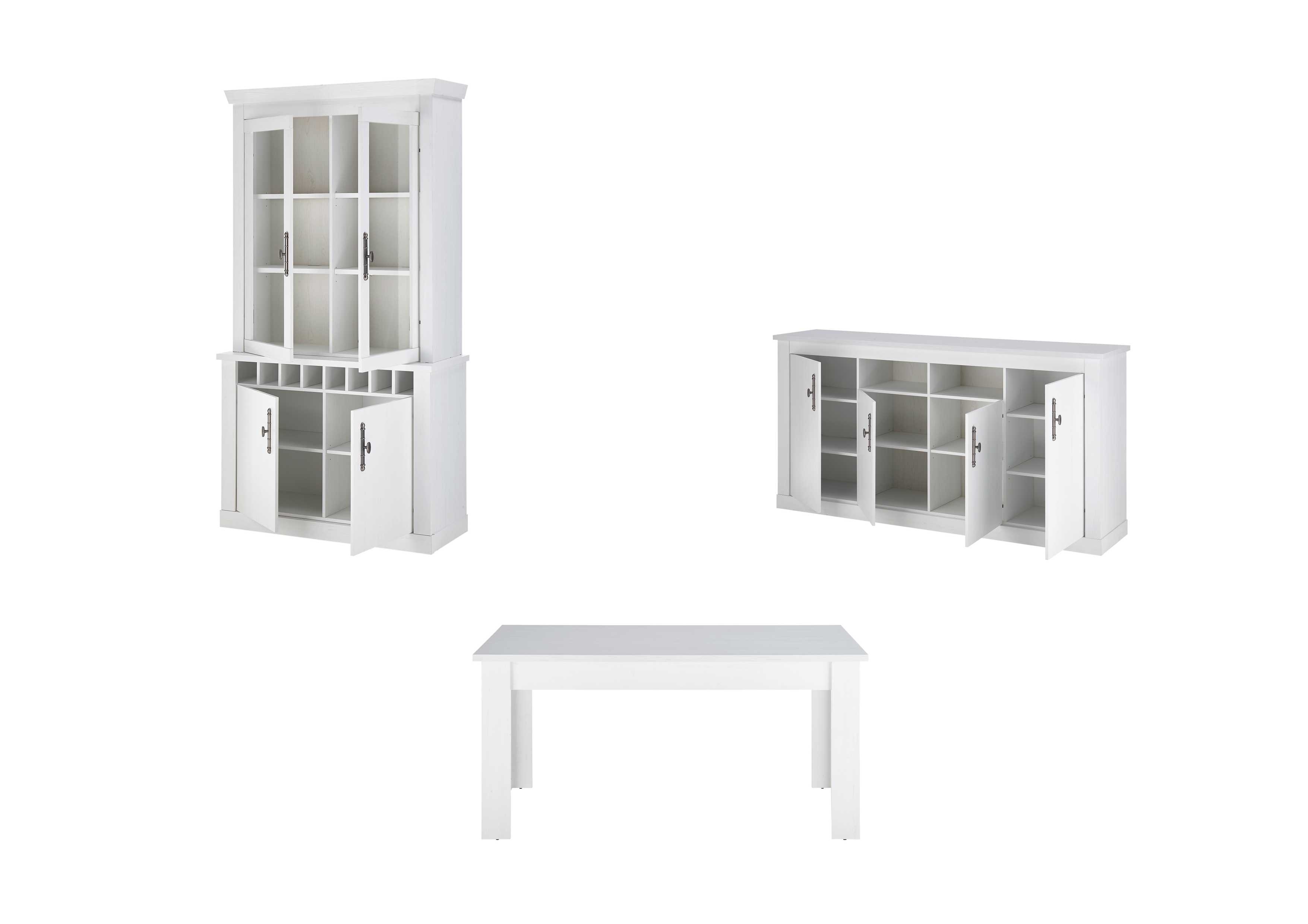 1 vaisselier avec 2 portes (et, derrière chacune d’elle, 1 tablette), en haut : 1 élément rehausse comprenant 2 portes en verre avec encadrement et 4 tablettes en verre, au centre : 1 rangement pour bouteilles avec 8 casiers