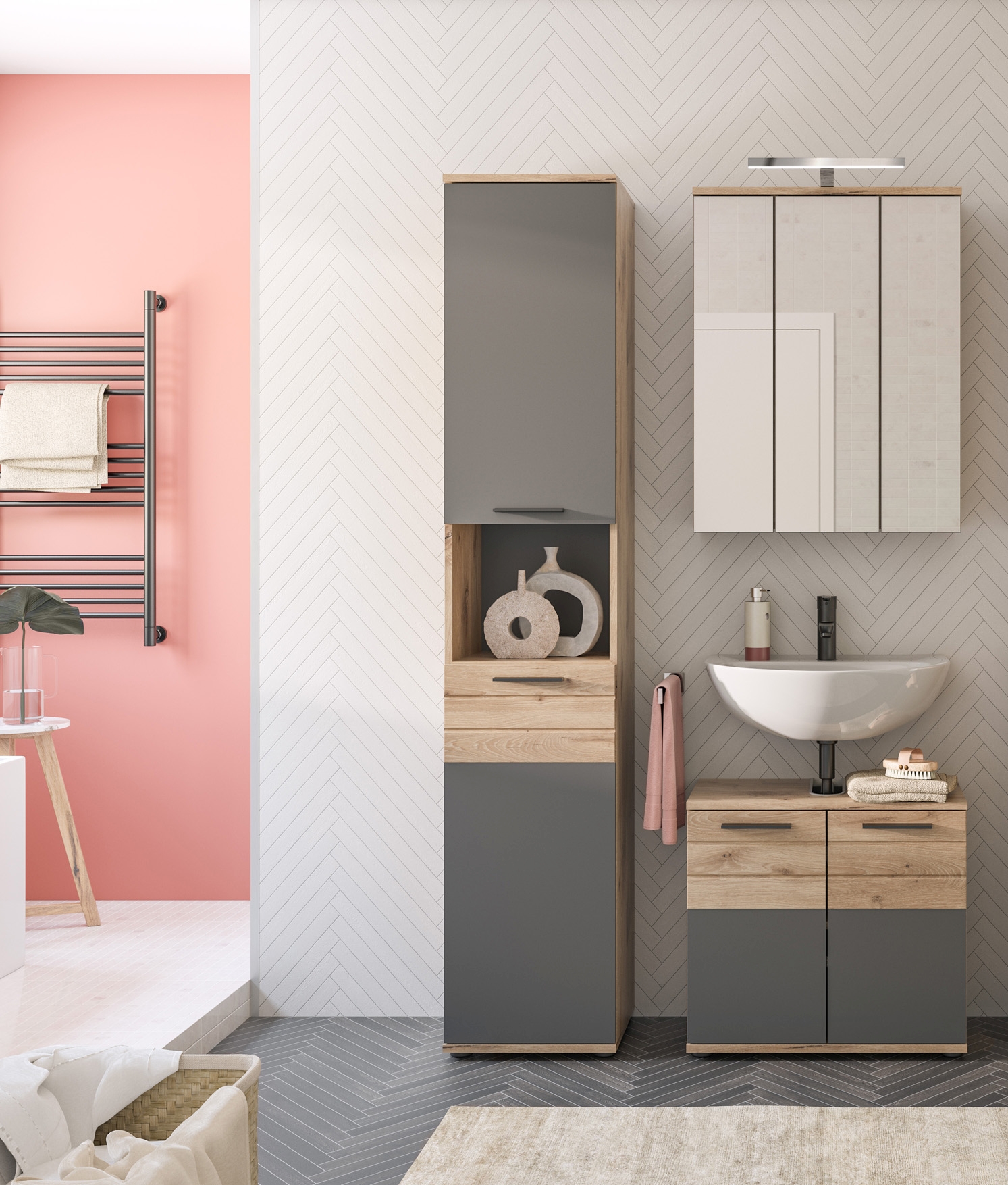 Transformez votre salle de bains en oasis de détente avec notre salle de bains combinée décor chêne Nox et ton gris basalte. Cet ensemble comprenant meuble sous lavabo, meuble colonne et armoire de toilette offre suffisamment d’espace de rangement dans un design moderne. Grâce à sa finition de qualité et à l’association harmonieuse des teintes, cette salle de bains combinée attirera tous les regards.