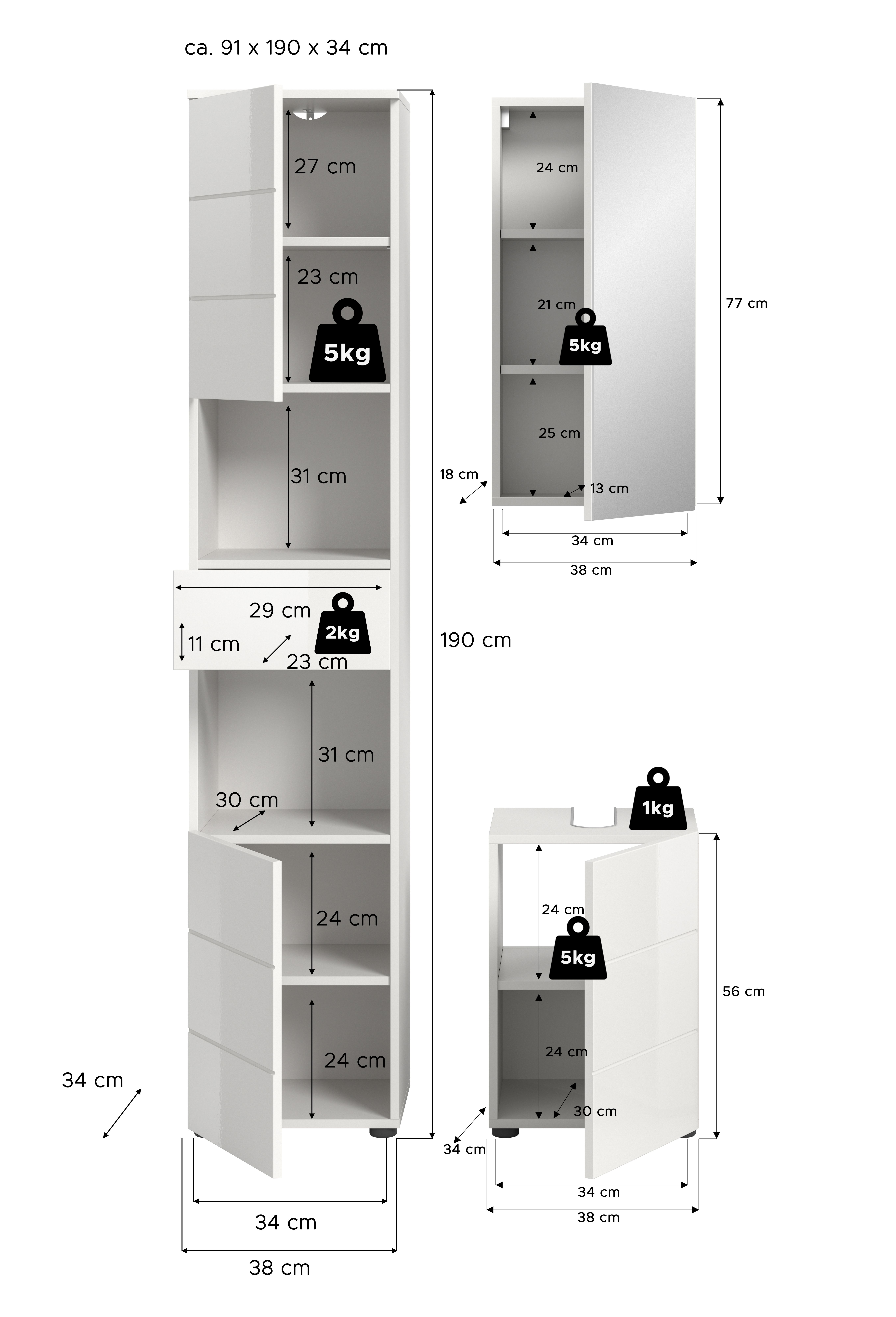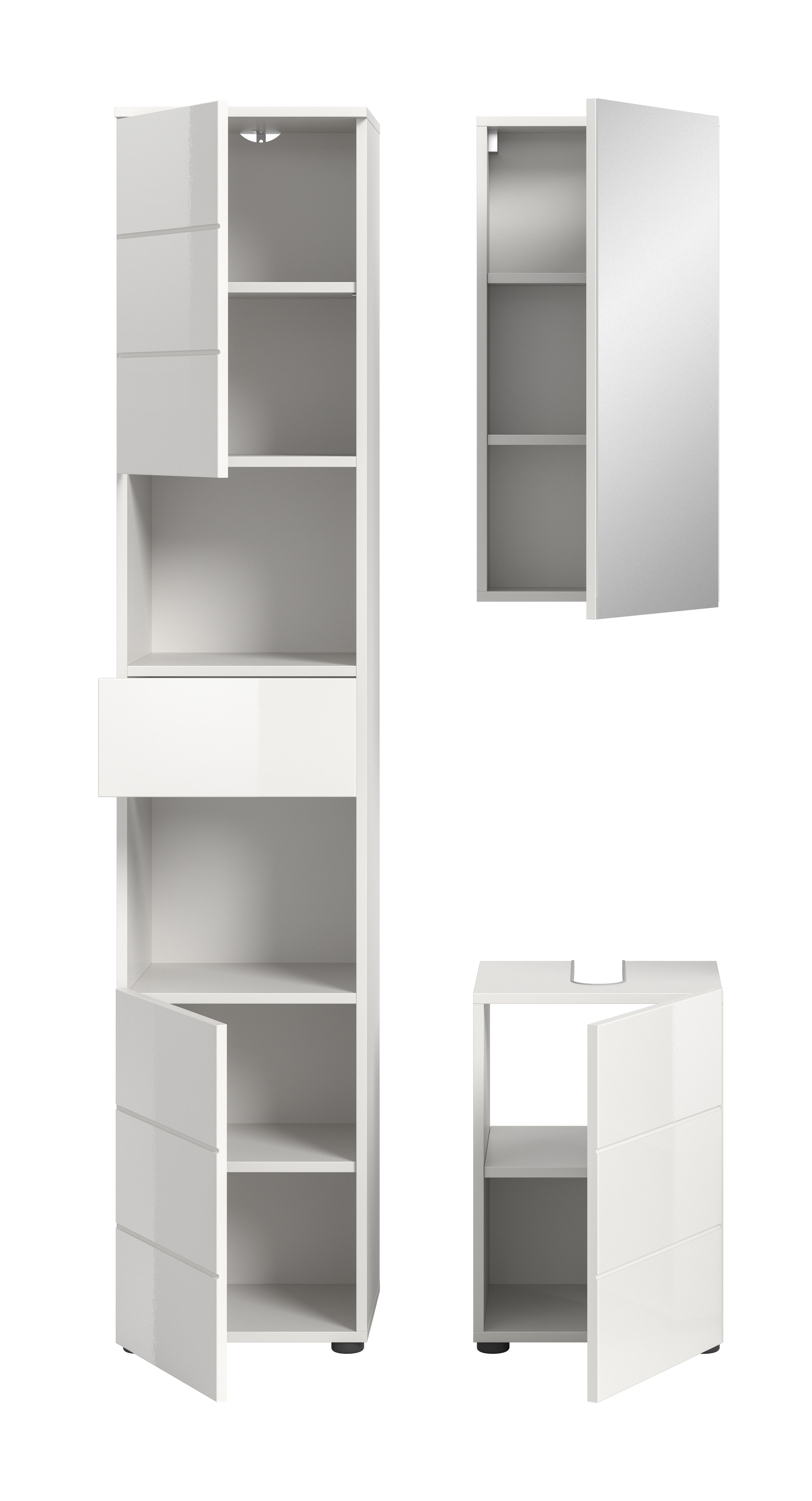 La salle de bains combinée (L/H/P : 91x190x34 cm) dans une finition thermoformée ton blanc ultra brillant est idéale pour les salles d’eau compactes. Cet ensemble comprend un meuble colonne, un meuble sous lavabo et une armoire de toilette qui constituent une solution pratique et élégante pour ranger vos accessoires de bains. Profitez du design tendance et de l’espace de rangement supplémentaire pour organiser votre salle de bains de façon simple et stylée.