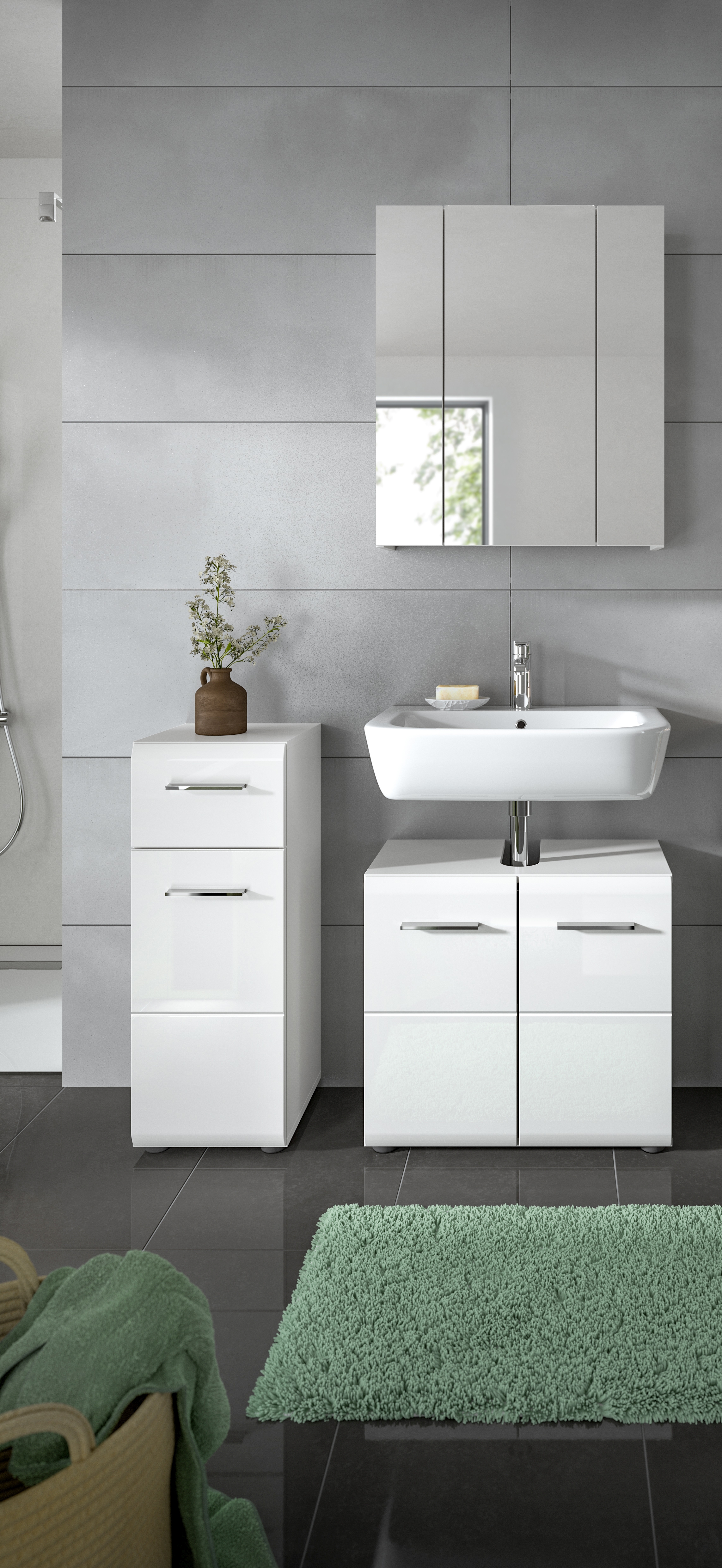 - Fonctionnalité : ensemble constitué d’un meuble sous lavabo, d’une armoire de toilette et d’un meuble demi-colonne pour une solution de rangement sur un faible encombrement dans la salle de bains.