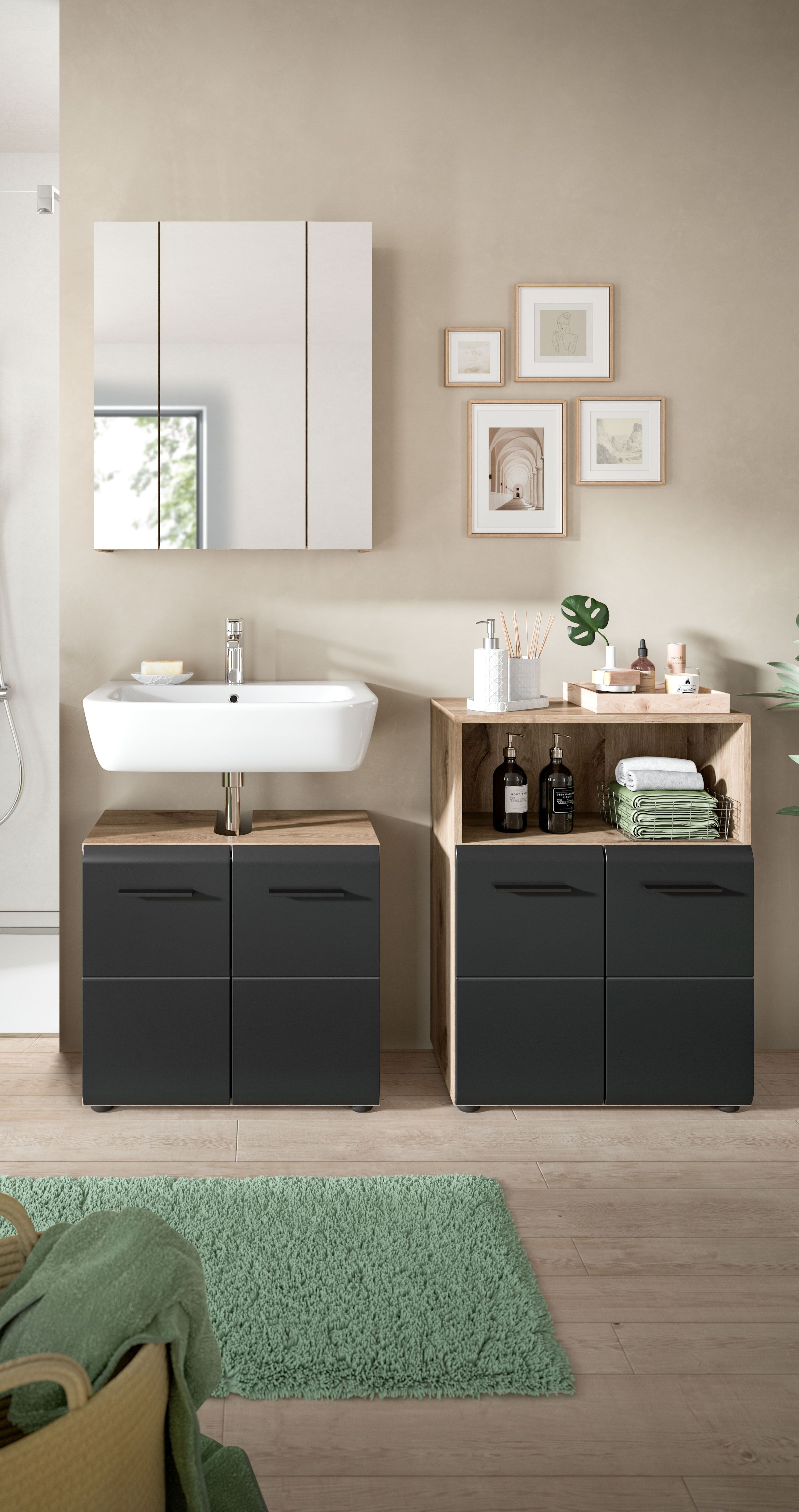 - Fonctionnalité : ensemble constitué d’un meuble sous lavabo, d’une armoire de toilette et d’un meuble de salle de bains pour une solution de rangement complète sur un faible encombrement dans la salle de bains.
