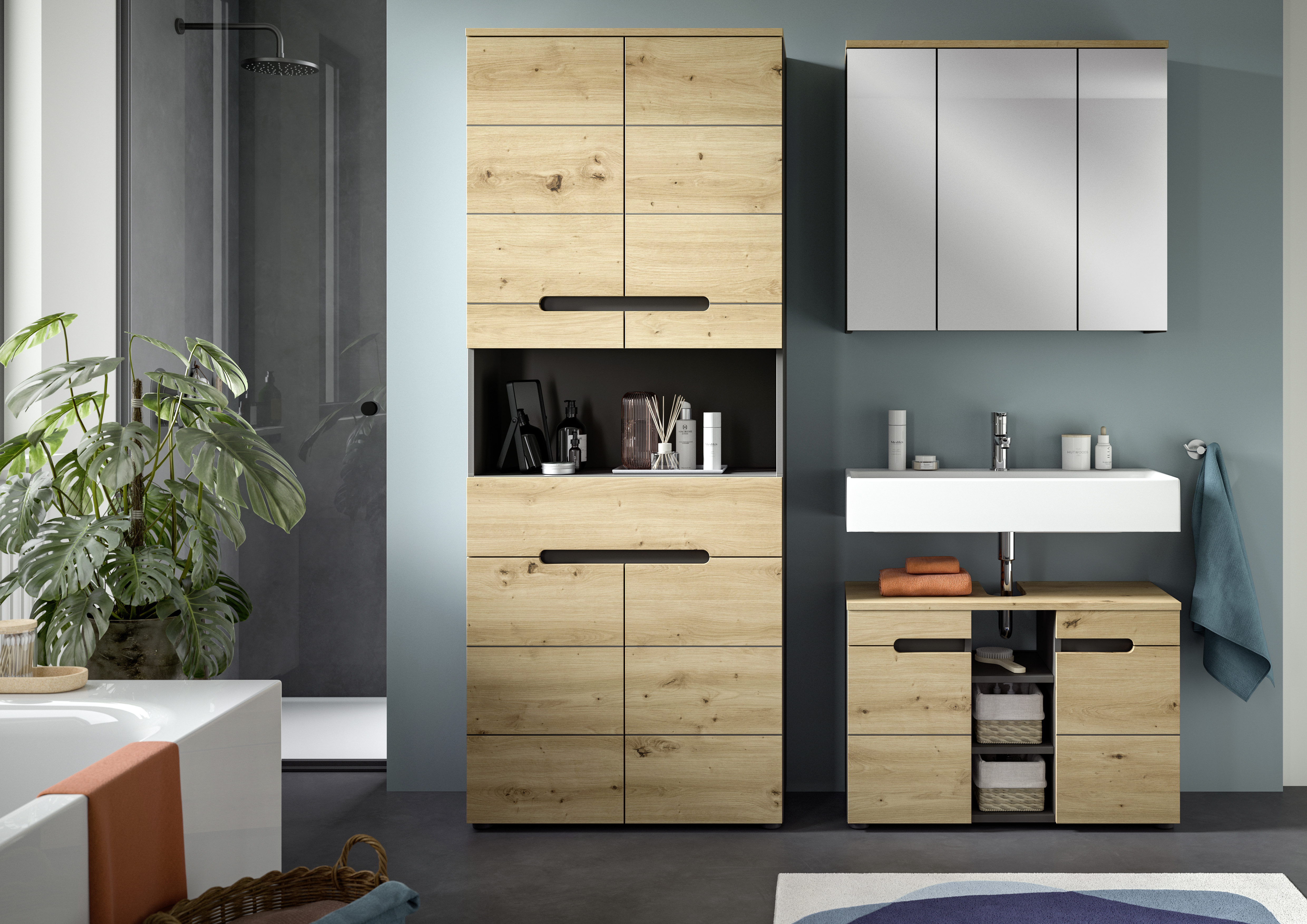Notre ensemble combiné est le choix idéal pour les salles de bains modernes qui allient fonctionnalité et esthétique. L’association du décor ton gris basalte et du décor chêne Artisan aspect bois naturel avec des accents noirs confère à l’ensemble une allure élégante et intemporelle. Tous les éléments, du meuble colonne au meuble sous lavabo, sont parfaitement coordonnés visuellement, créant une apparence harmonieuse et uniforme. Les meubles offrent des solutions de rangement polyvalentes, à la fois pratiques et peu encombrantes.