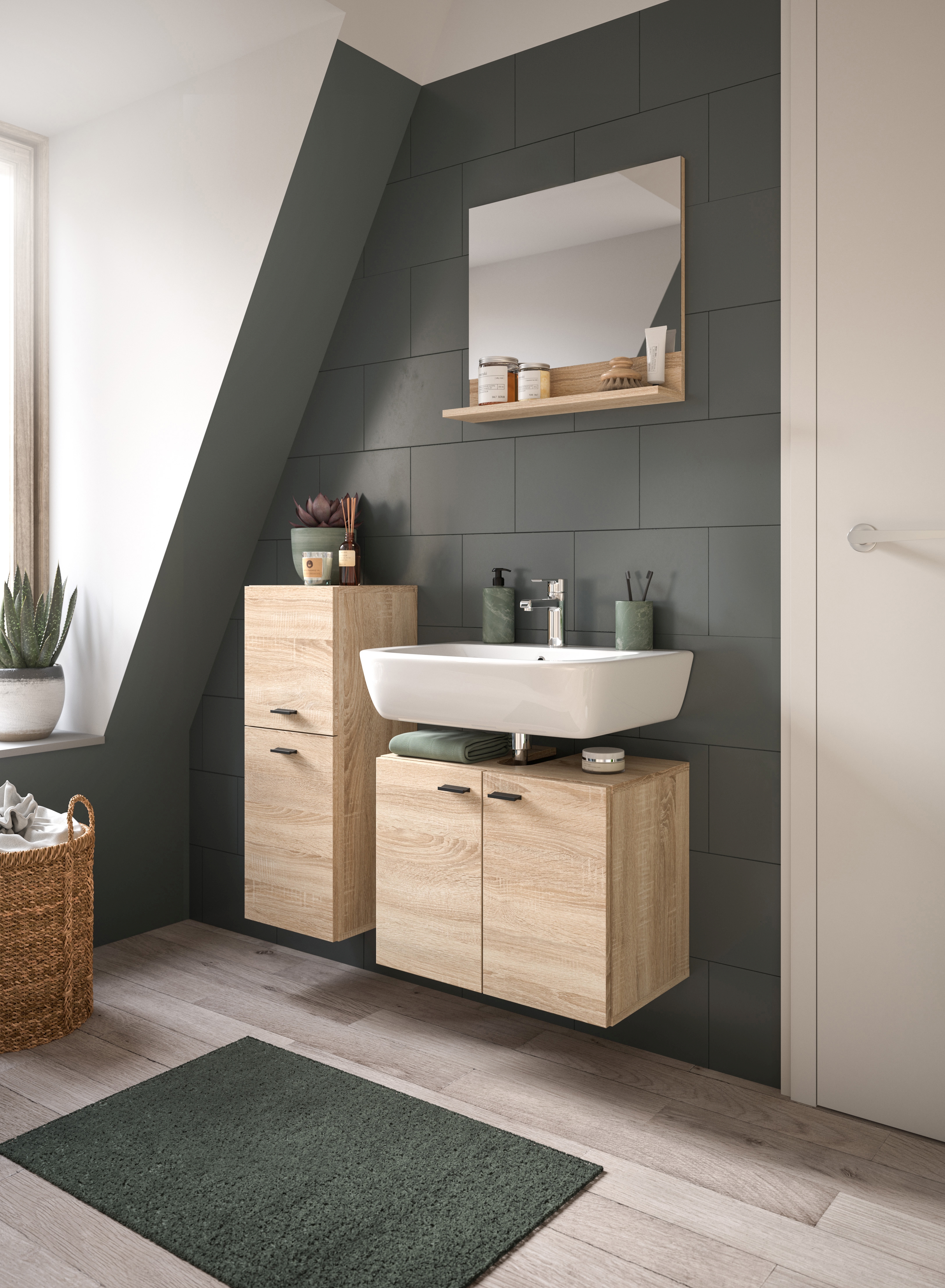 - Design/style : ensemble SDB tendance dans un décor chêne Sonoma pour une ambiance naturelle et chaleureuse dans la salle de bains.