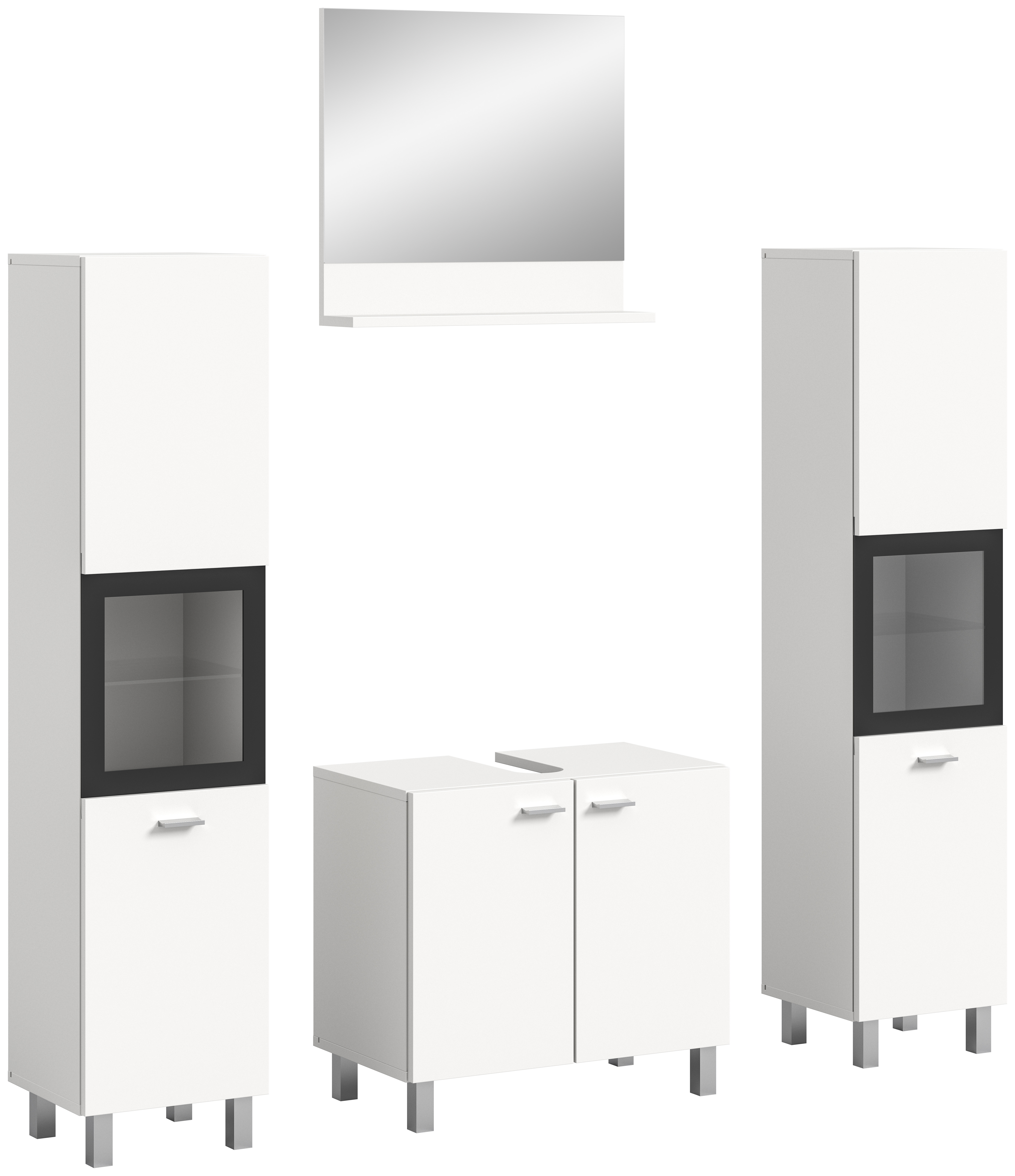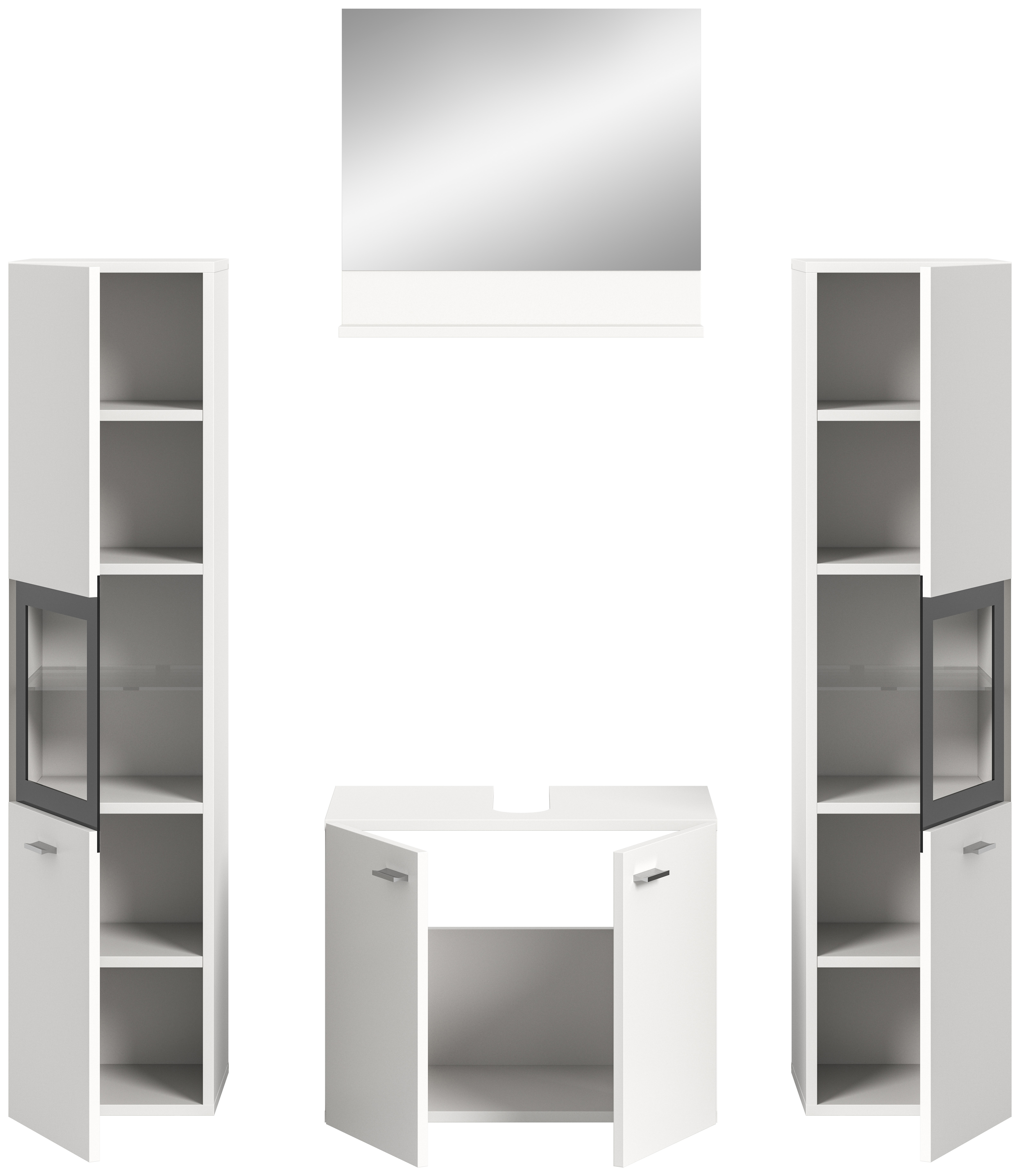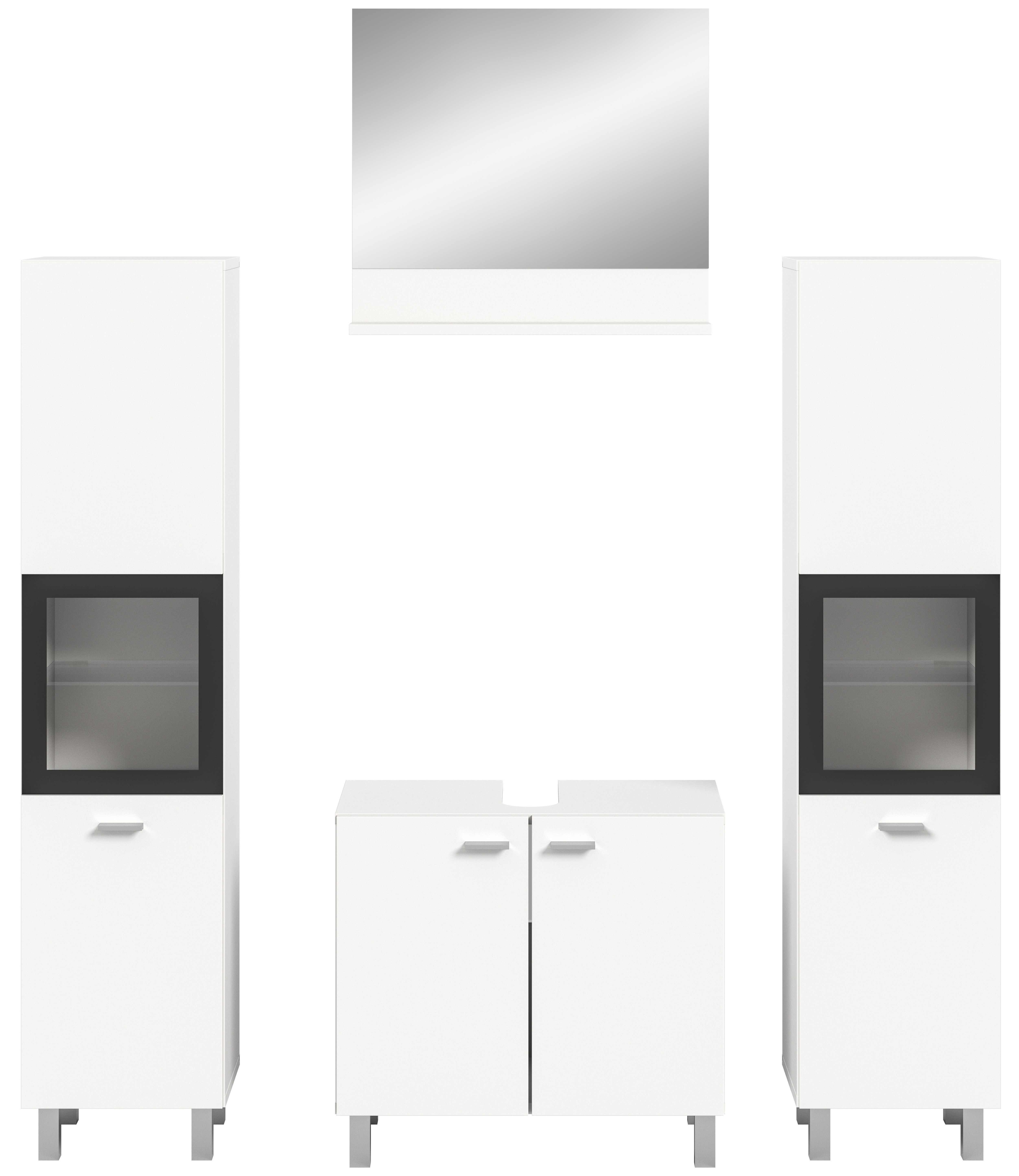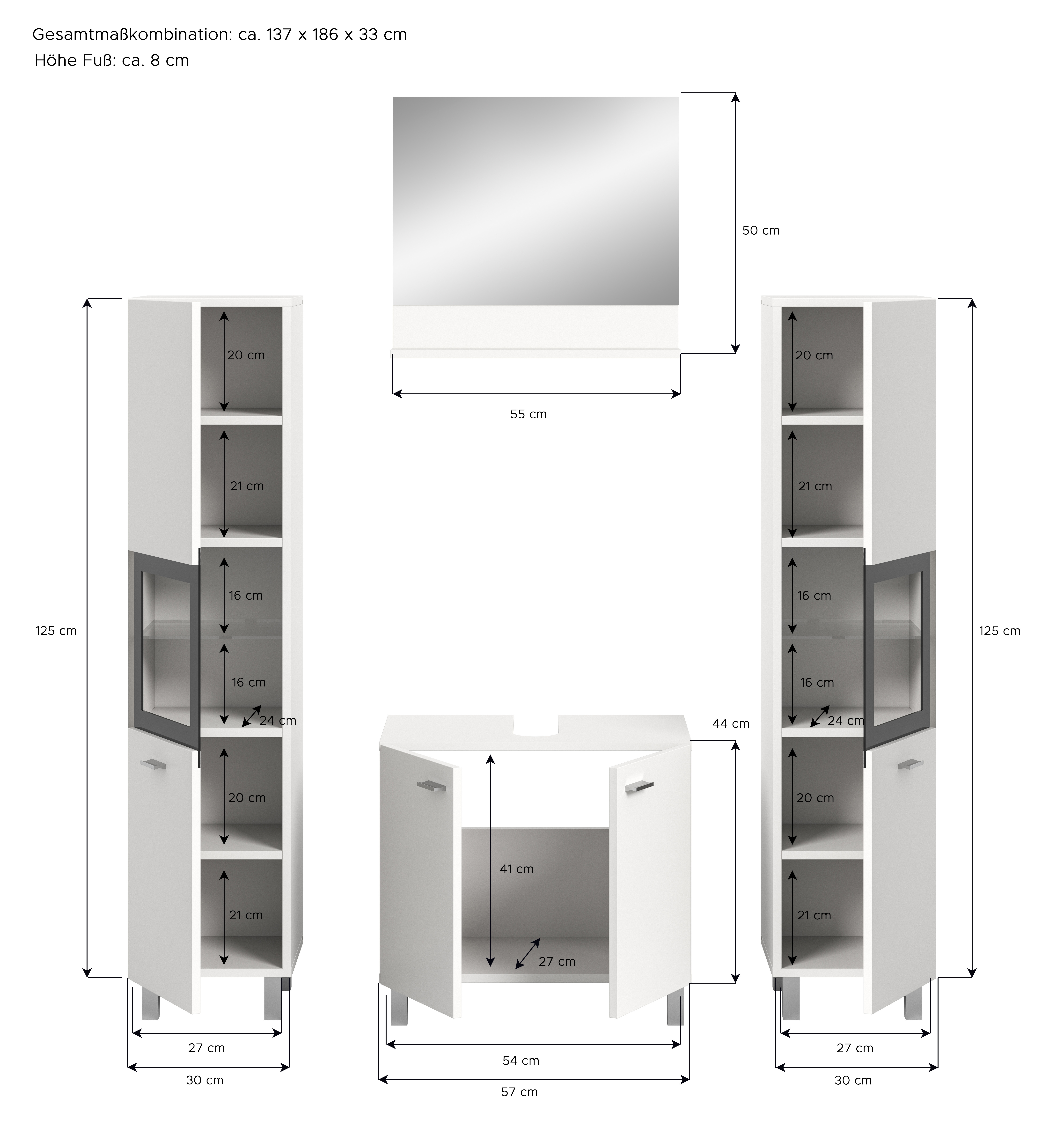 - Fonctionnalité : vaste espace de rangement avec différentes armoires et divers casiers pour le stockage organisé des accessoires de bain, serviettes et produits de soins ; cet ensemble permet également d’aménager joliment la salle de bains.