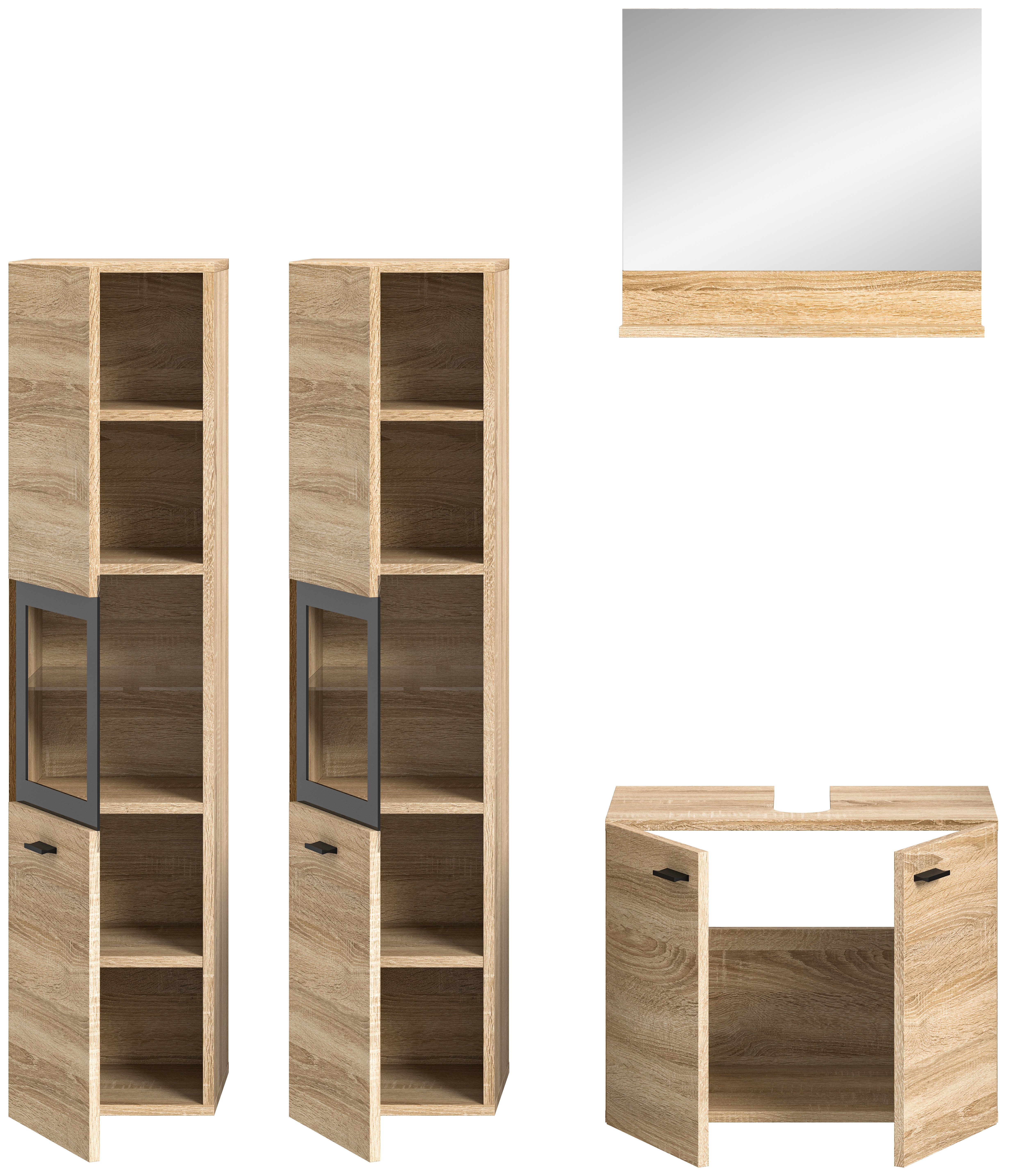 - Fonctionnalité : vaste espace de rangement avec différentes armoires et divers casiers pour le stockage organisé des accessoires de bain, serviettes et produits de soins ; cet ensemble permet également d’aménager joliment la salle de bains.