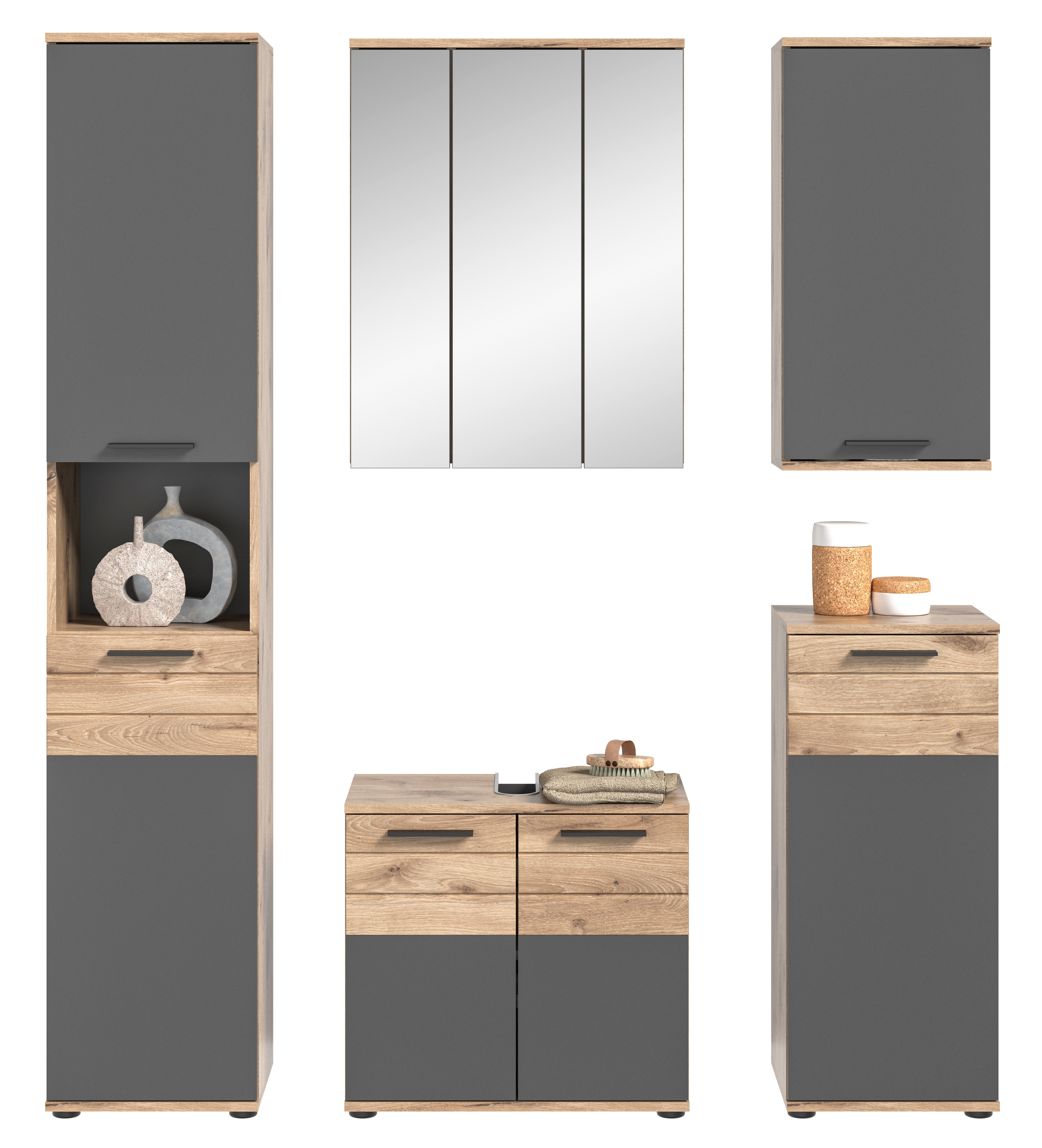 - Qualité/entretien : la finition de qualité et les matériaux robustes garantissent une durée de vie accrue pour cet ensemble de salle de bains. Les décors chêne Nox et gris basalte sont faciles à nettoyer ce qui facilite l’entretien des meubles et garantit une utilisation longue durée.