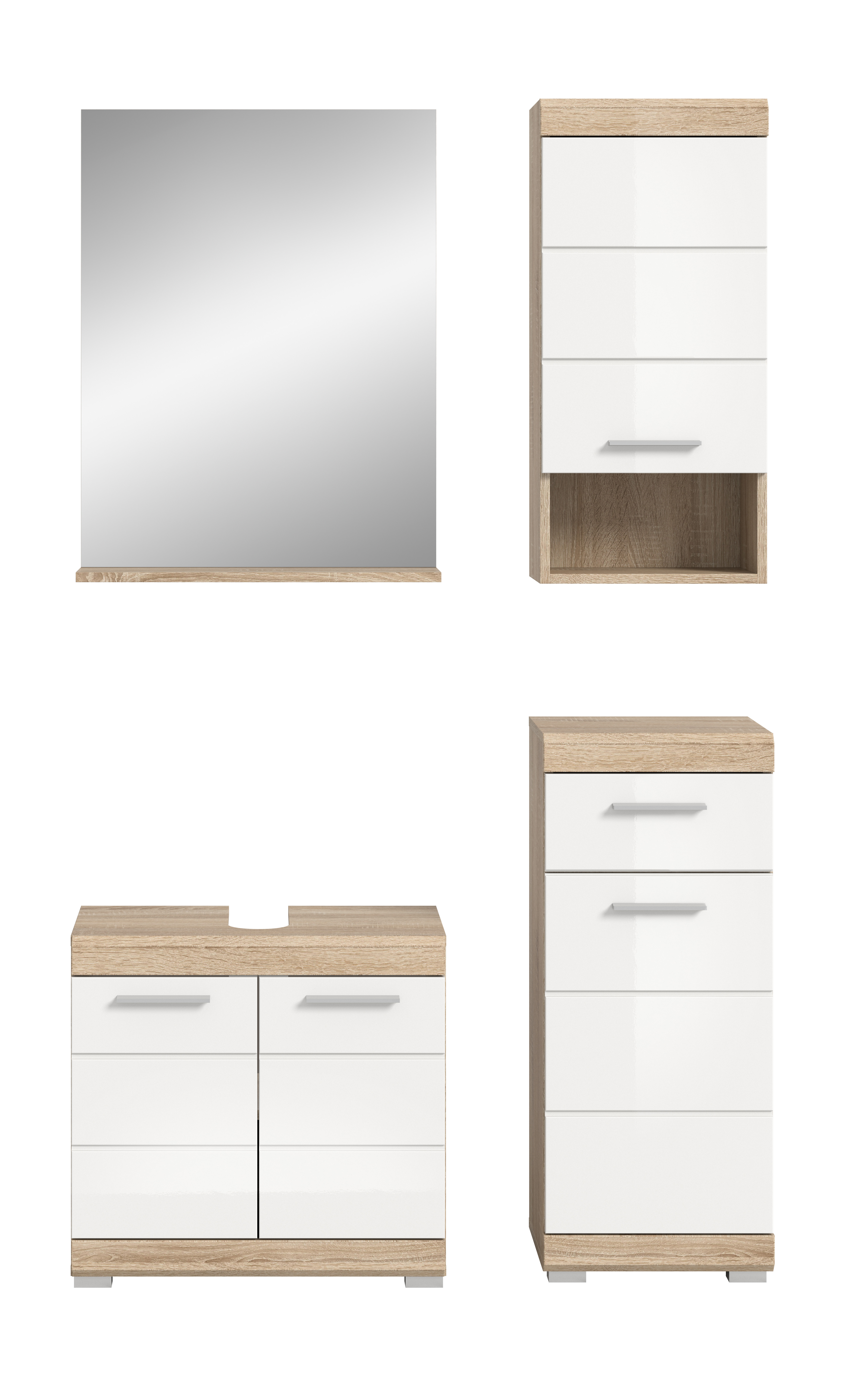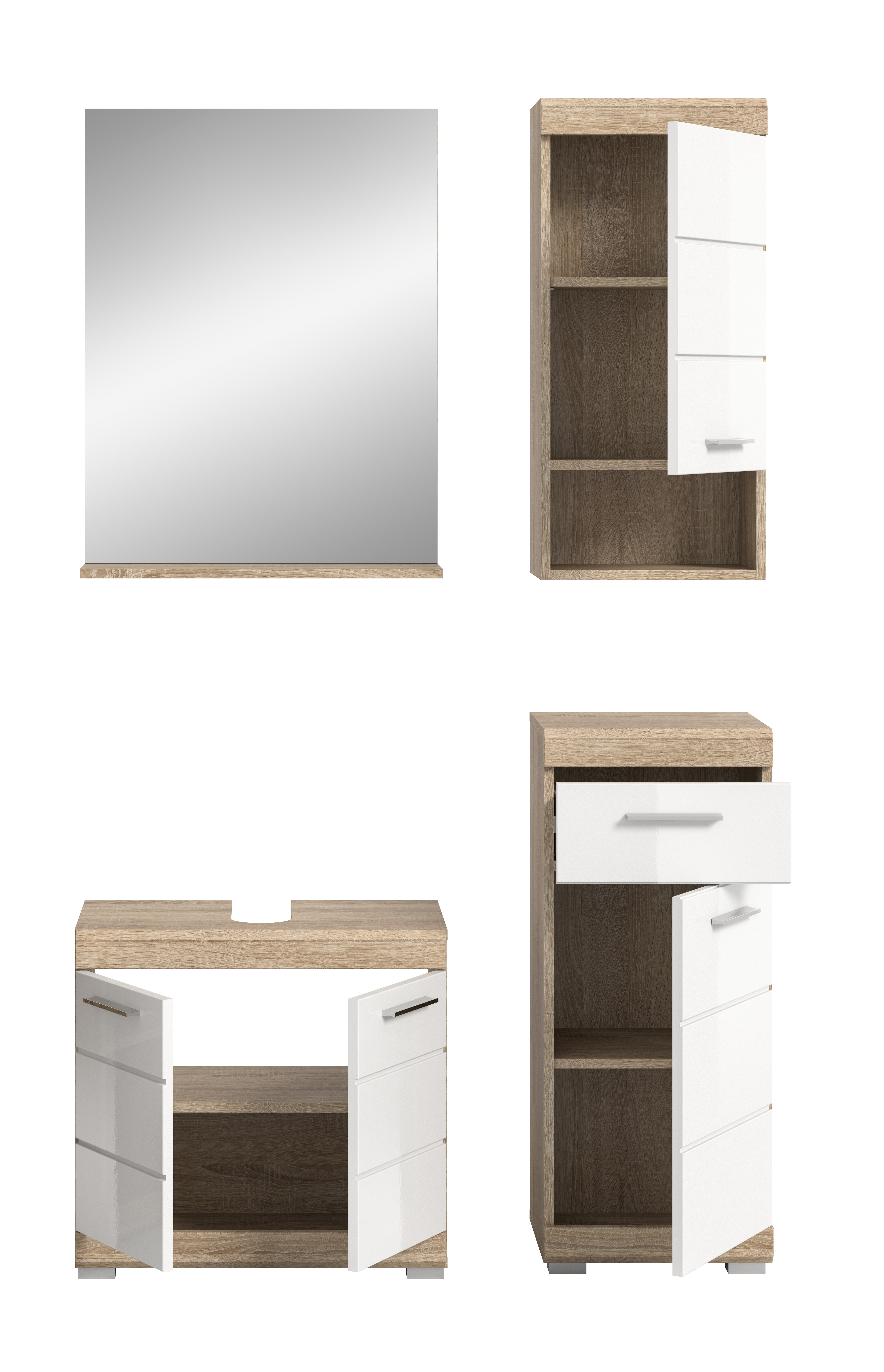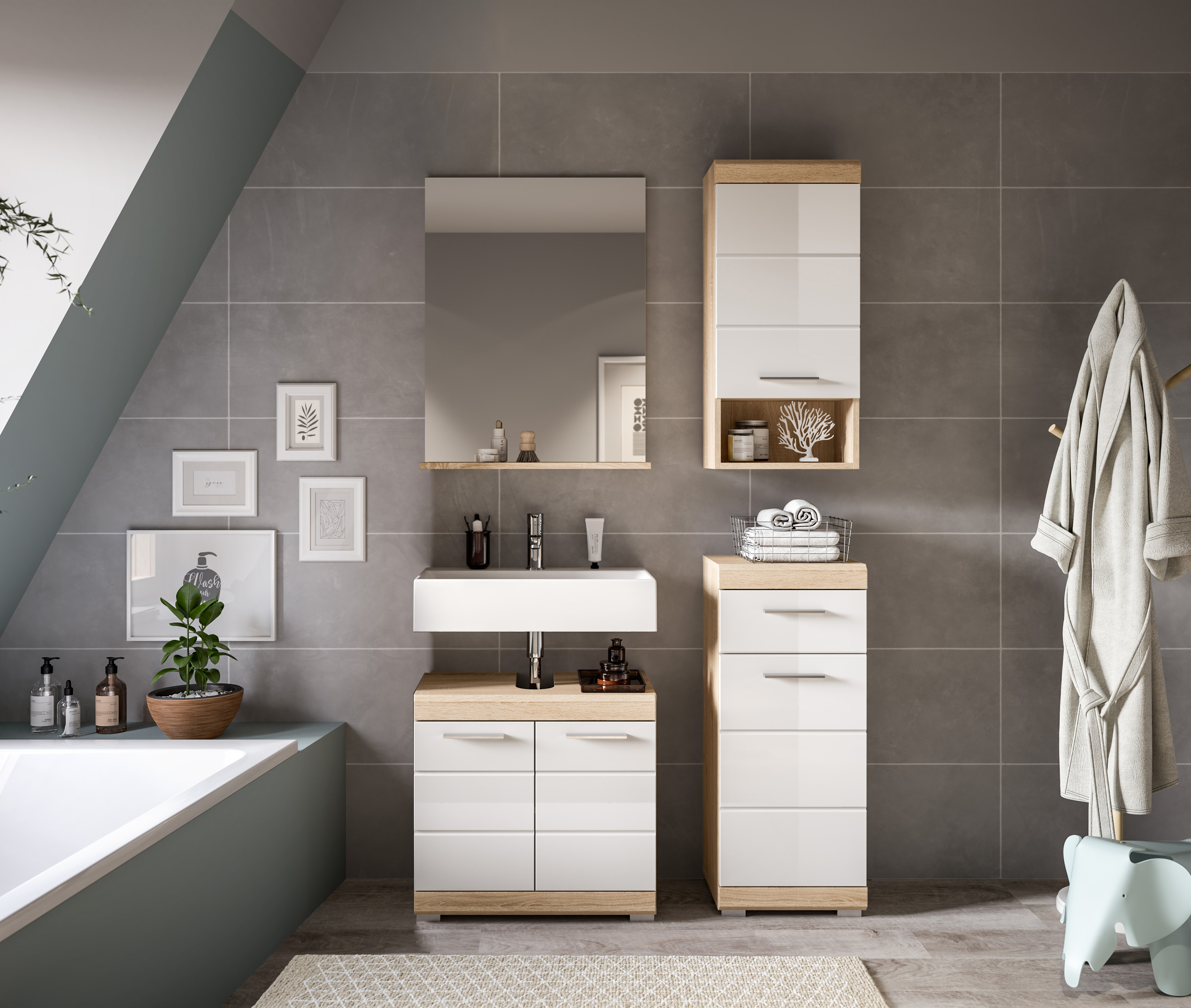 • Fonctionnalité : cette solution complète offre un espace de rangement généreux grâce à différents éléments comme le meuble sous lavabo, la colonne de salle de bains et l’armoire de toilette ; ceci permet une organisation efficace des accessoires de toilette et objets du quotidien.