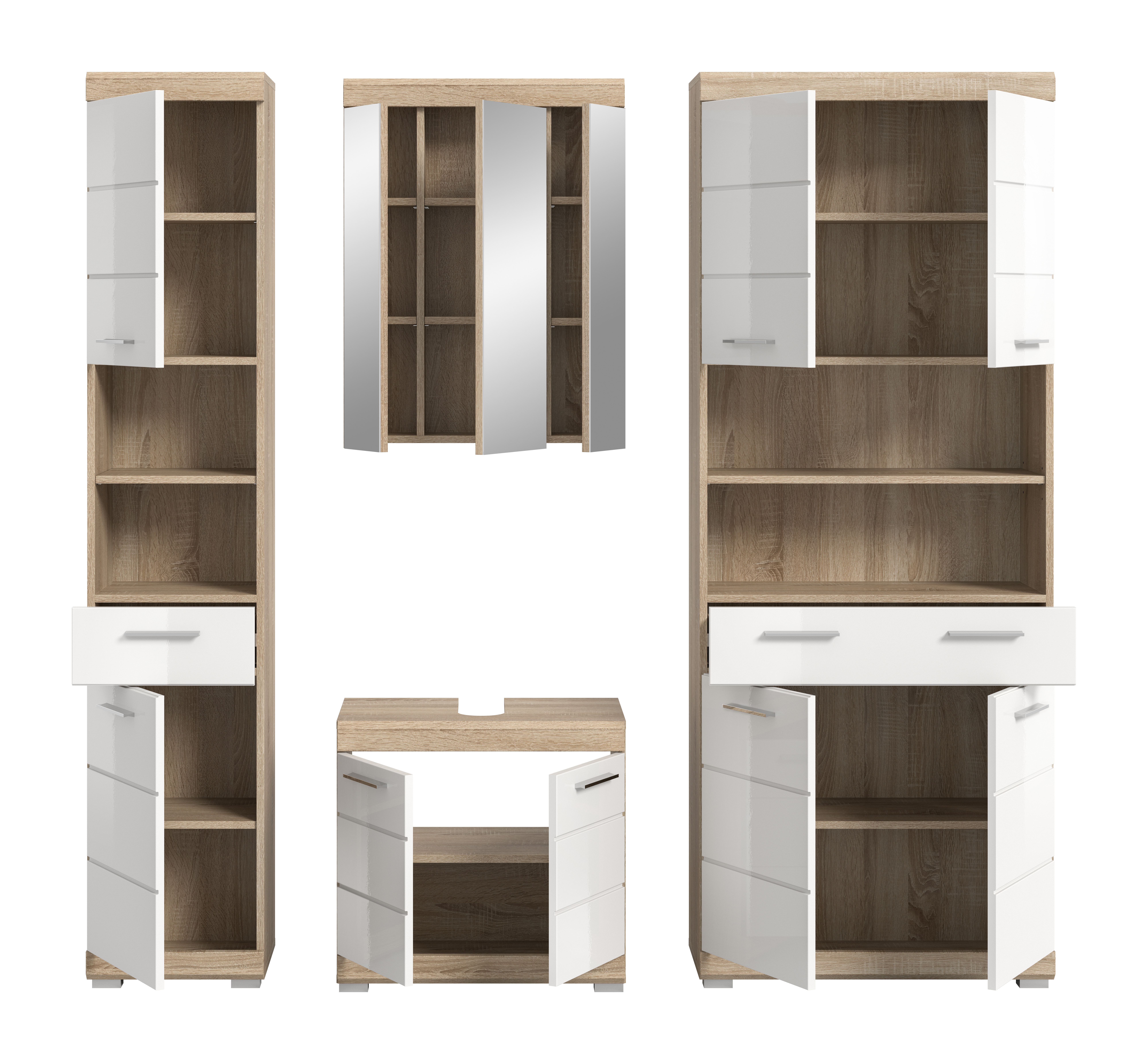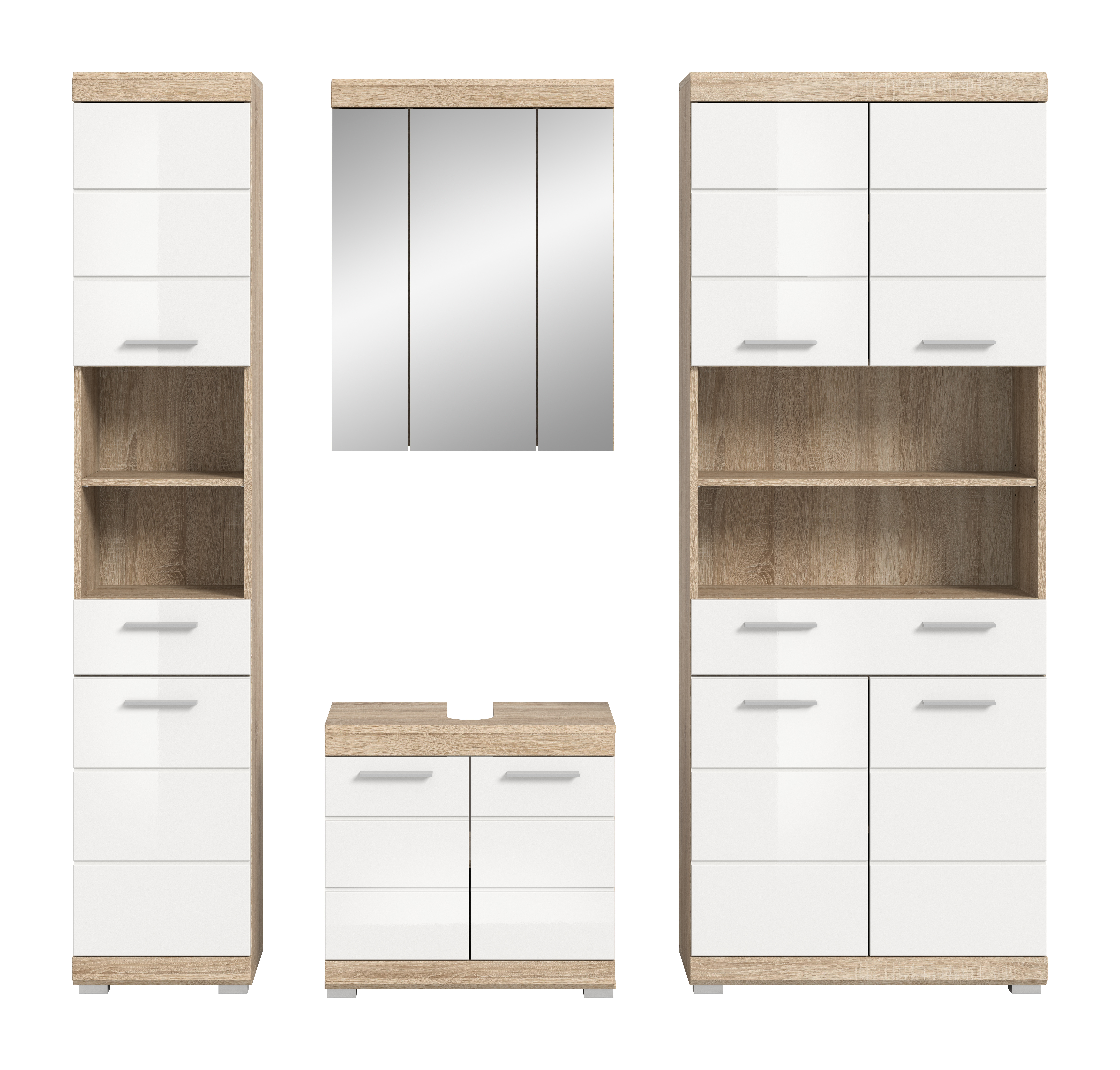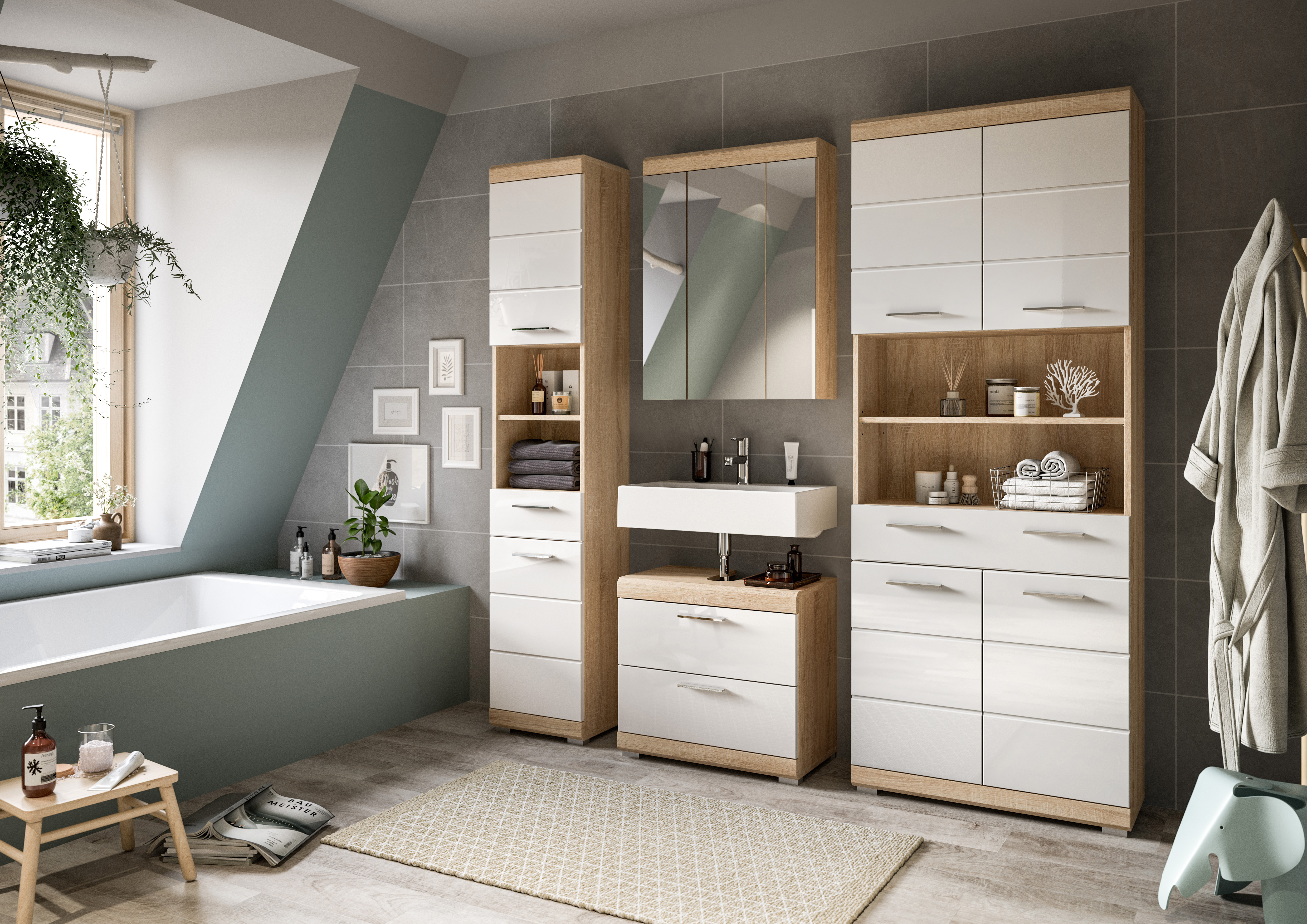 • Fonctionnalité : cette solution complète offre un espace de rangement généreux grâce à différents éléments comme le meuble sous lavabo, la colonne de salle de bains et l’armoire de toilette ; ceci permet une organisation efficace des accessoires de toilette et objets du quotidien.