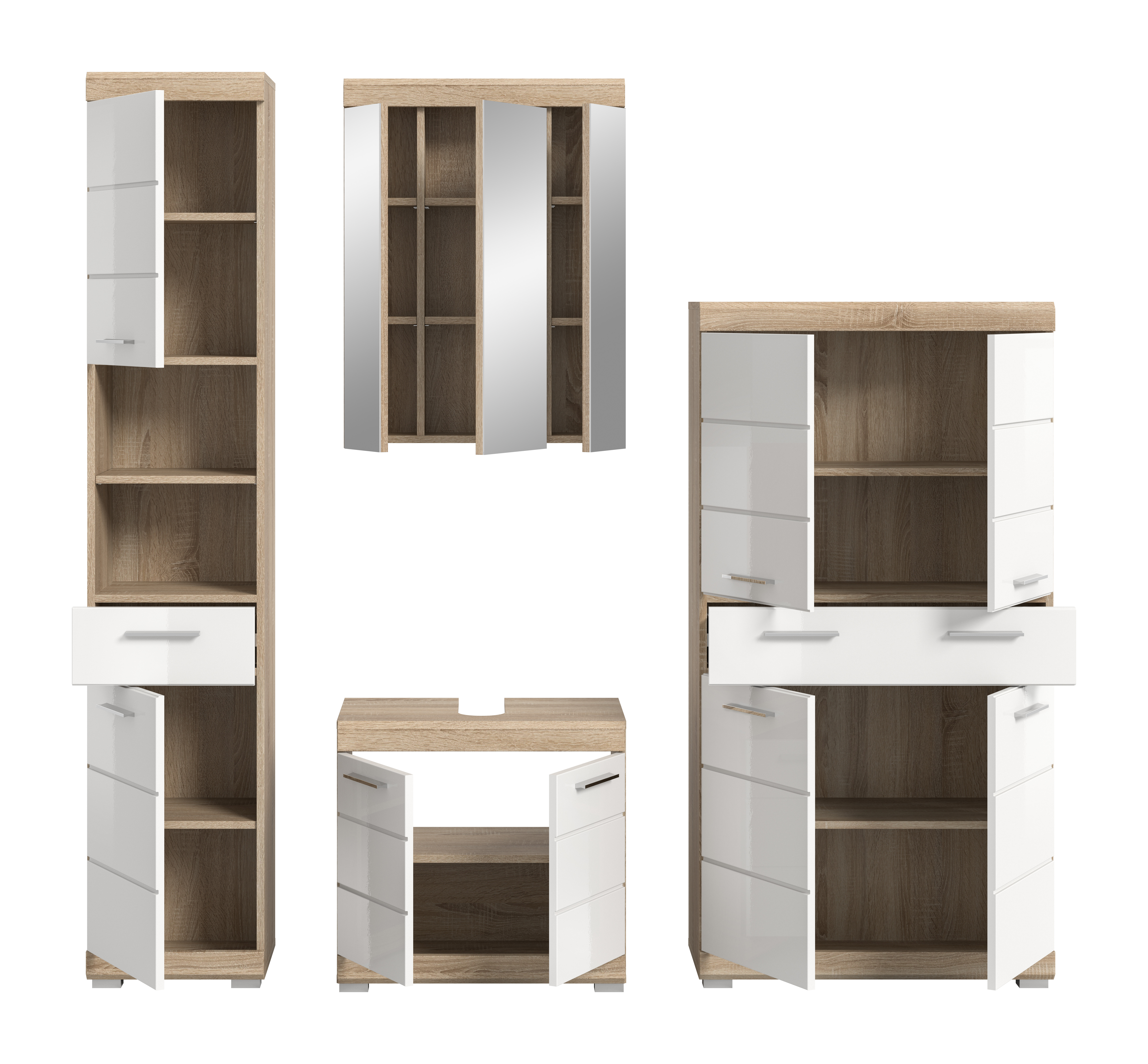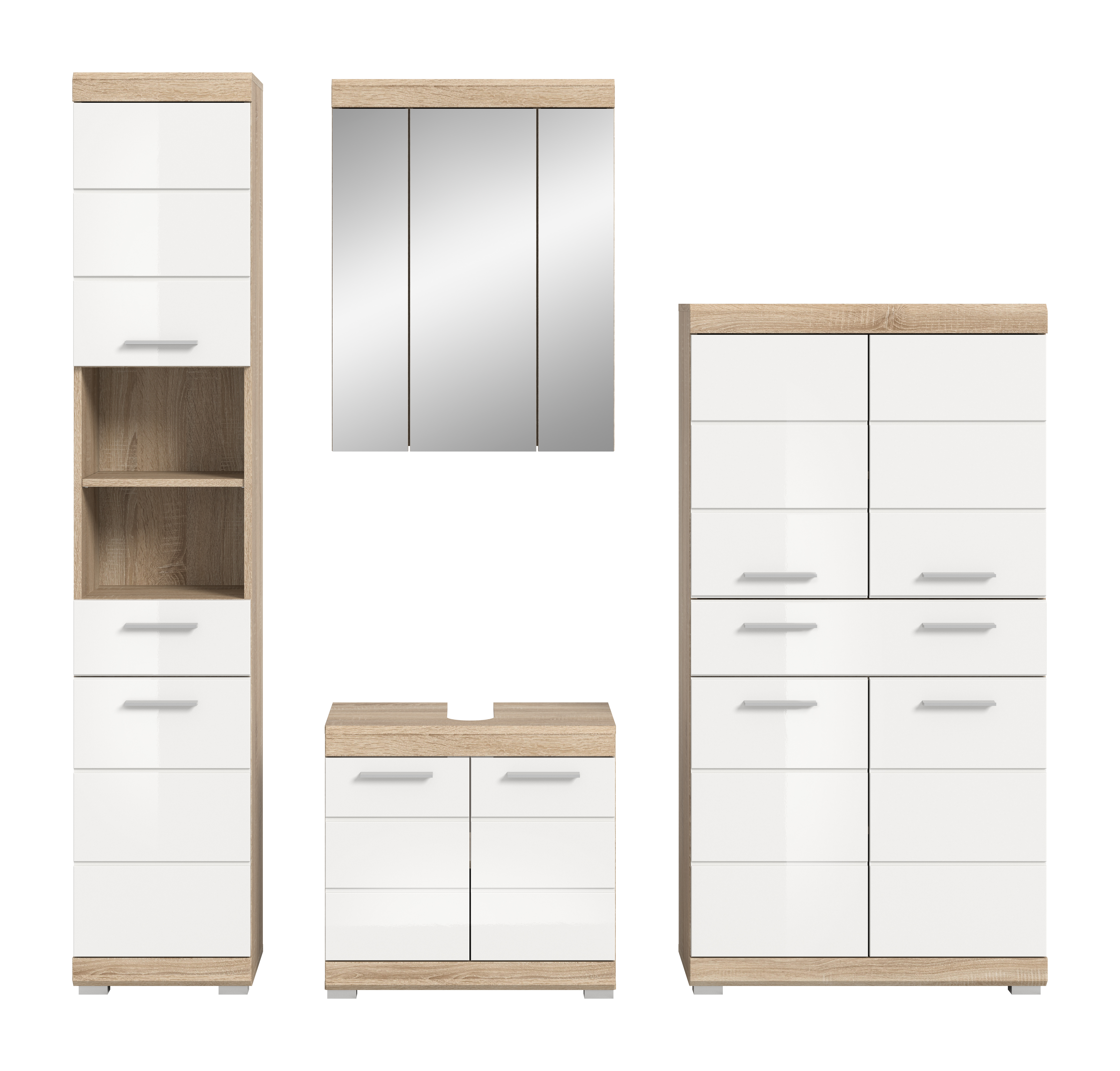 • Fonctionnalité : cette solution complète offre un espace de rangement généreux grâce à différents éléments comme le meuble sous lavabo, la colonne de salle de bains et l’armoire de toilette ; ceci permet une organisation efficace des accessoires de toilette et objets du quotidien.