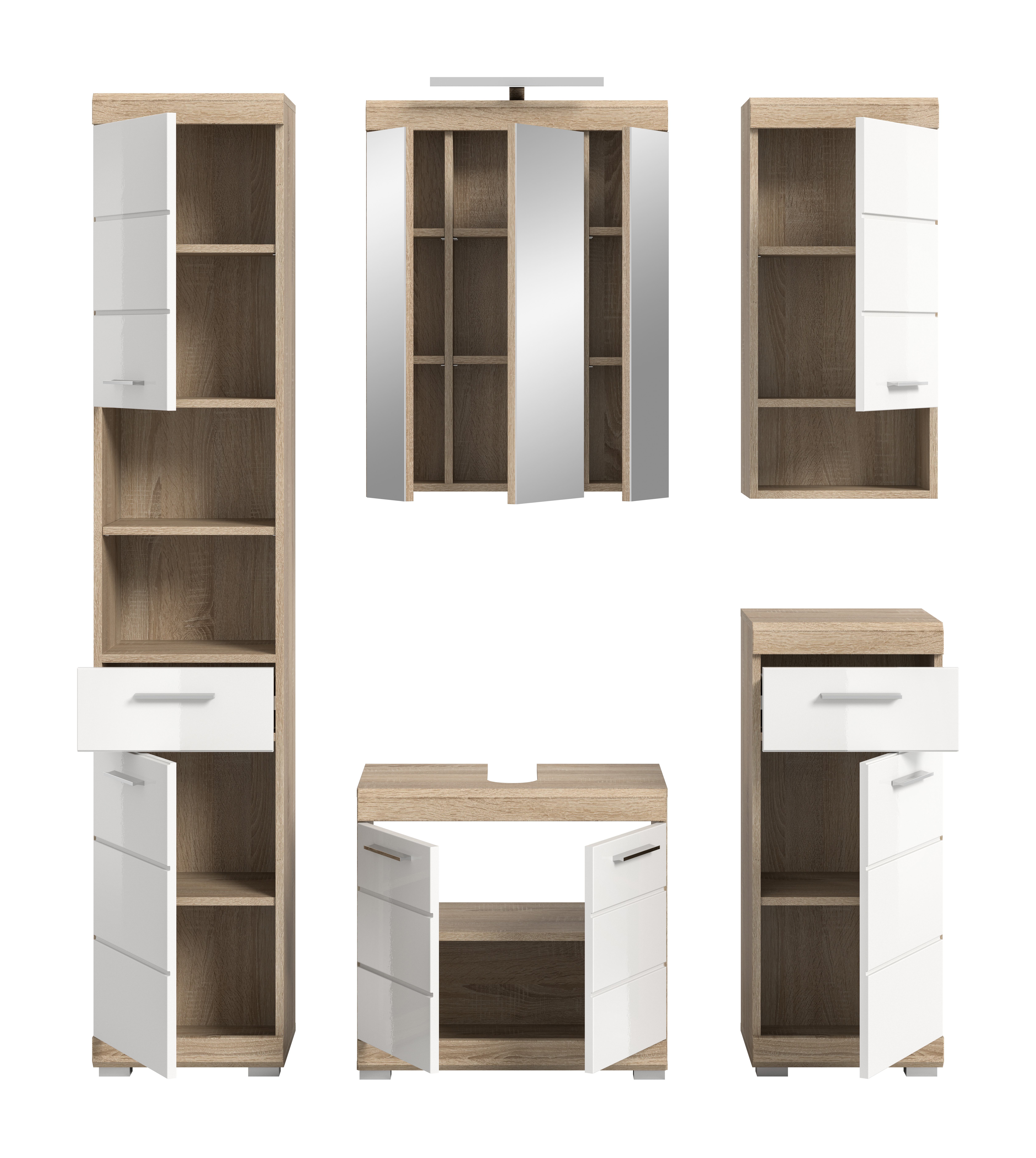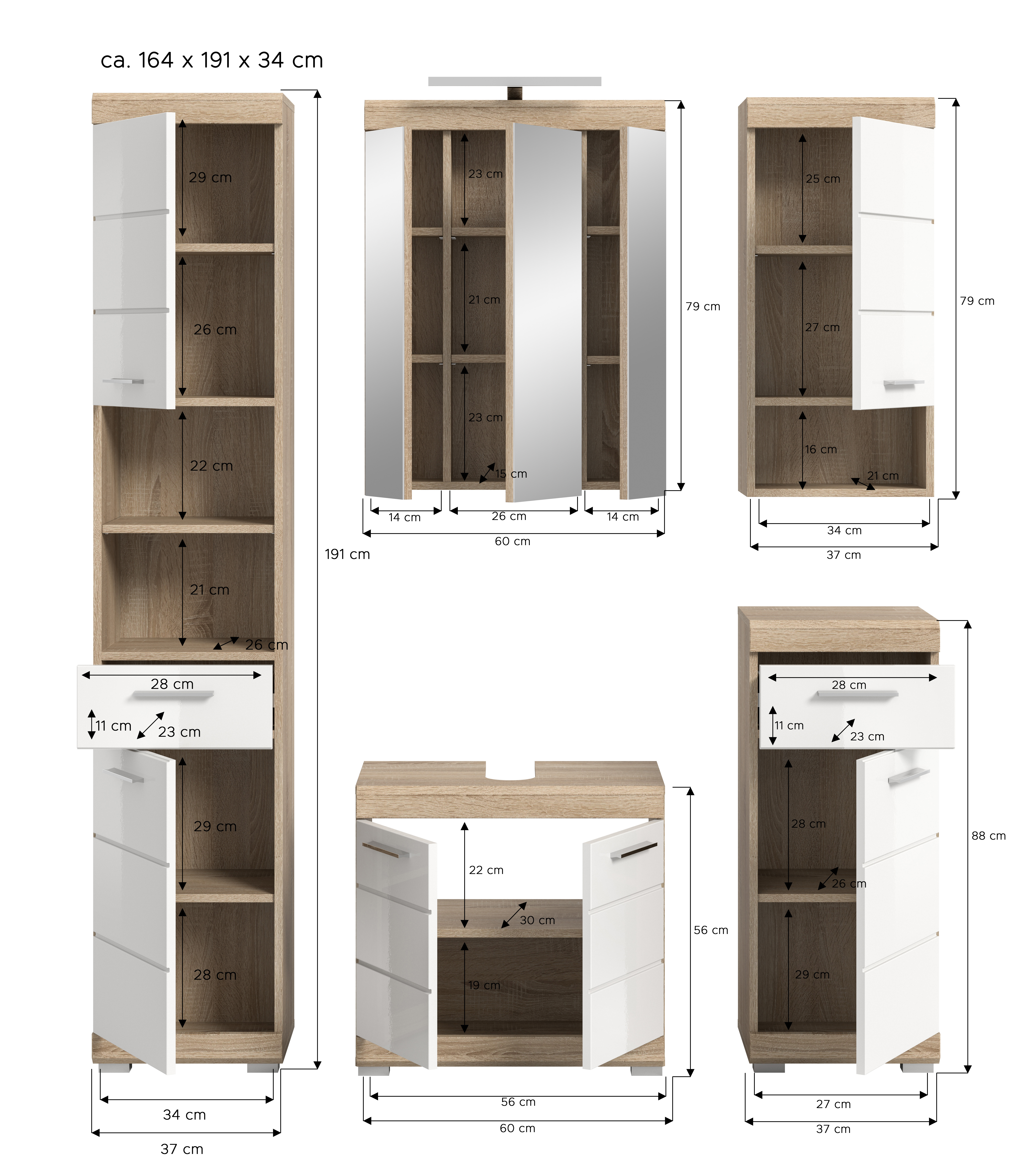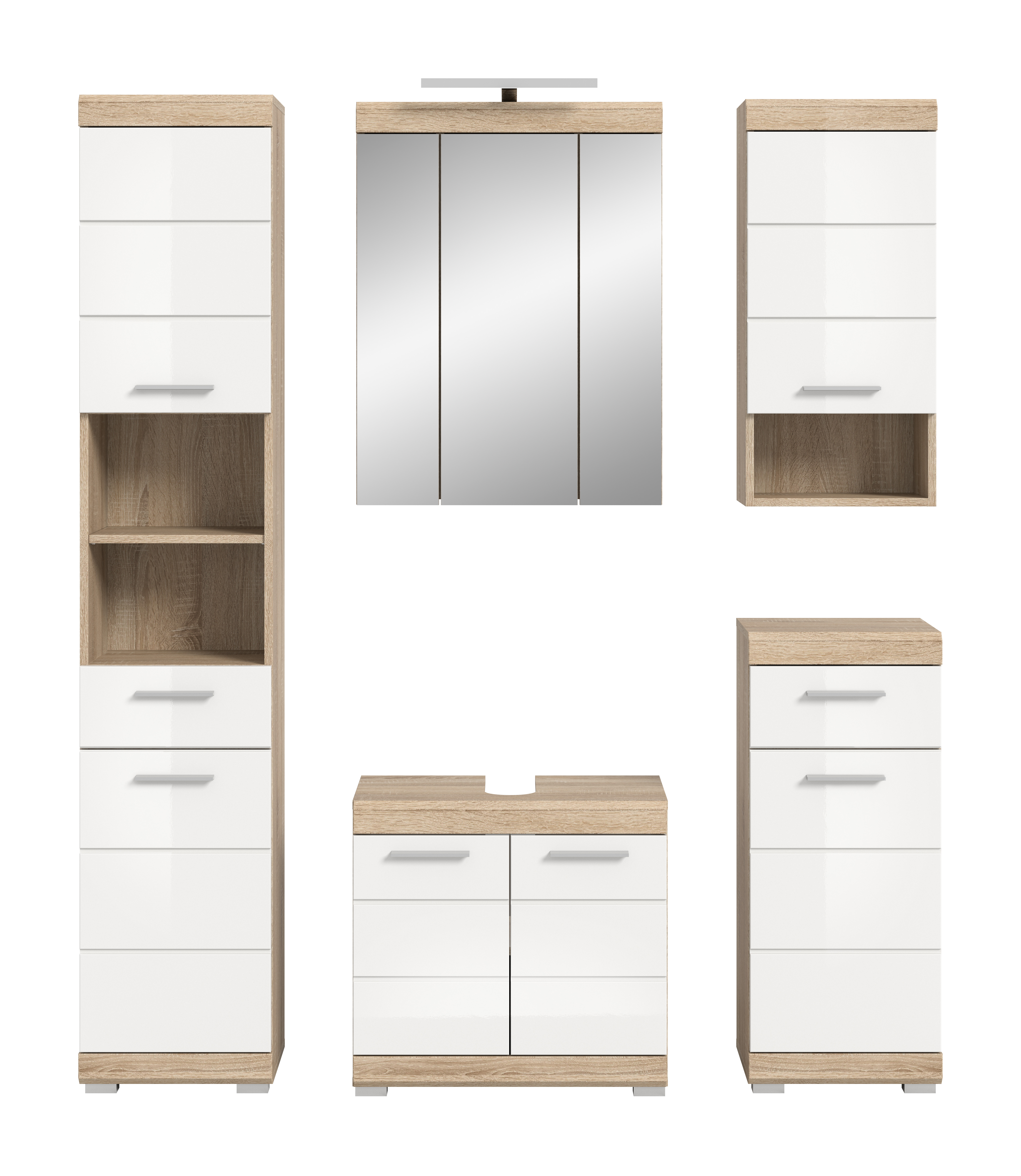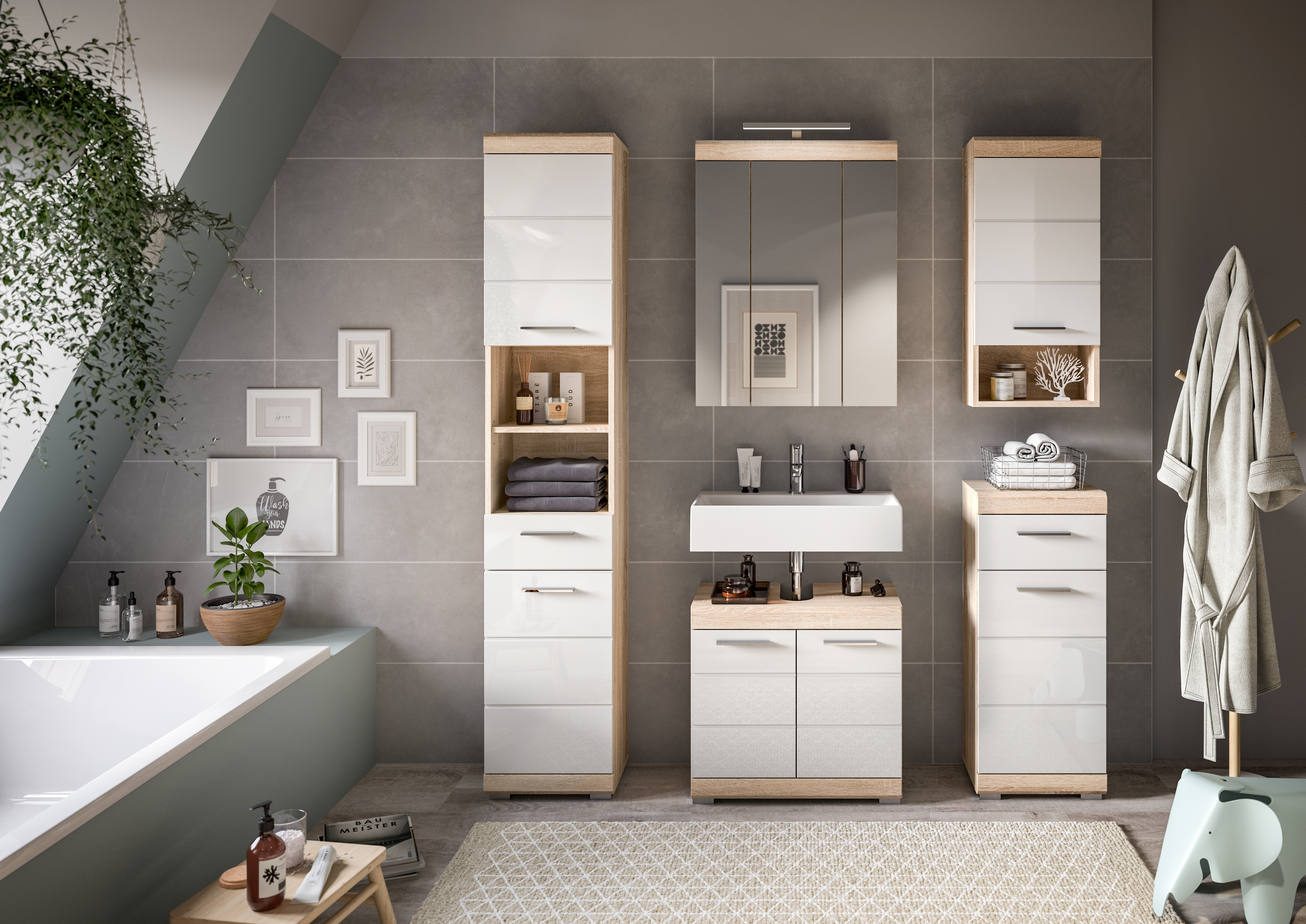 • Fonctionnalité : cette solution complète offre un espace de rangement généreux grâce à différents éléments comme le meuble sous lavabo, la colonne de salle de bains et l’armoire de toilette ; ceci permet une organisation efficace des accessoires de toilette et objets du quotidien.