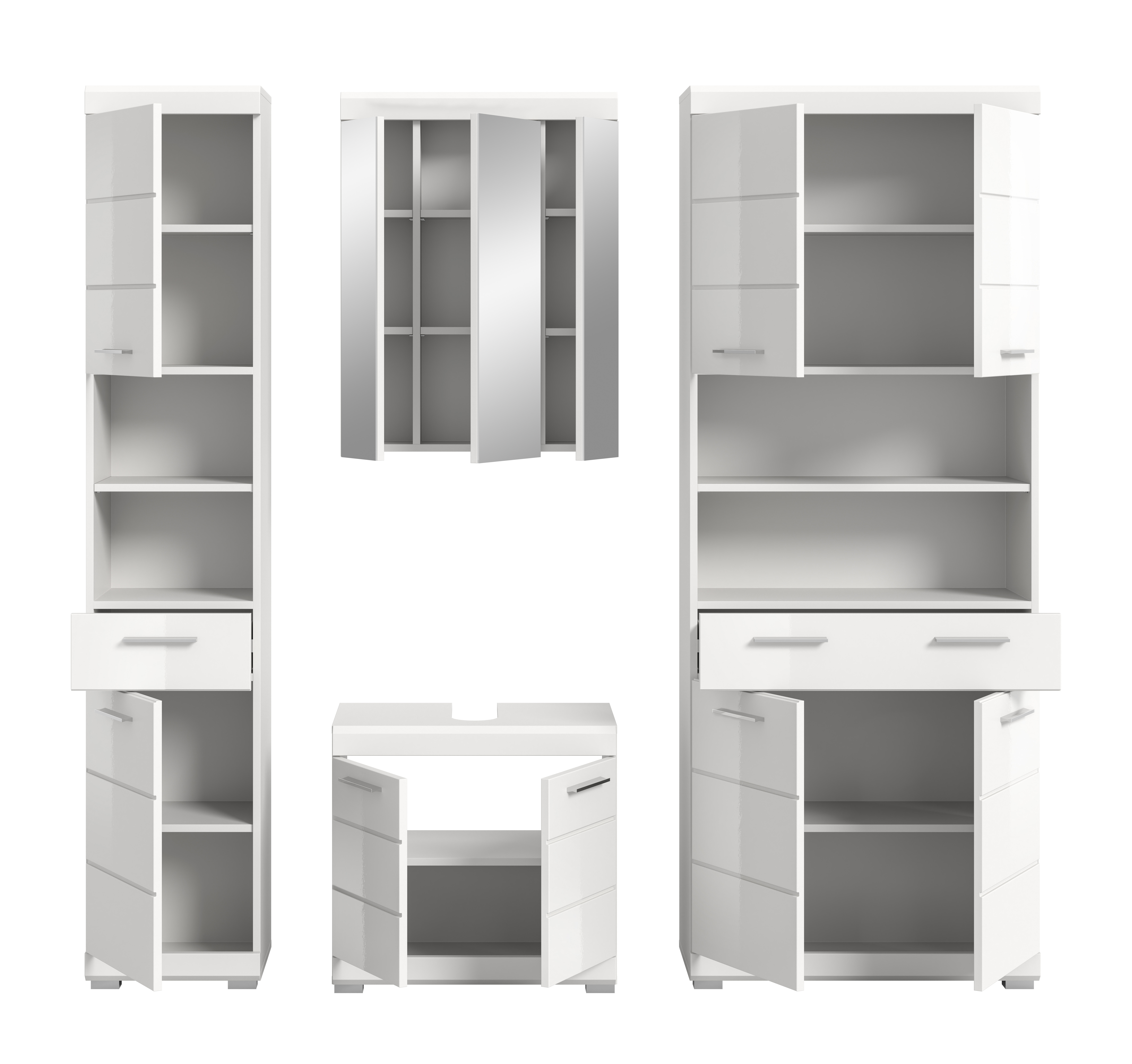 1 colonne de salle de bains avec 4 portes, 1 tiroir, 2 casiers ouverts, 2 tablettes fixes et 3 tablettes amovibles