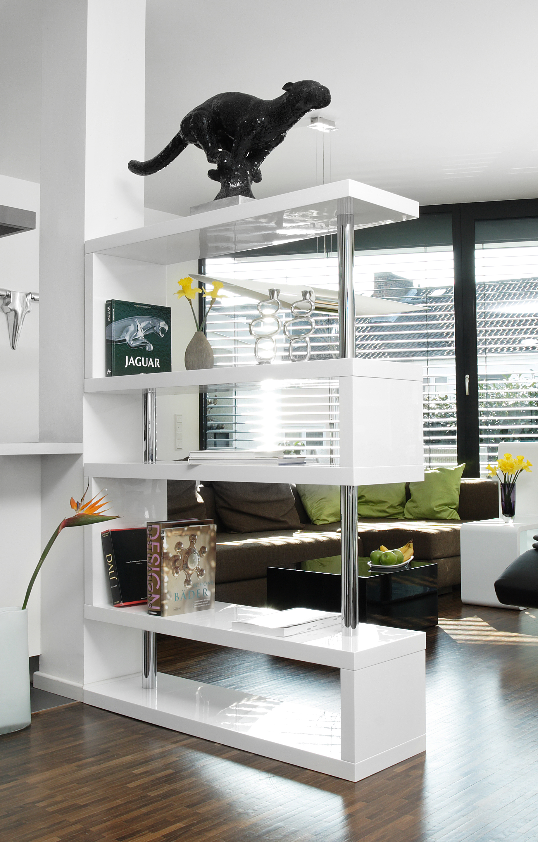 La solution idéale pour gagner de la place et disposer d’un grand espace de rangement. Ce séparateur de pièce dans un design épuré est fabriqué en bois MDF avec une couche de vernis ton blanc ultra brillant. Un autre point fort visuel de ce modèle, ce sont les barres en métal chromé qui s'harmonisent parfaitement avec le vernis blanc ultra brillant. Les quatre tablettes offrent un bel espace pour ranger les livres, classeurs, décorations et plus encore. Il est également possible de placer de petits paniers sur les étagères, de sorte que les objets rangés ne soient pas directement à la vue de tous. La bibliothèque peut être placée librement dans la pièce ou contre un mur. Une étagère fonctionnelle, polyvalente et stylée qui confèrera à votre espace de vie un charme fou sans trop s'imposer.