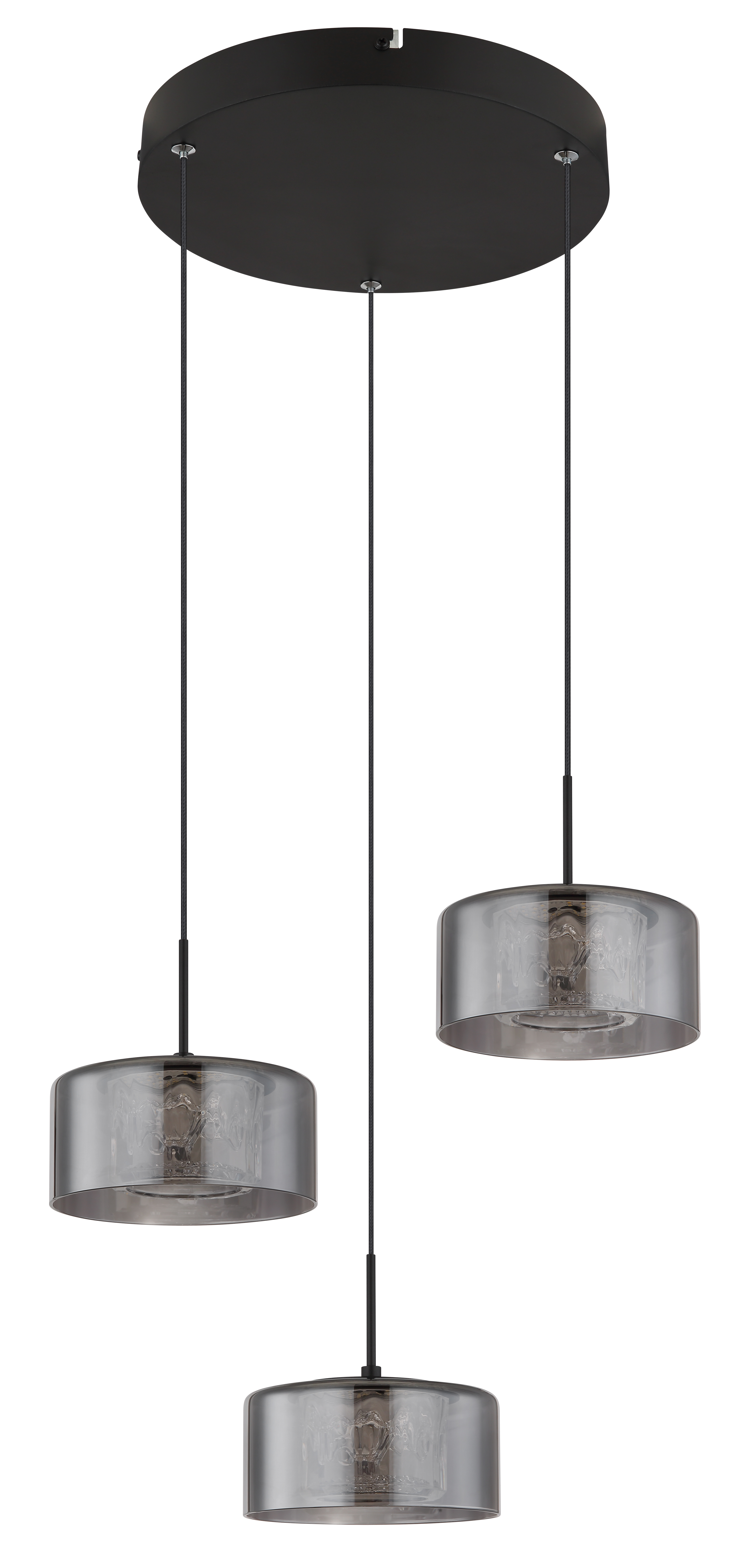 La suspension ronde au design moderne et élégant attirera tous les regards dans la pièce. La structure en métal noir mat et les abat-jours en verre fumé et acrylique transparent confèrent à la lampe un aspect élégant.
