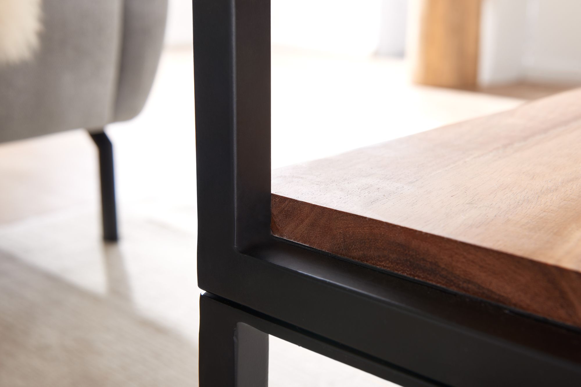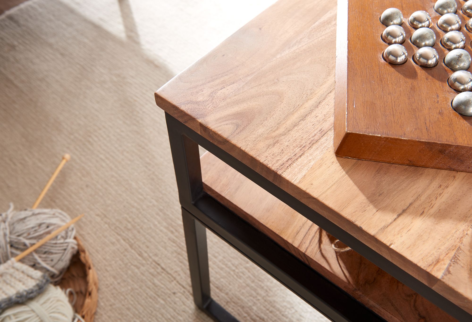 COMPOSITION ✔ Le plateau de table et la tablette sont fabriqués en bois d'acacia massif protégé par une couche de vernis transparent. Le piètement est en fer robuste avec finition époxy.