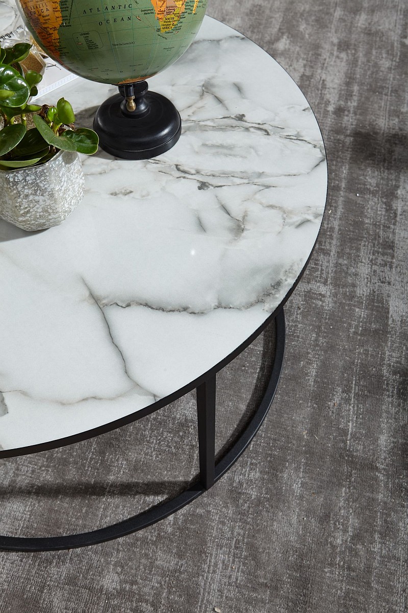 COMPOSITION ✔ Plateau de table : MDF filmé aspect marbre blanc avec revêtement protecteur en PVC // Piètement : acier finition époxy
