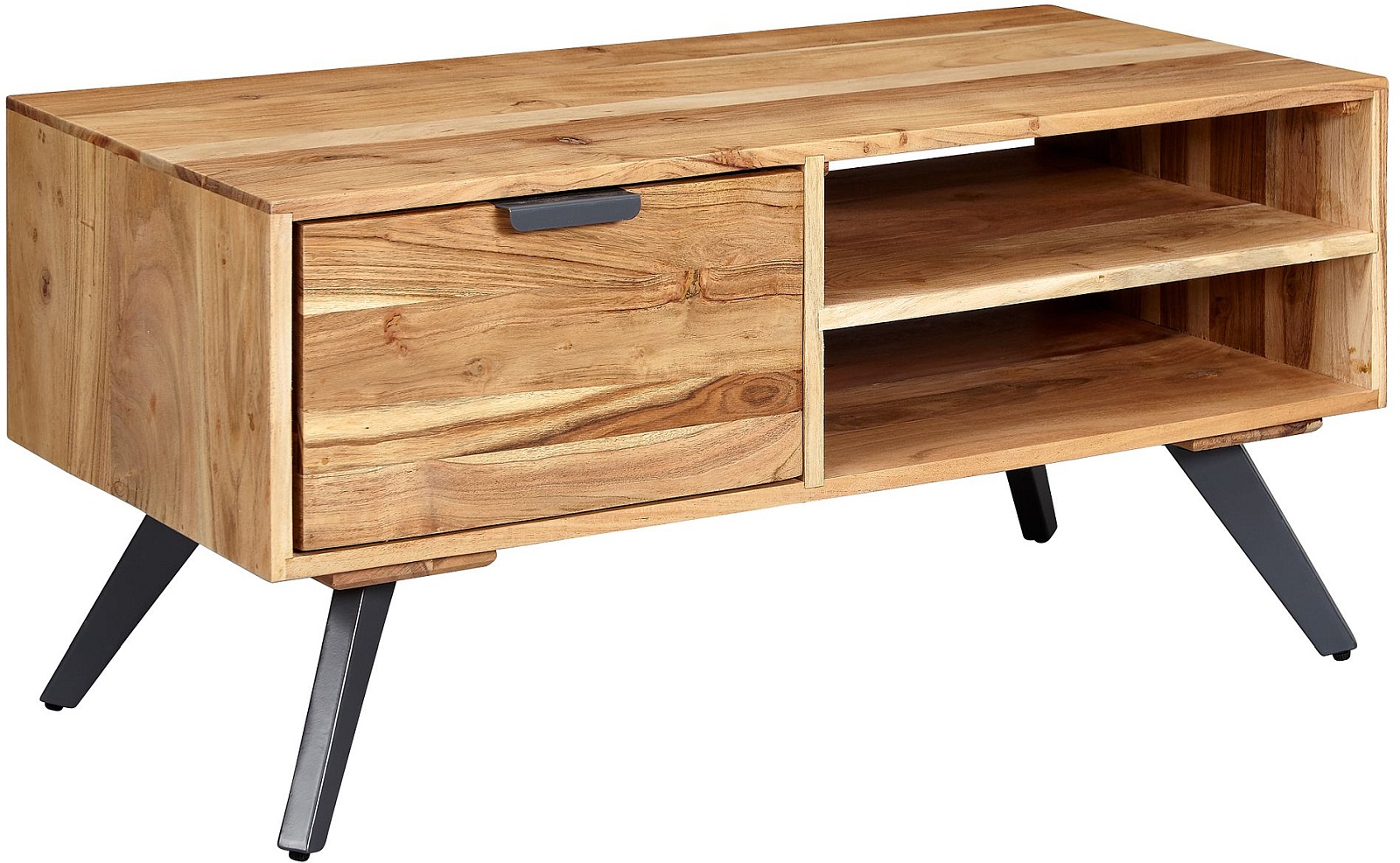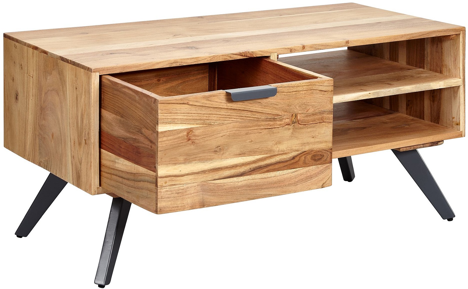 MEUBLE PRÉFÉRÉ ✔ Remarquable table de designer dans un mélange tendance de matériaux (bois et métal) pour les fans d'intérieur personnalisé. Une attention particulière est portée au design et au veinage original du bois de cette pièce unique. Le tiroir pratique et les casiers spacieux offrent un bel espace pour poser magazines, télécommande et autres objets, et pour rendre votre soirée télé à la fois particulière & originale.