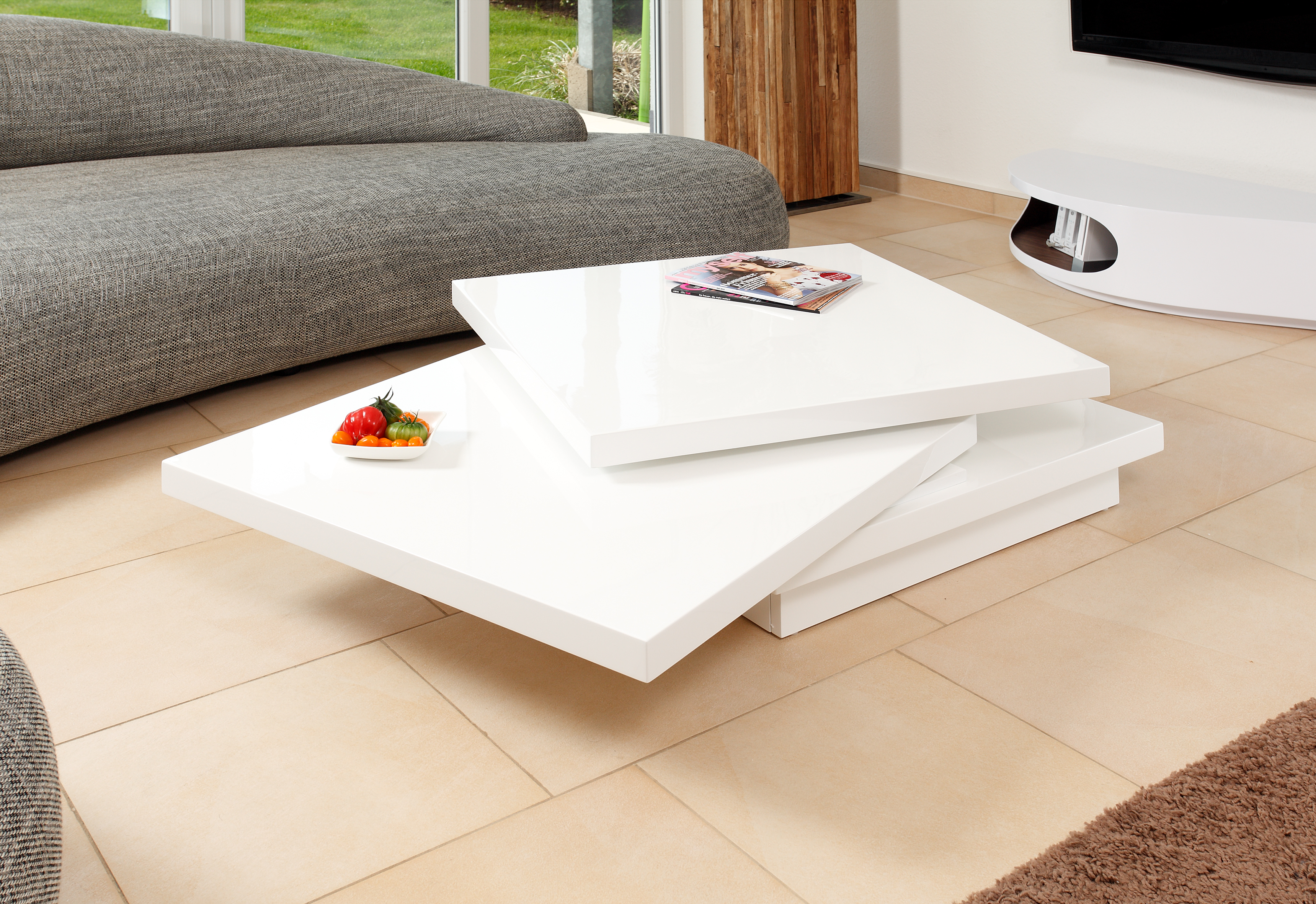 La table basse attire les regards grâce à son design original. Des lignes claires et une forme inhabituelle s'associent dans un meuble moderne. La surface laquée ton blanc ultra brillant apporte une touche glamour supplémentaire. Grâce aux plateaux de table pivotant à 360 degrés, la surface utile peut être étendue à 160 cm. Ainsi, les plateaux peuvent être tournés à volonté dans la direction souhaitée. Vous et vos invités allez adorer cette fonction pratique ! La table de salon design offre suffisamment de possibilités de rangement pour les boissons, les snacks, les magazines ou autres. Ce petit bijou vous fera vite tourner la tête.