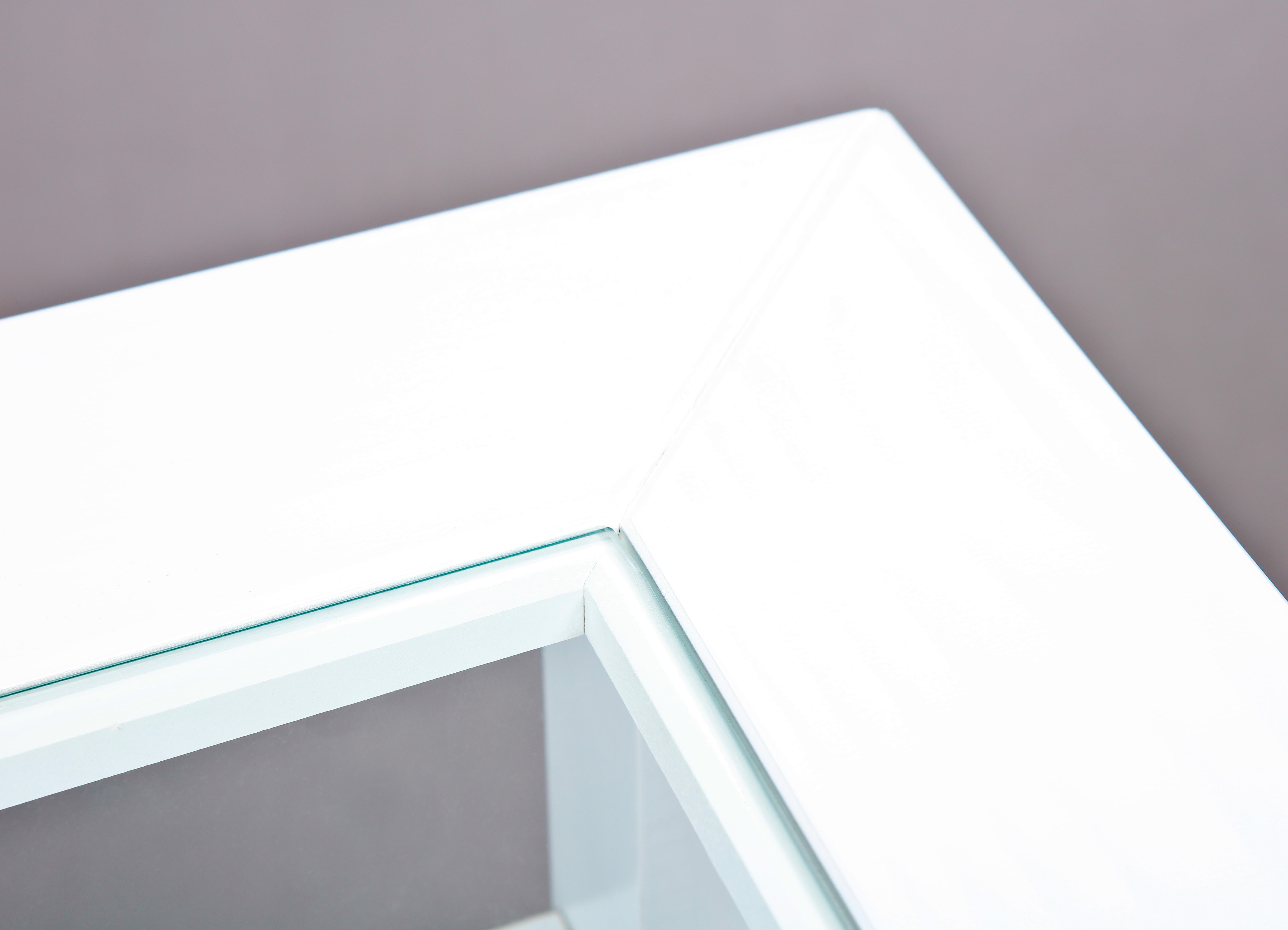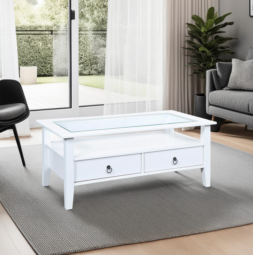 Bois de pin massif (Brésil) laqué blanc  avec plateau de table en verre de sécurité transparent intégré.