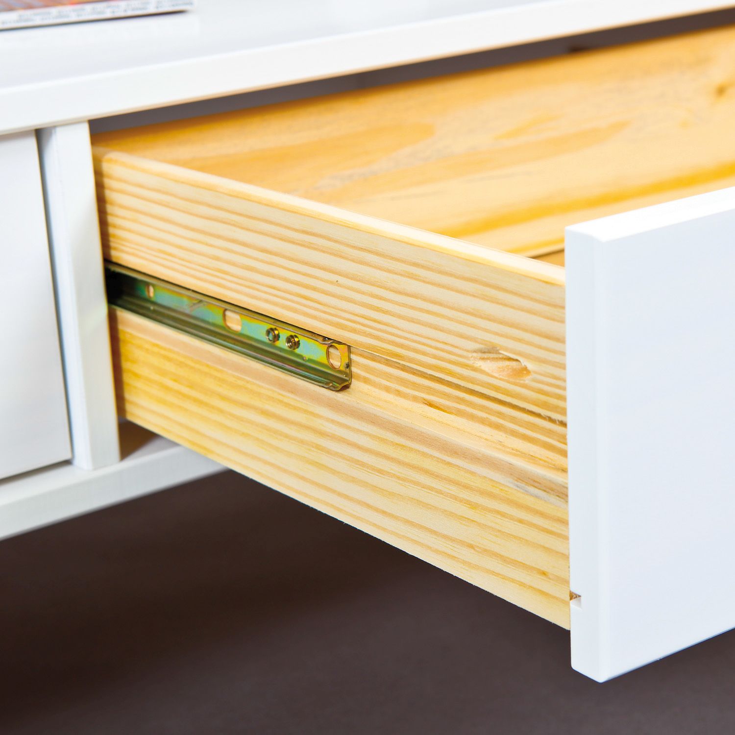 Les tiroirs sont montés sur des rails métalliques ce qui garantit une utilisation fluide et confortable. La poignée en métal constitue un gage de qualité supplémentaire et complète le design élégant. Les pieds fuselés apportent au meuble un charme particulier et soulignent le style maison de campagne.