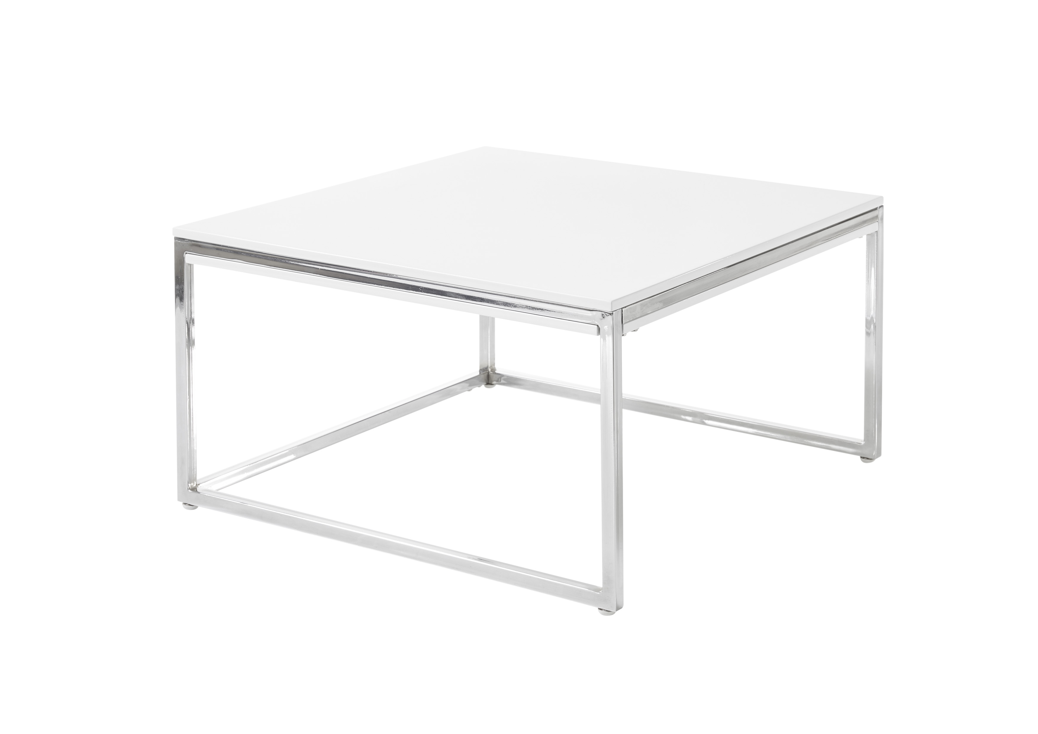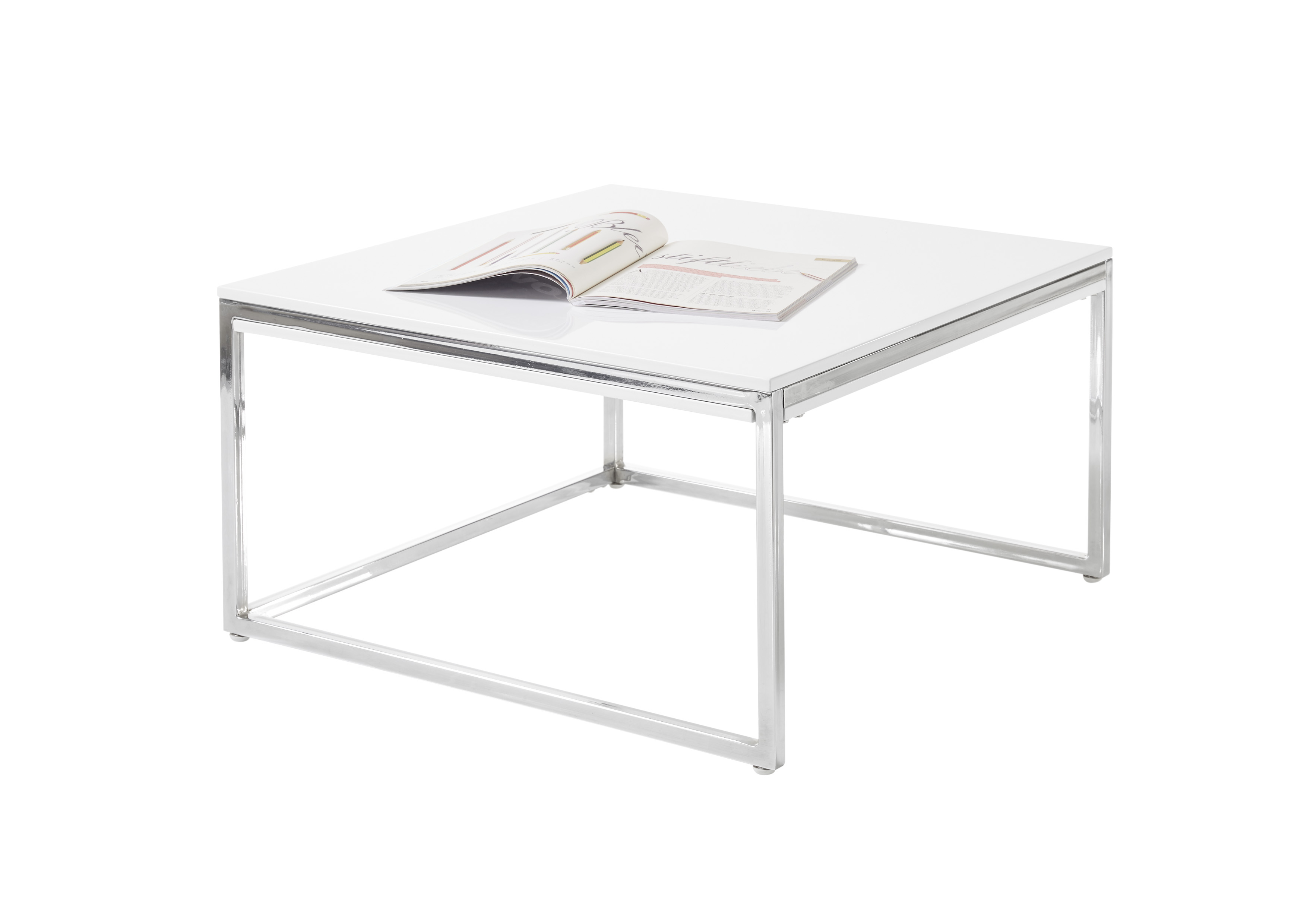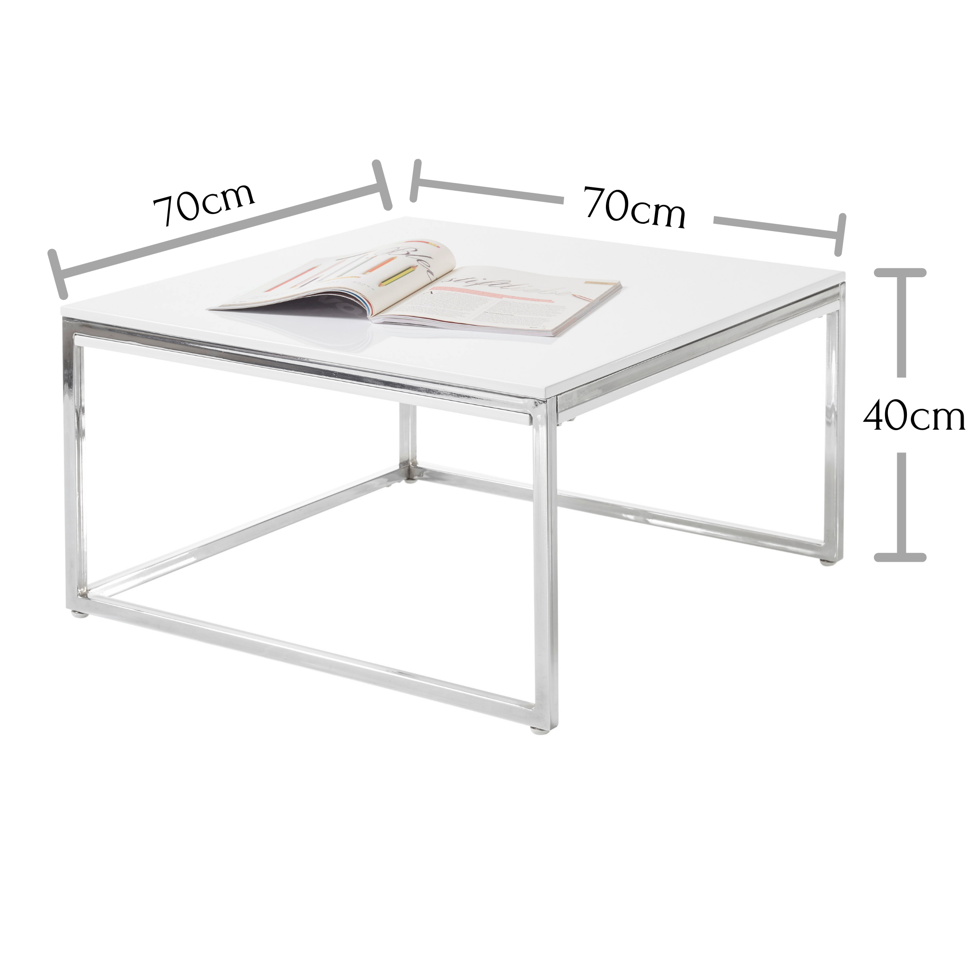 Cette table basse moderne séduit par son design élégant avec un plateau en MDF laqué blanc brillant et un piètement métallique chromé stable, idéal pour les salons contemporains.