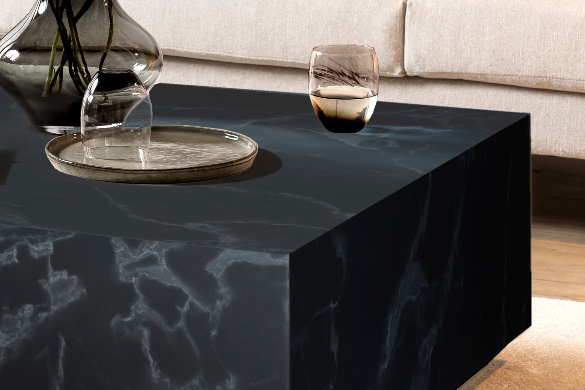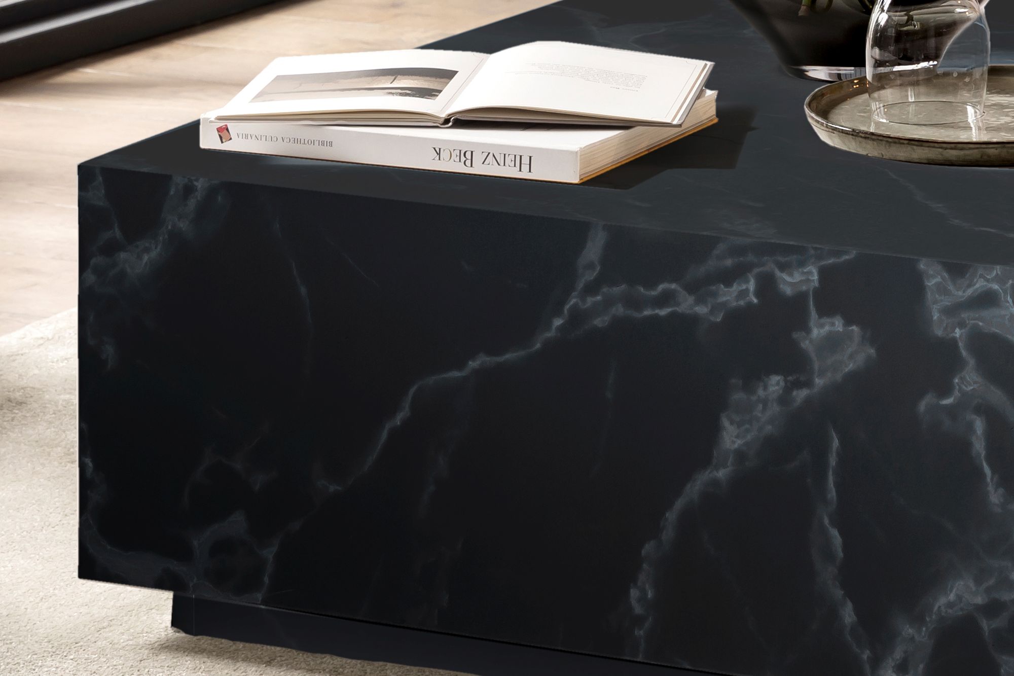 Cette table basse chic confèrera instantanément un aspect élégant à votre salon. La forme simple en cube avec une grande surface de rangement met particulièrement en valeur le superbe aspect marbré ton noir. La faible hauteur confèrera un côté "lounge" à votre intérieur.