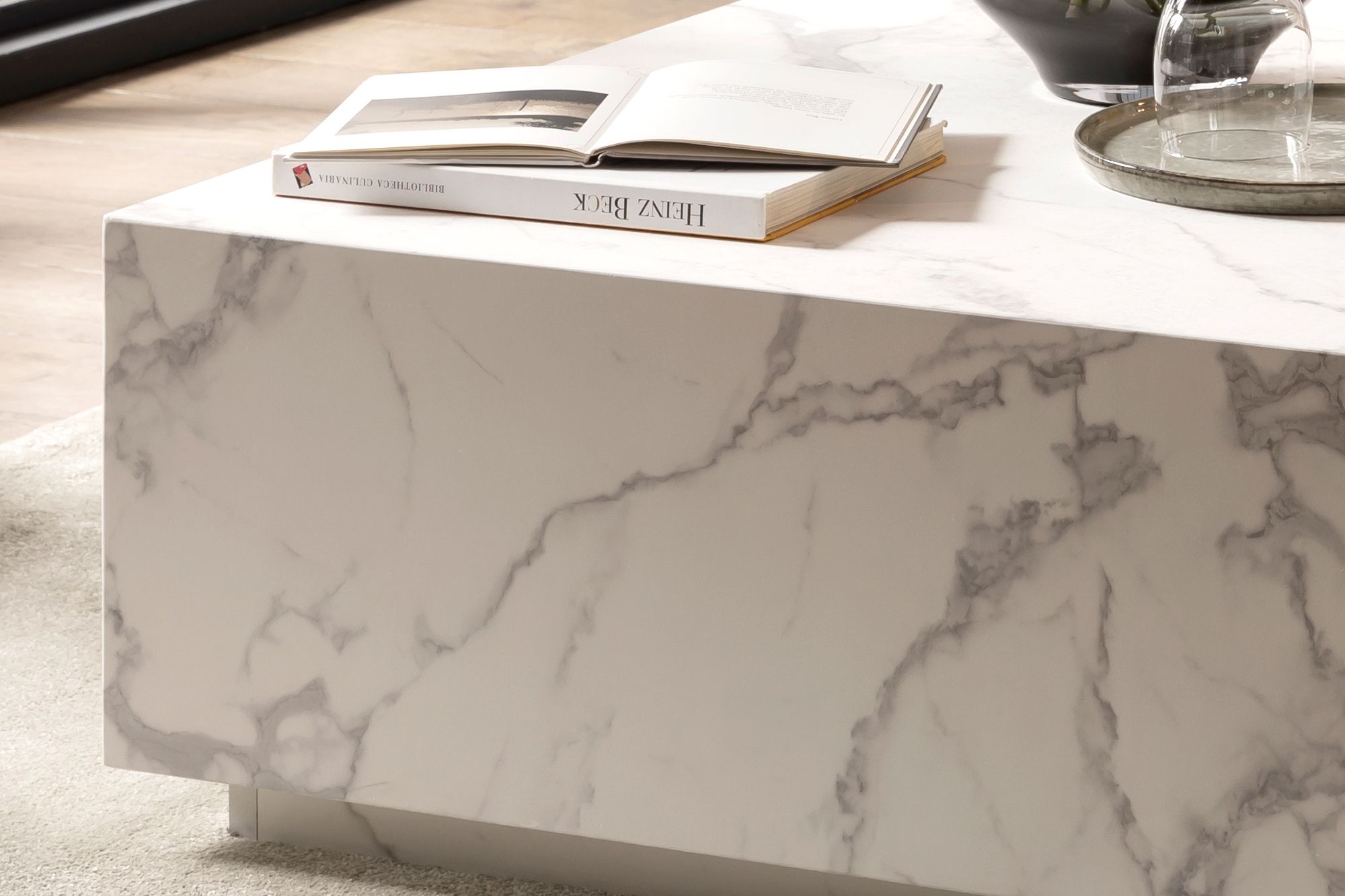 Cette table basse chic confèrera instantanément un aspect élégant à votre salon. La forme simple en cube avec une grande surface de rangement met particulièrement en valeur le superbe aspect marbré ton blanc. La faible hauteur confèrera un côté "lounge" à votre intérieur.