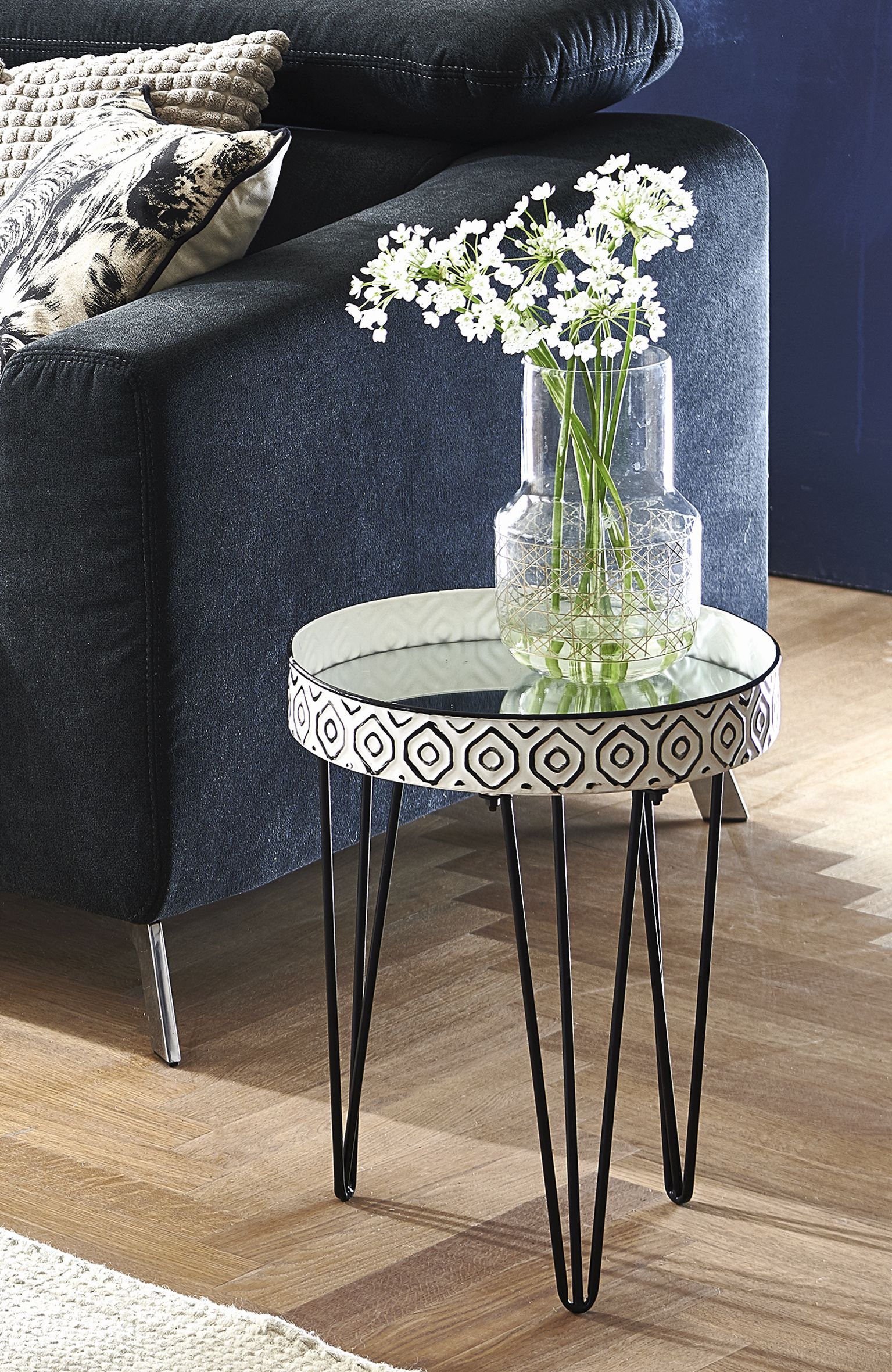 Plateau de table : métal laqué ton noir et blanc avec un plateau intérieur en verre miroir