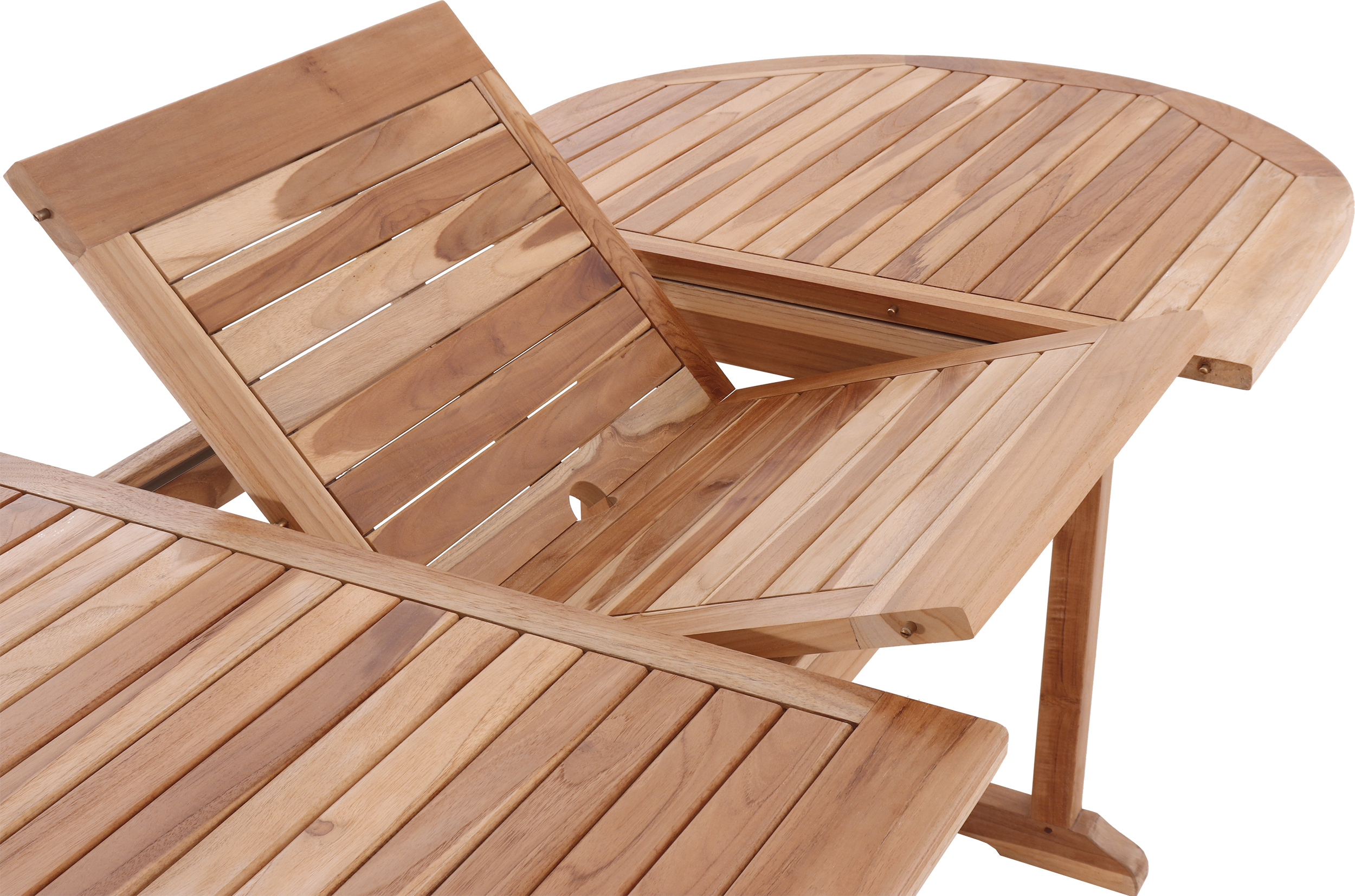 Cette table de jardin qui séduit par son aspect élégant mettra joliment en valeur votre terrasse ou votre balcon. Le plateau de table ovalefabriqué en bois de teck est extensible jusqu'à 240 cm en un tour de main de façon à pouvoir accueillir les visiteurs passant à l'improviste. Les matériaux de qualité et son aspect fonctionnel font de cette table de jardin le compagnon idéal pour des heures de détente et de plaisir à l'extérieur. De plus, la table de repas dispose d'une encoche pour le parasol.