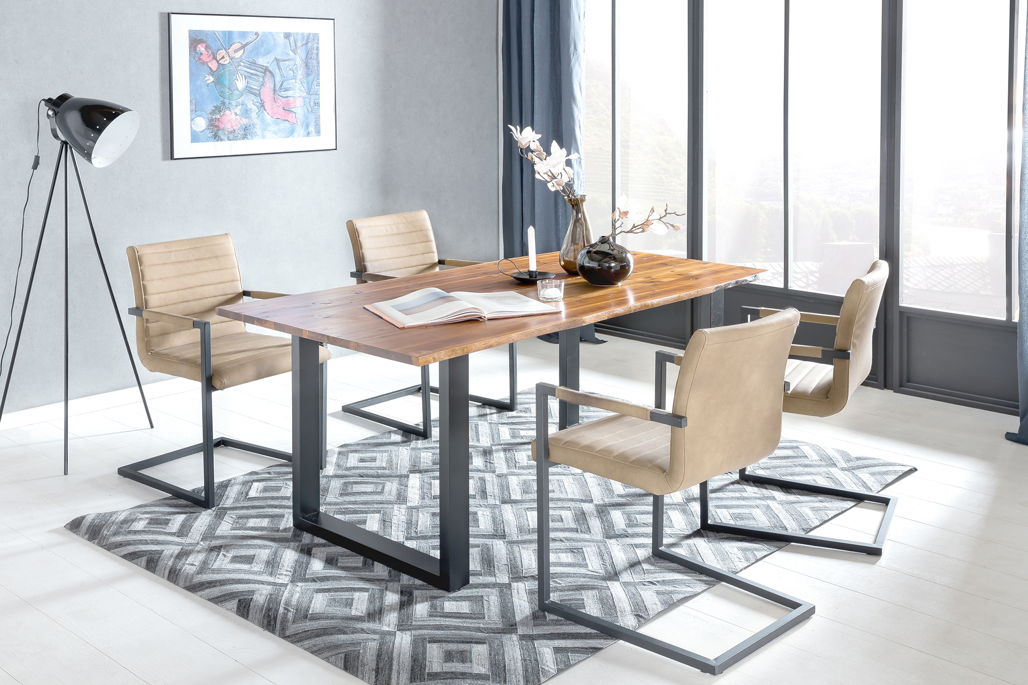 Les meubles en bois massif d'acacia font partie d'un mobilier à la fois beau et intemporel qui n'est jamais démodé. Le plateau de 26 mm d'épaisseur en bois d'acacia a été fabriqué à partir d'une planche à flache véritable. Le piètement en U en métal laqué ton noir confère à la table une très bonne stabilité et représente un contraste bienvenu avec le joli plateau ton cognac. Cette table de salle à manger est bien plus qu'un endroit pour prendre le repas. Faites entrer un peu de nature dans votre intérieur. Étant donné que cette table en bois massif est un produit naturel, elle peut présenter des nœuds et différentes teintes de bois qui ne sont toutefois pas des imperfections, mais qui soulignent plutôt le caractère individuel du bois véritable. Même la profondeur peut varier de plusieurs centimètres en raison de la forme irrégulière et asymétrique. Tous ces détails font de cette table avec plateau à flache une pièce véritablement unique.