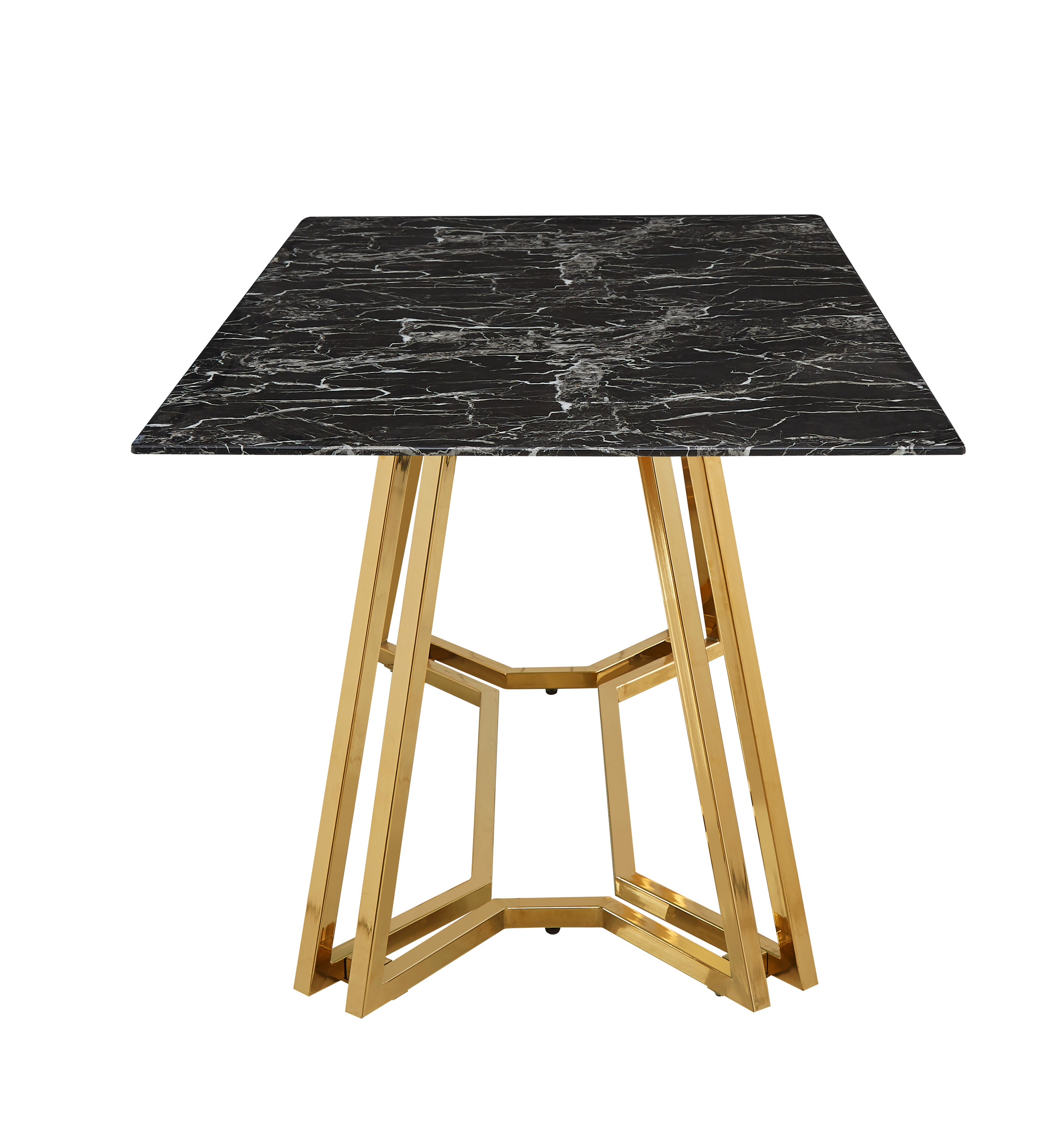 Cette table à dîner va devenir le nouveau cœur de votre coin repas ! Le plateau de table ton noir aspect marbre est fabriqué en verre. Le piètement doré n'est pas seulement stylé, mais confère aussi à la table une excellente stabilité et s'harmonise parfaitement avec le plateau en verre noir. Les meubles aspect marbre sont ultra tendance et s'intègrent facilement dans presque tous les intérieurs. Cette table vous apportera bien plus qu'un simple espace pour prendre les repas quotidiens. Vous pourrez ici aussi profiter de longues discussions entre amis, en famille ou avec vos clients.