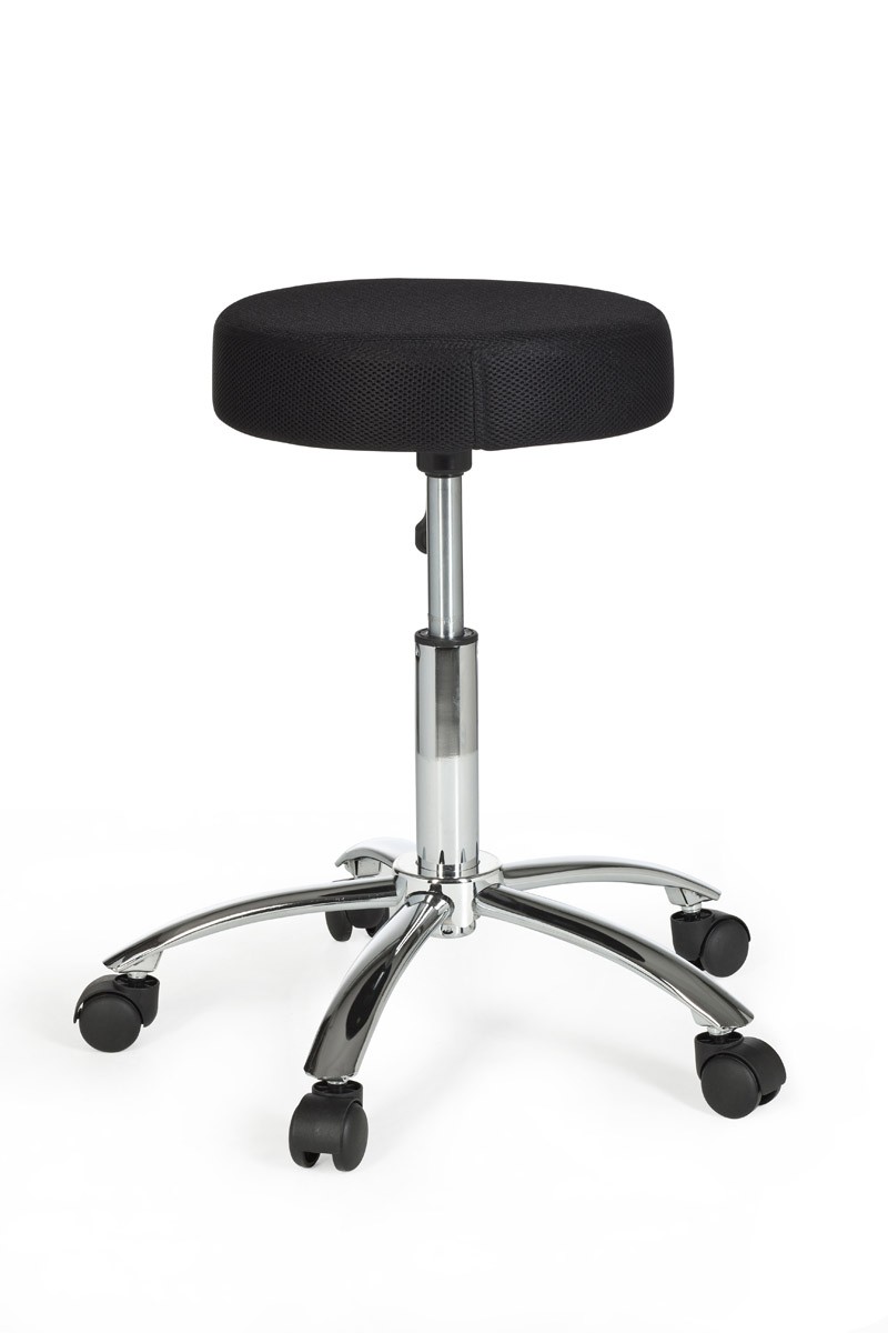 Tabouret de travail robuste avec assise recouverte d'un tissu résille (mesh) ton noir.