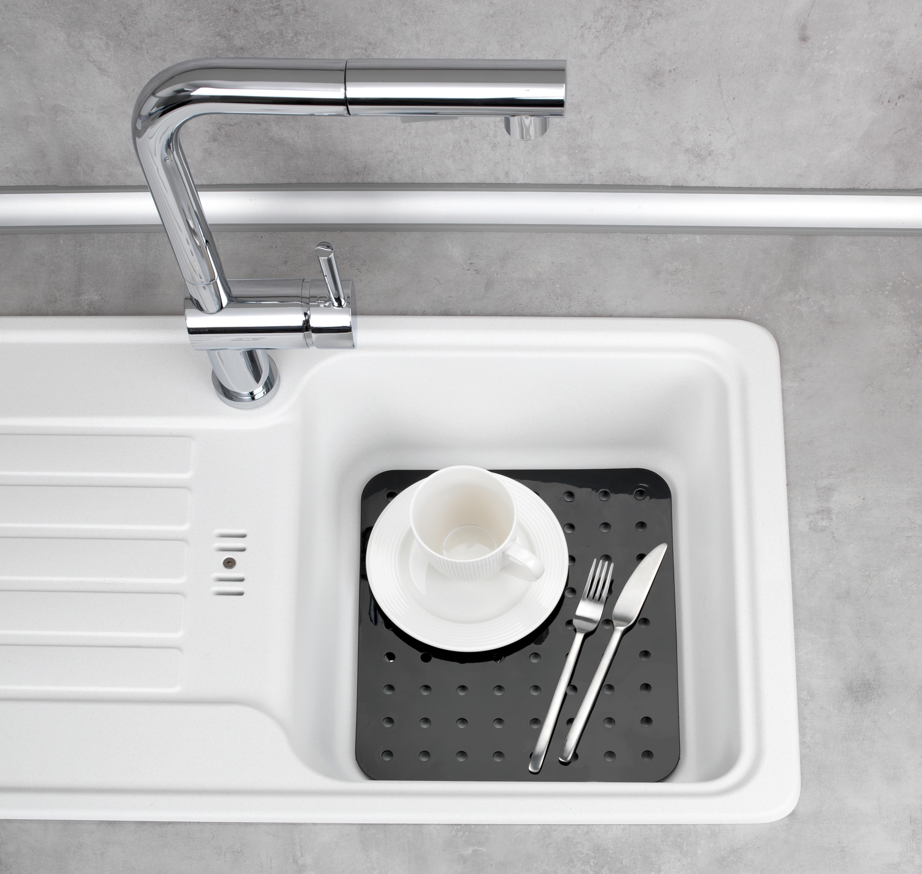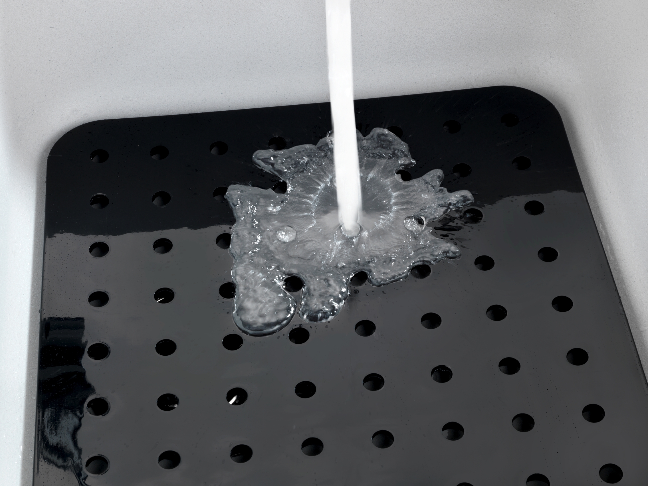 Le tapis d'évier Kristall est lourd et ultra épais ; il protège l'évier des rayures et préserve les verres et la vaisselle. La surface ajourée permet de diminuer nettement les éclaboussures lorsqu'on ouvre le robinet ou le mitigeur. Les grands trous permettent ensuite à l'eau de rinçage de s'écouler très facilement. Le tapis d'évier de qualité supérieure en plastique souple permet de poser les verres à vin en douceur dans l'évier et de faire moins de bruit en faisant la vaisselle. La transparence du tapis est du plus bel effet. Le tapis est idéal pour les éviers rectangulaires et passe au lave-vaisselle.