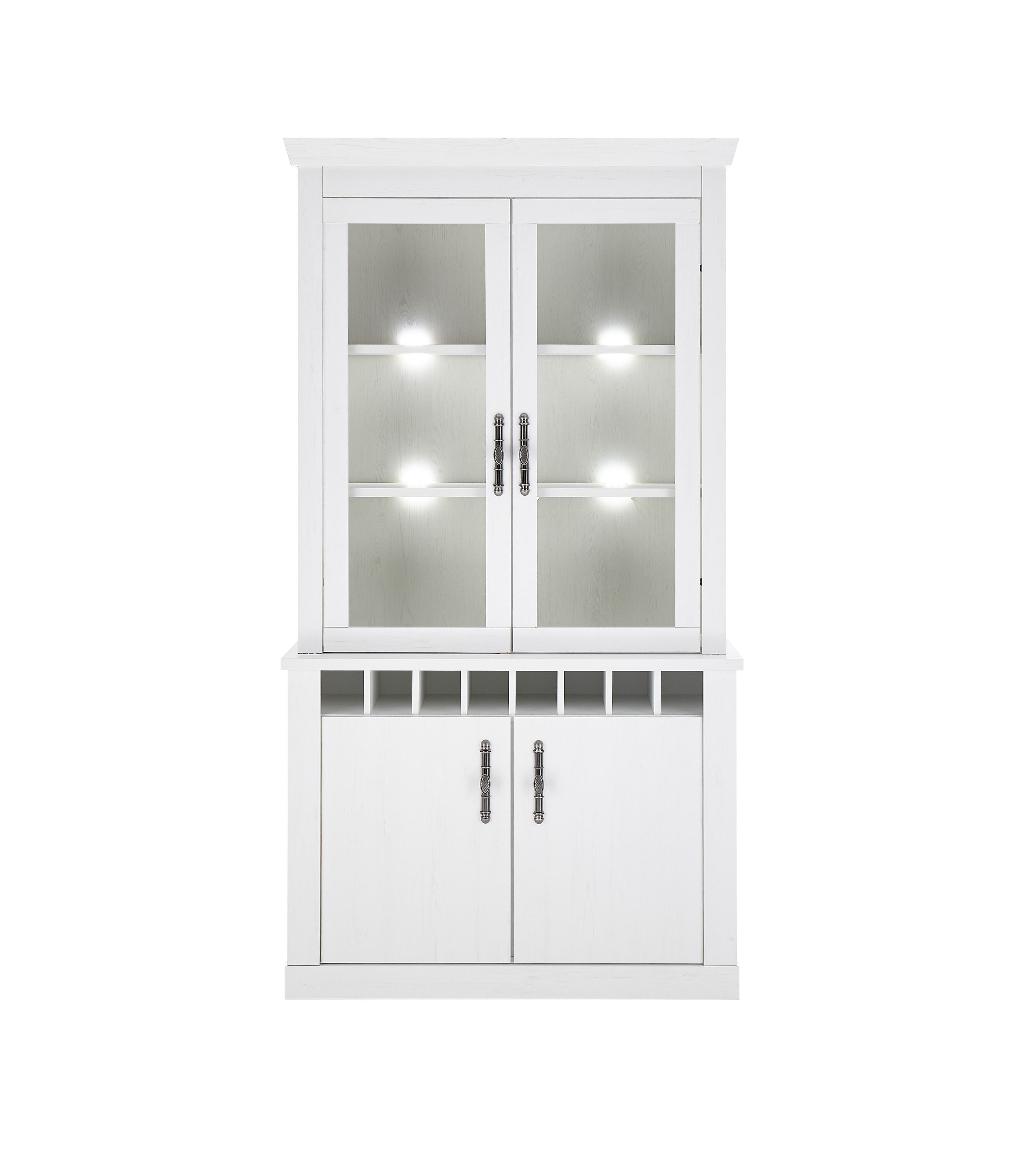 Partie supérieure comprenant 2 portes en verre avec encadrement et, derrière chacune d’elles, 2 tablettes en verre