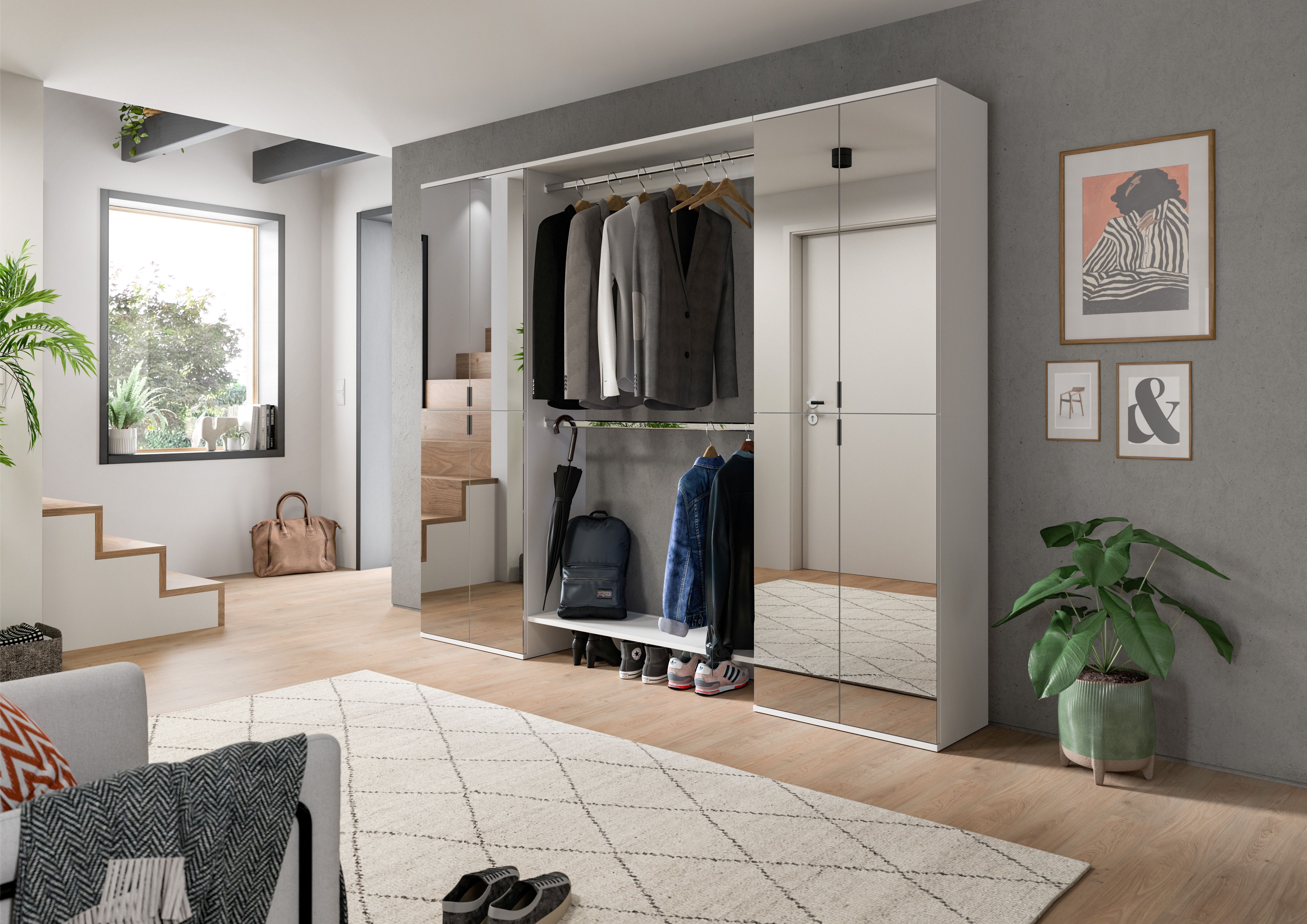 Notre vestiaire combiné ton blanc ultra brillant est la solution idéale pour les amateurs de style. Avec ses dimensions généreuses (L/H/P : 232x191x37 cm), il allie fonctionnalité et esthétique. Cet ensemble se compose de deux armoires d’entrée avec façade miroir et d’un élément penderie intermédiaire pour vous aider à organiser efficacement votre rangement. Son design moderne apportera une touche contemporaine et élégante à votre entrée. Optimisez votre espace de rangement et créez une atmosphère accueillante dans votre intérieur avec cet ensemble !