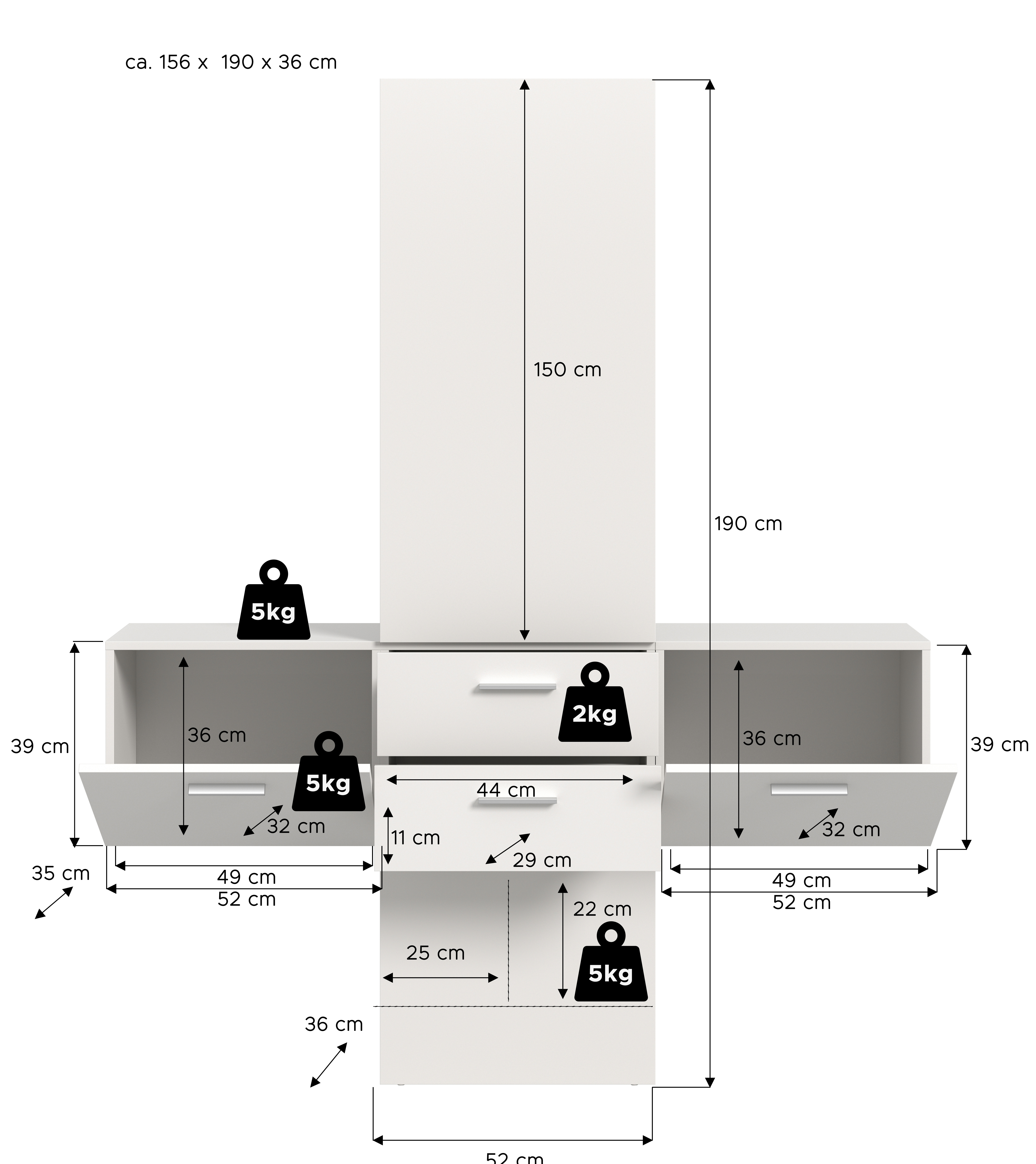 | Dimensions : | L/H/P env. 156/190/36 cm | ||
