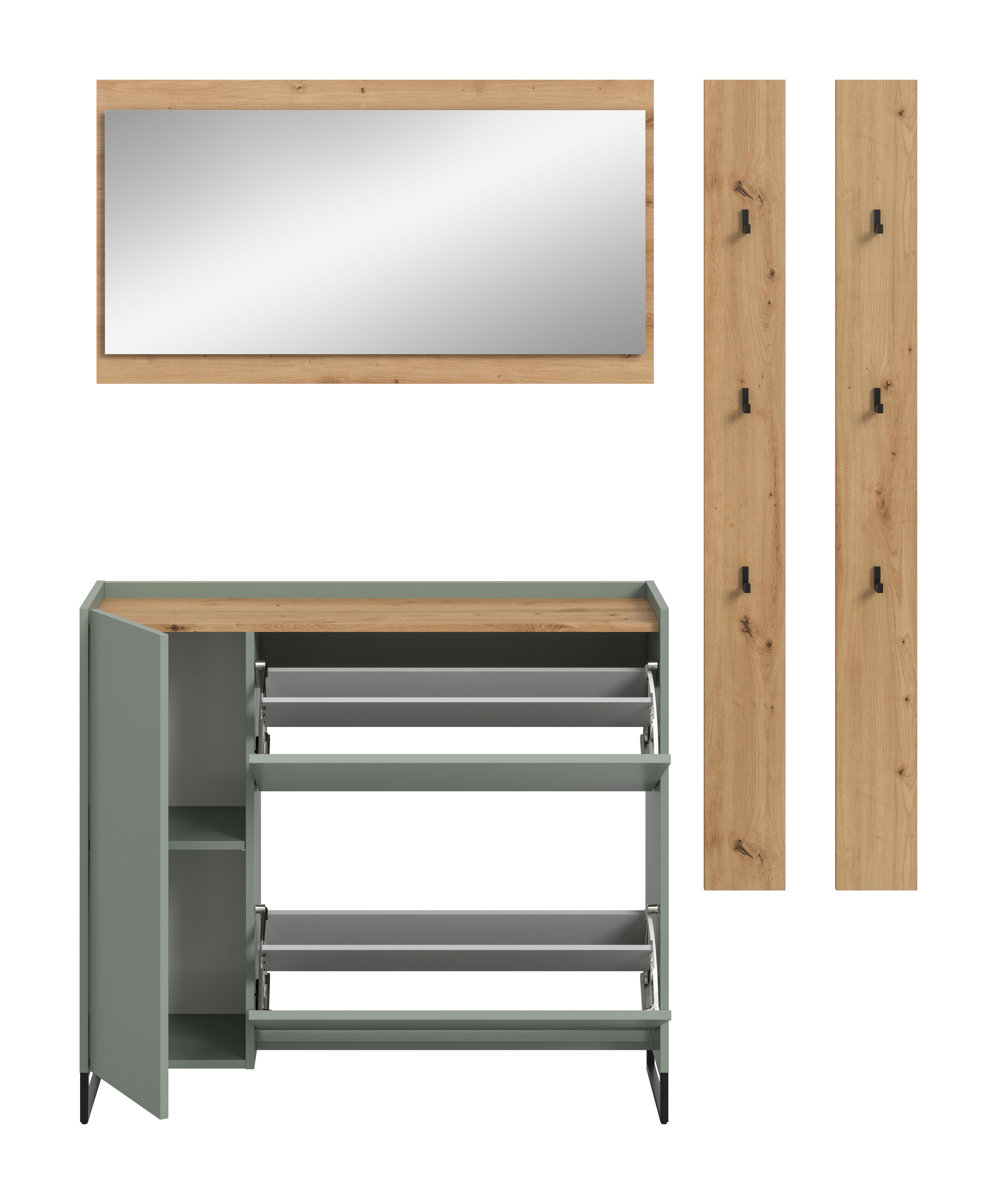 Ce vestiaire combiné 4 éléments se compose d’un meuble à chaussures, d’un miroir et de 2 panneaux portemanteaux – une solution idéale pour disposer d’un bel espace de rangement. Dimensions : L/H/P : 172 x 192 x 32 cm. Le bois composite certifié FSC® est synonyme de durabilité. La surface facile d’entretien et le montage simple de cet ensemble facilitent l’utilisation au quotidien. Il peut être complété par d’autres articles de la série pour un intérieur organisé et stylé.