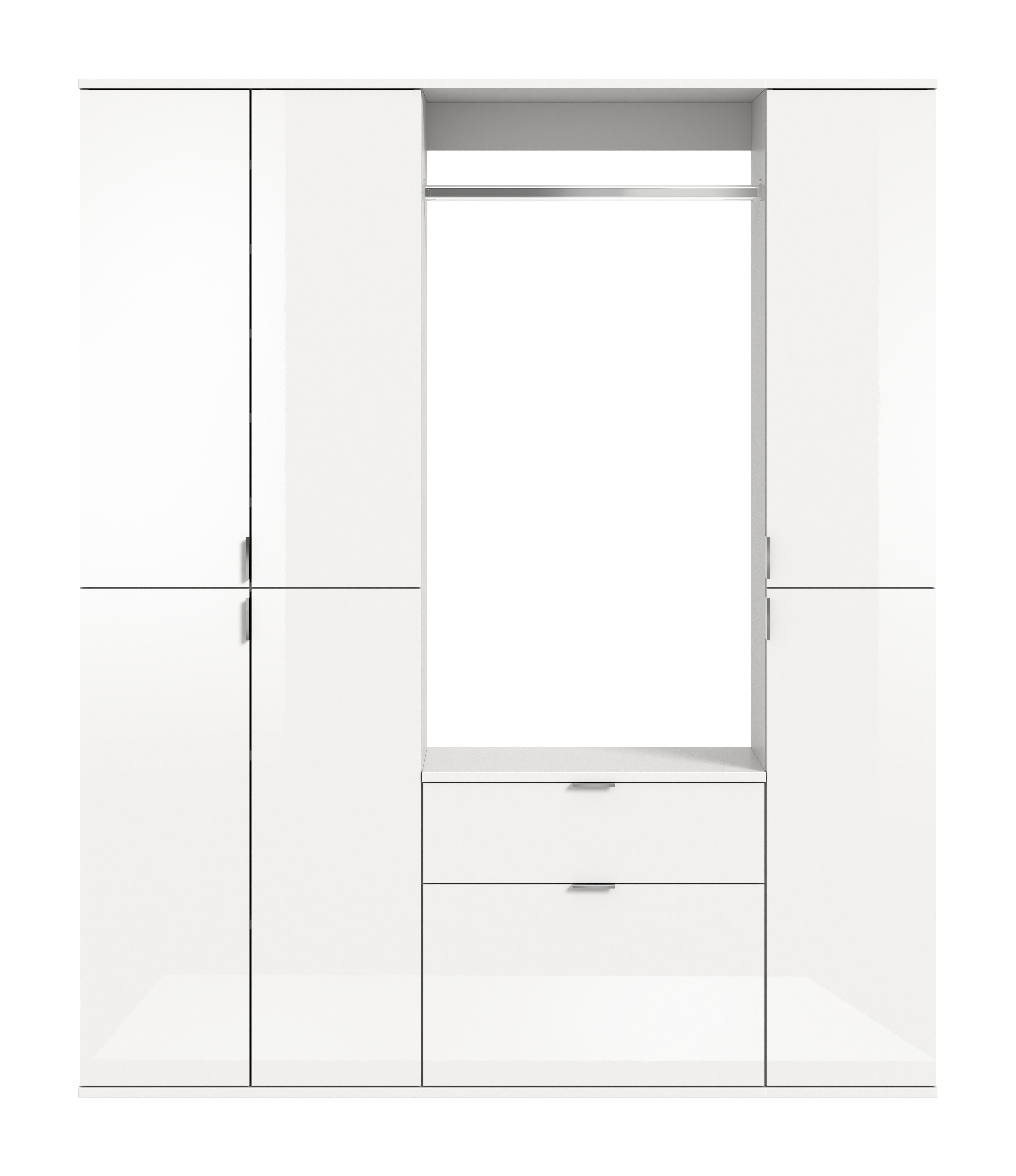 1 armoire d’entrée comprenant 2 portes ton blanc ultra brillant, 7 tablettes amovibles, 1 tablette fixe et 1 barre de penderie