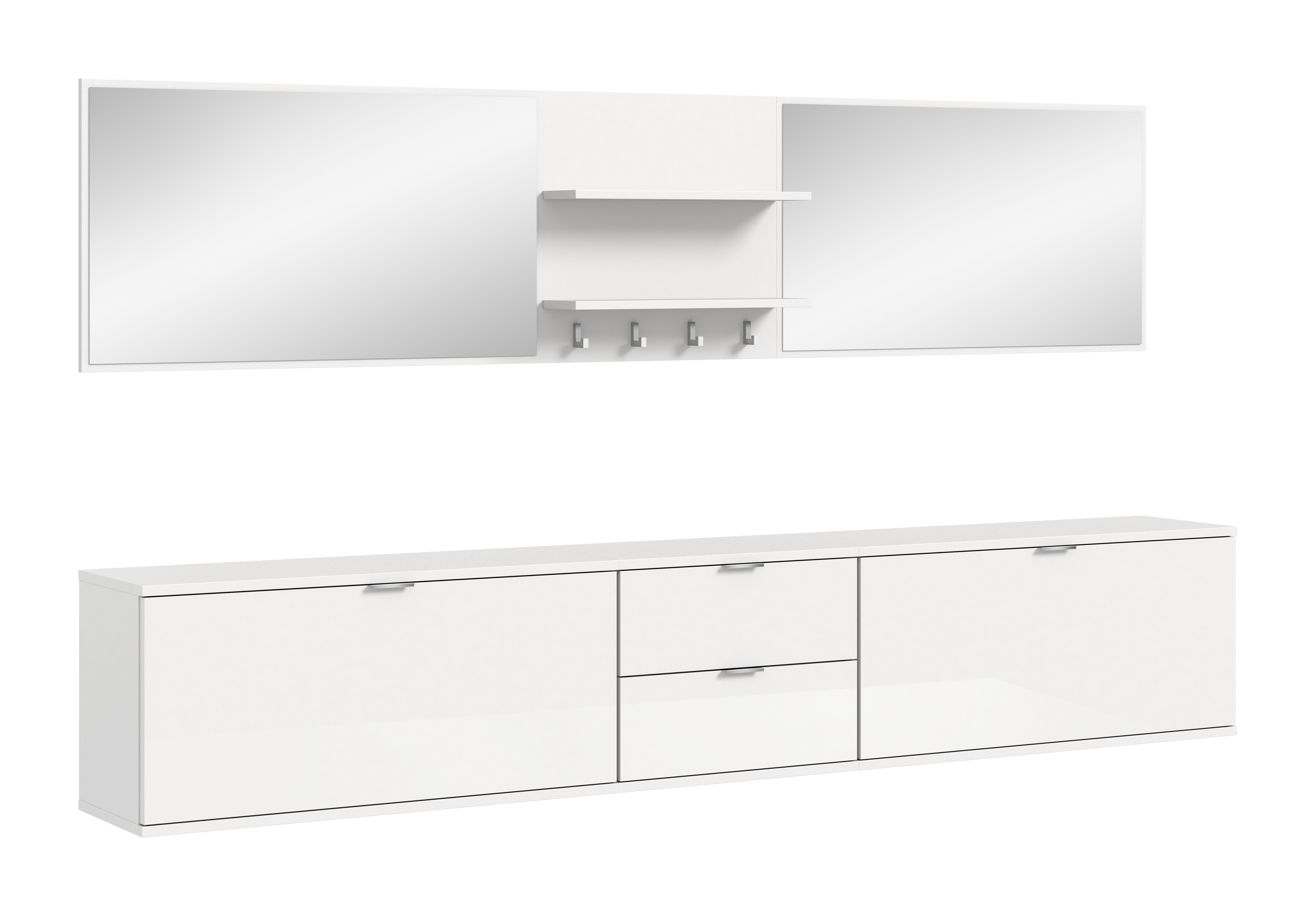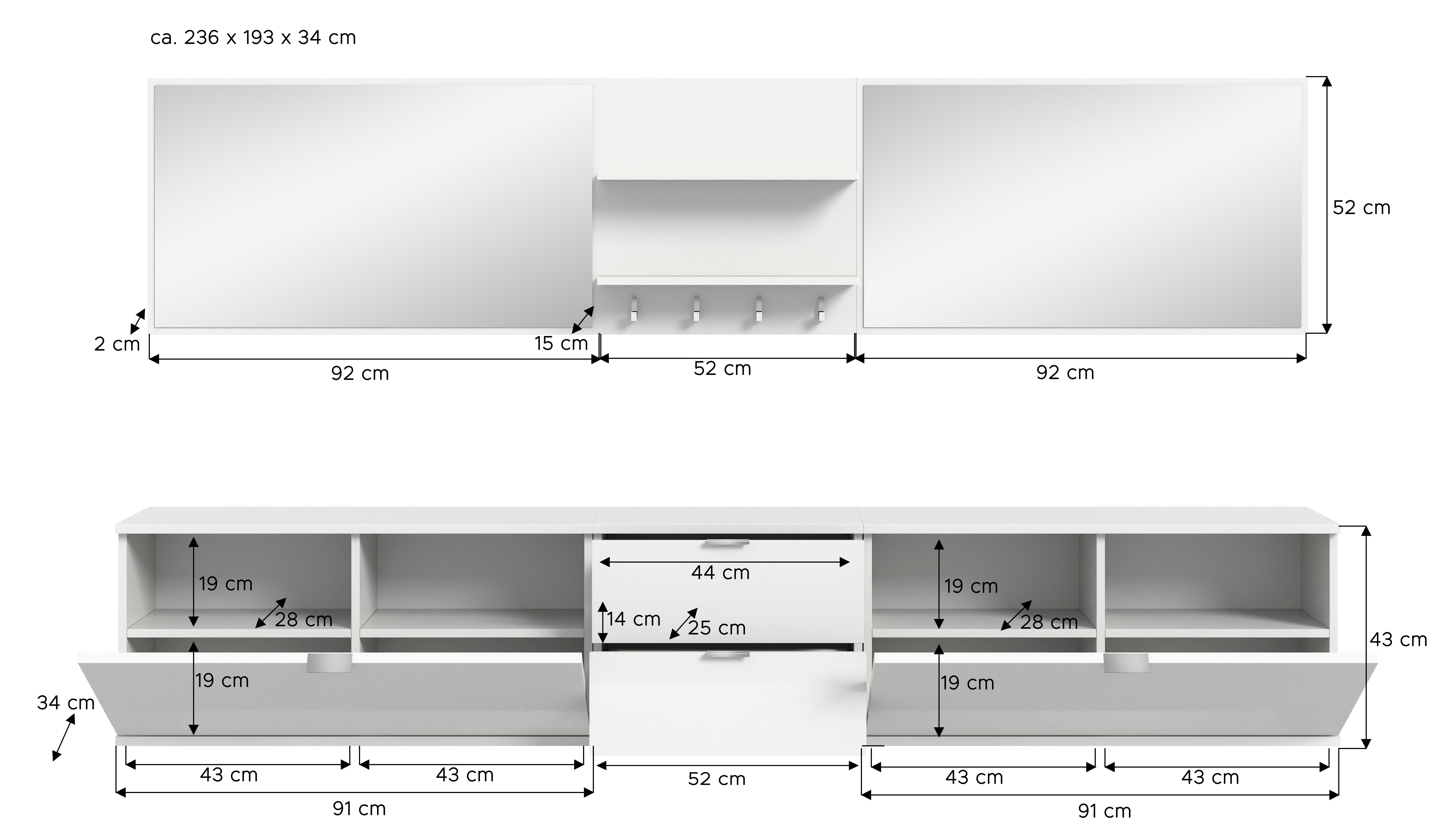 Apportez une touche moderne à votre entrée avec notre vestiaire combiné stylé ton blanc ultra brillant. Avec ses dimensions généreuses (L 236 cm x H 191 cm x P 37 cm), cet ensemble offre un vaste espace de rangement au design élégant qui rehausse l’allure du couloir. Il comprend deux bancs avec abattants offrant un espace suffisant pour les chaussures et accessoires. Un troisième banc avec tiroirs vient compléter l’ensemble pour encore plus de rangement et de confort. Deux grands miroirs agrandissent visuellement l’espace tout en vous permettant de vérifier votre tenue avant de quitter la maison. Le panneau mural élégant complète parfaitement ce vestiaire et permet de suspendre vestes et sacs de manière ordonnée. La finition ton blanc ultra brillant reflète la lumière et crée une ambiance claire et accueillante. Profitez de tous les atouts de cet ensemble bien pensé pour combiner ordre et style dans votre intérieur : la solution parfaite pour les familles et les intérieurs contemporains. Transformez votre entrée en un espace à la fois fonctionnel et esthétique !