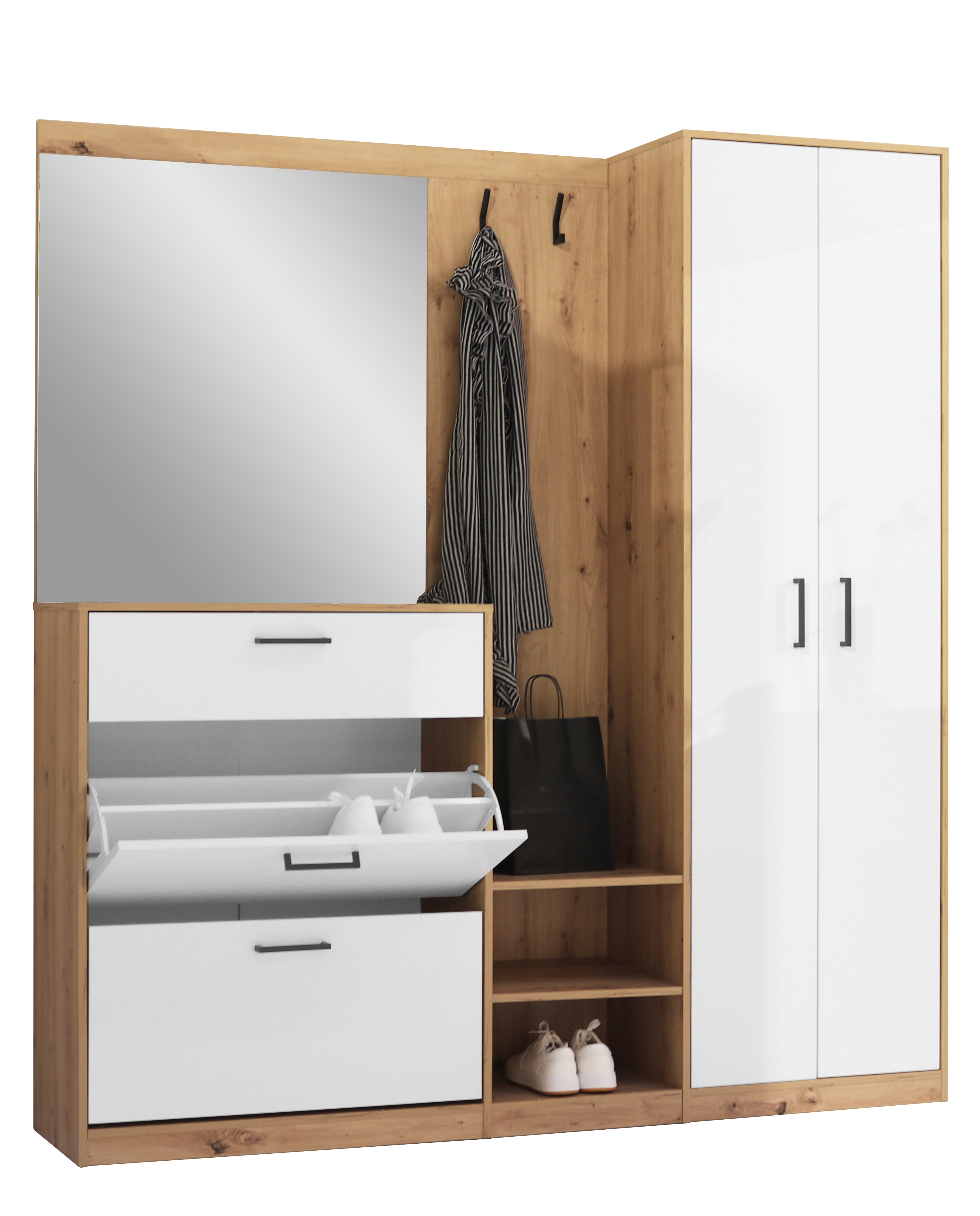 1 meuble à chaussures avec 1 tiroir et 2 abattants avec double casier de rangement pour env. 12-14 paires de chaussures