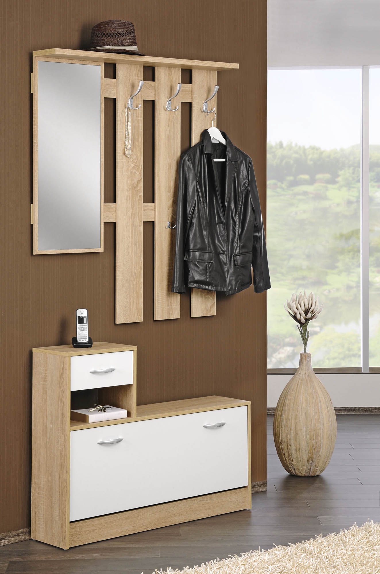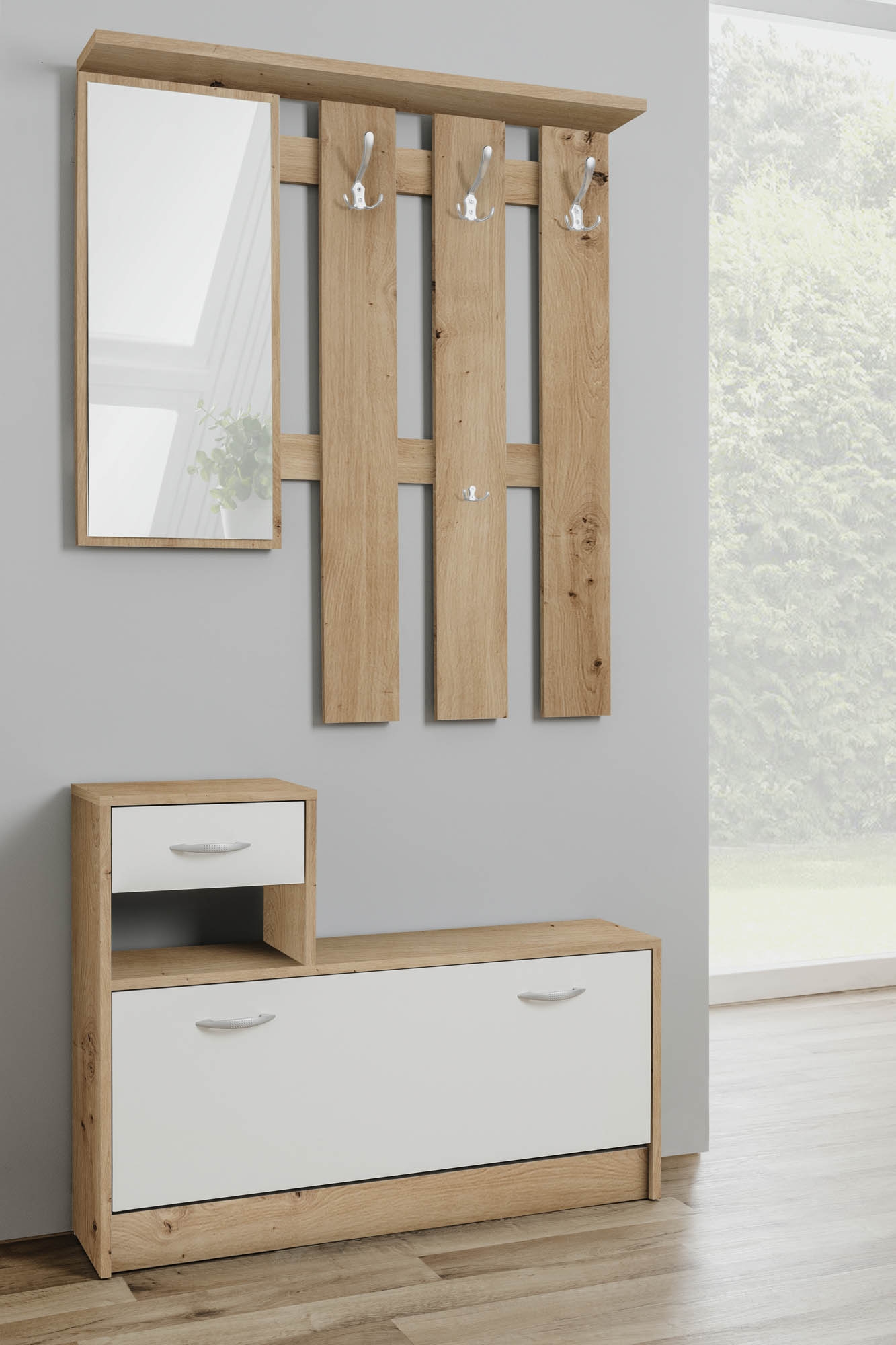 Cette garde-robe fonctionnelle en imitation bois de chêne Artisan combinée à des façades blanches offre une solution pratique pour le couloir ou l'entrée. L'ensemble se compose de deux éléments : un panneau mural avec miroir, porte-chapeaux et trois patères, ainsi qu'un élément de rangement avec tiroir, compartiment ouvert et bac à chaussures. Les surfaces faciles d'entretien sont résistantes à l'usure quotidienne et se nettoient facilement. La combinaison d'un compartiment ouvert et d'un espace de rangement fermé permet de maintenir l'ordre dans un espace réduit. Idéal pour les ménages soucieux de leur budget qui recherchent une armoire peu encombrante et pratique à la fois.