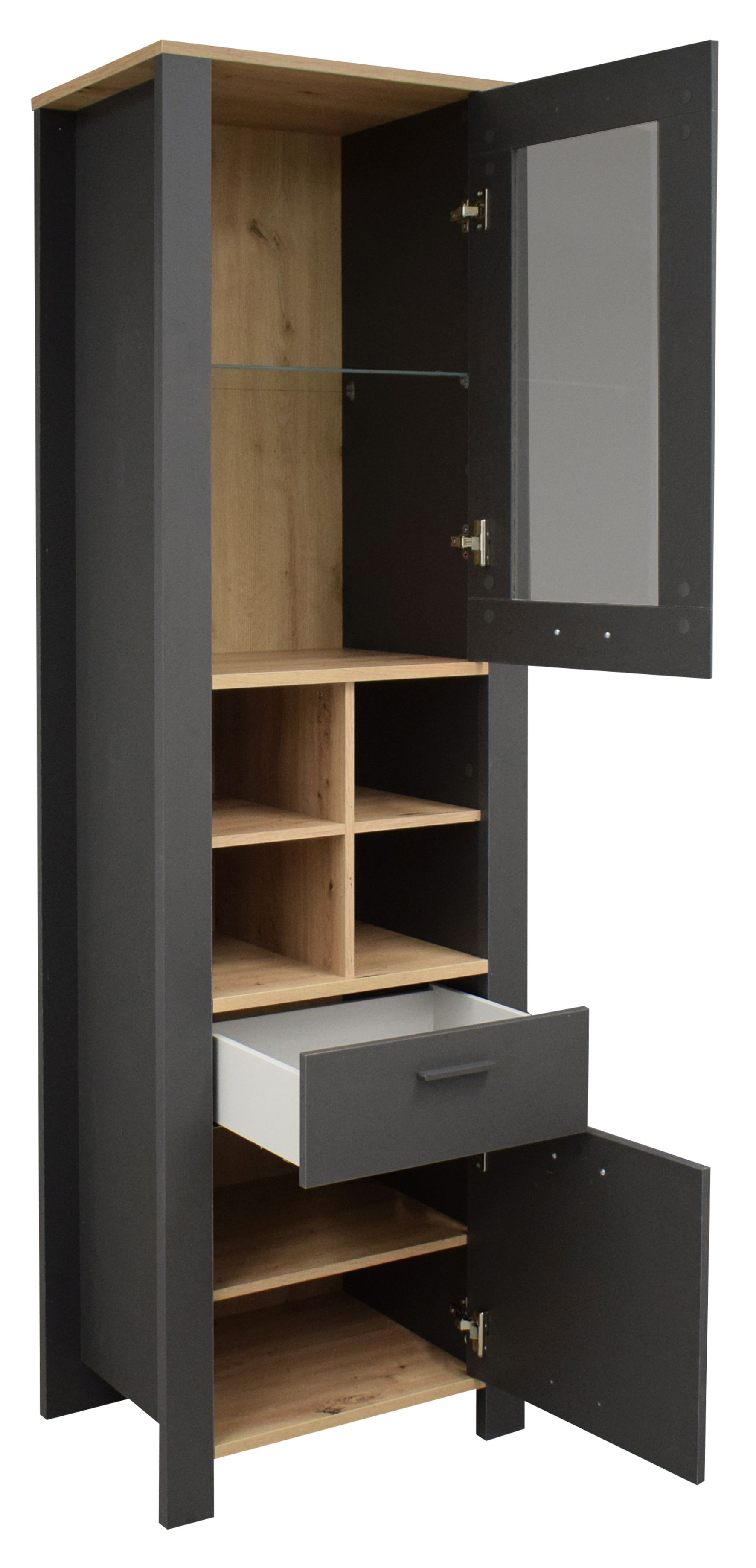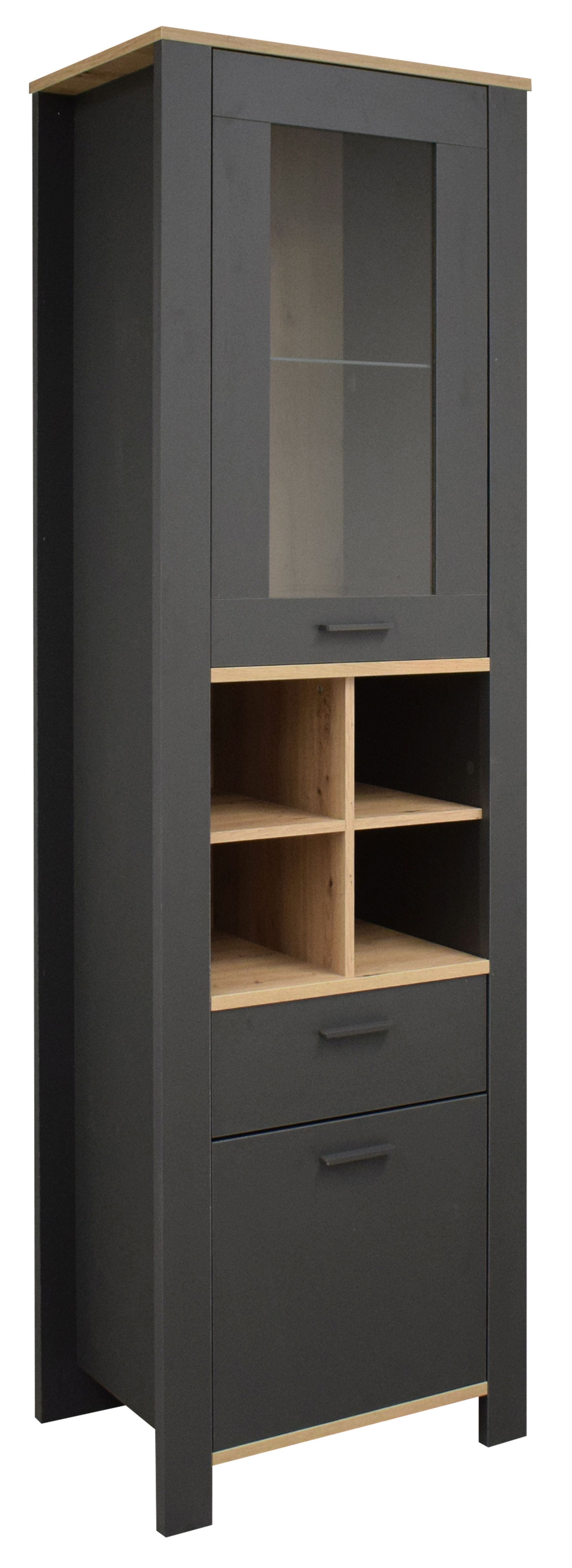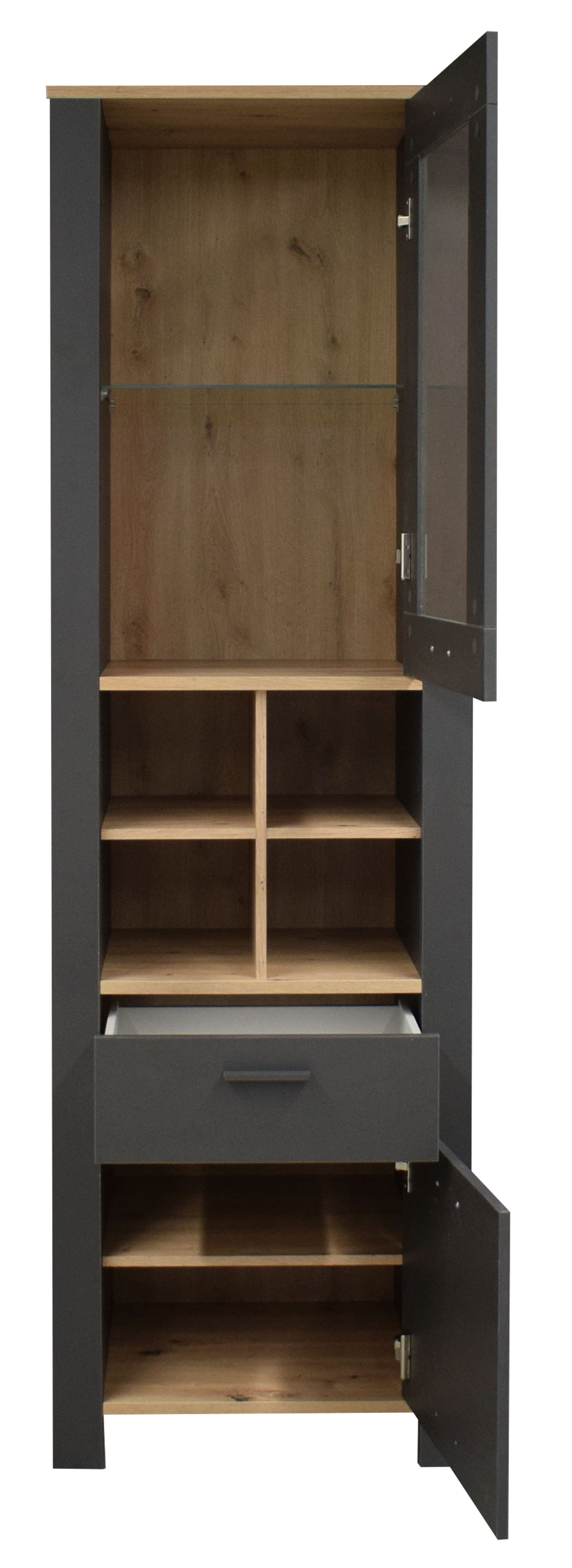 laque ton anthracite mat et décor chêne noueux / verre transparent